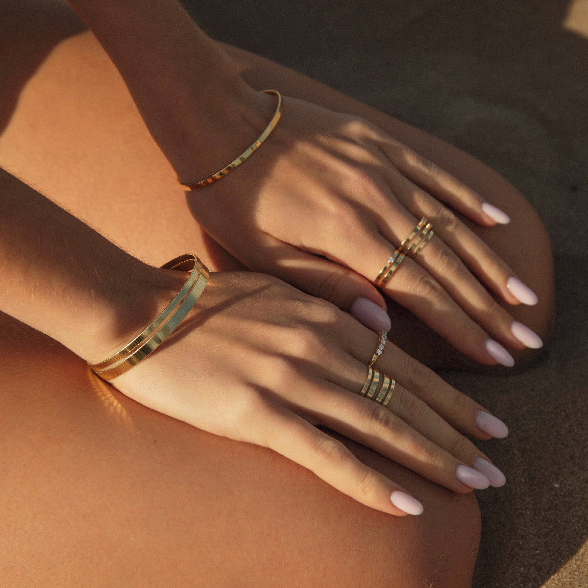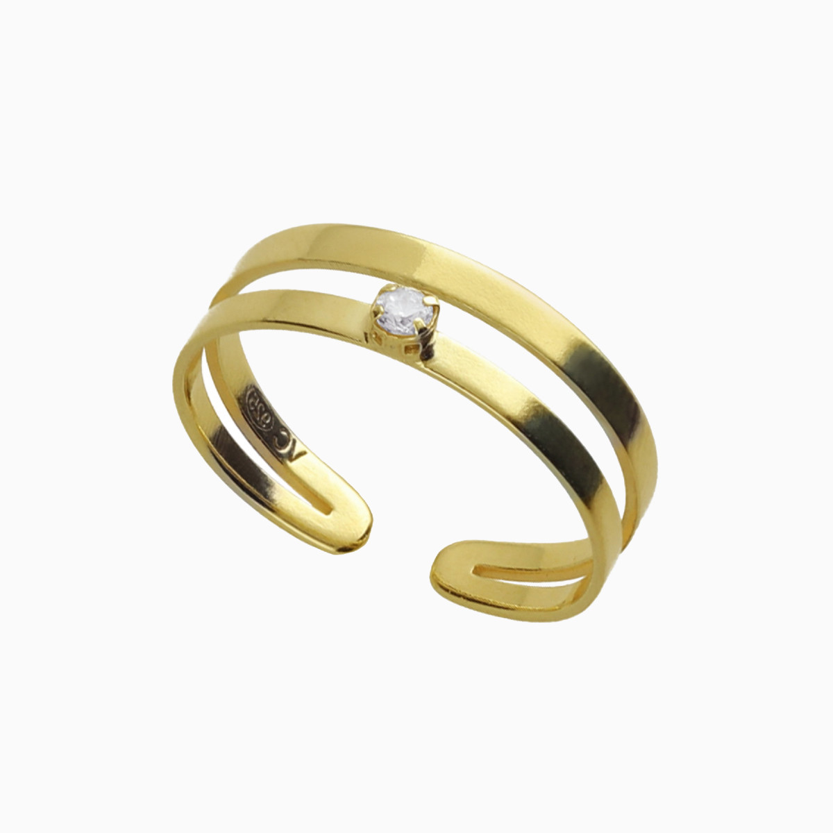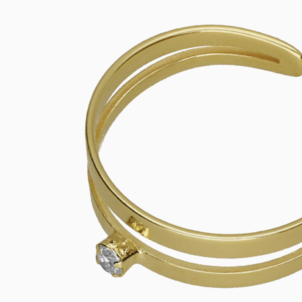 Redefine elegance with a touch of brilliance from Waves. Discover the allure of stacked rings, masterfully designed as a single yellow gold plated piece. A clear stone adorns this unique creation, reflecting your radiant personality and enhancing your beauty with every gesture.