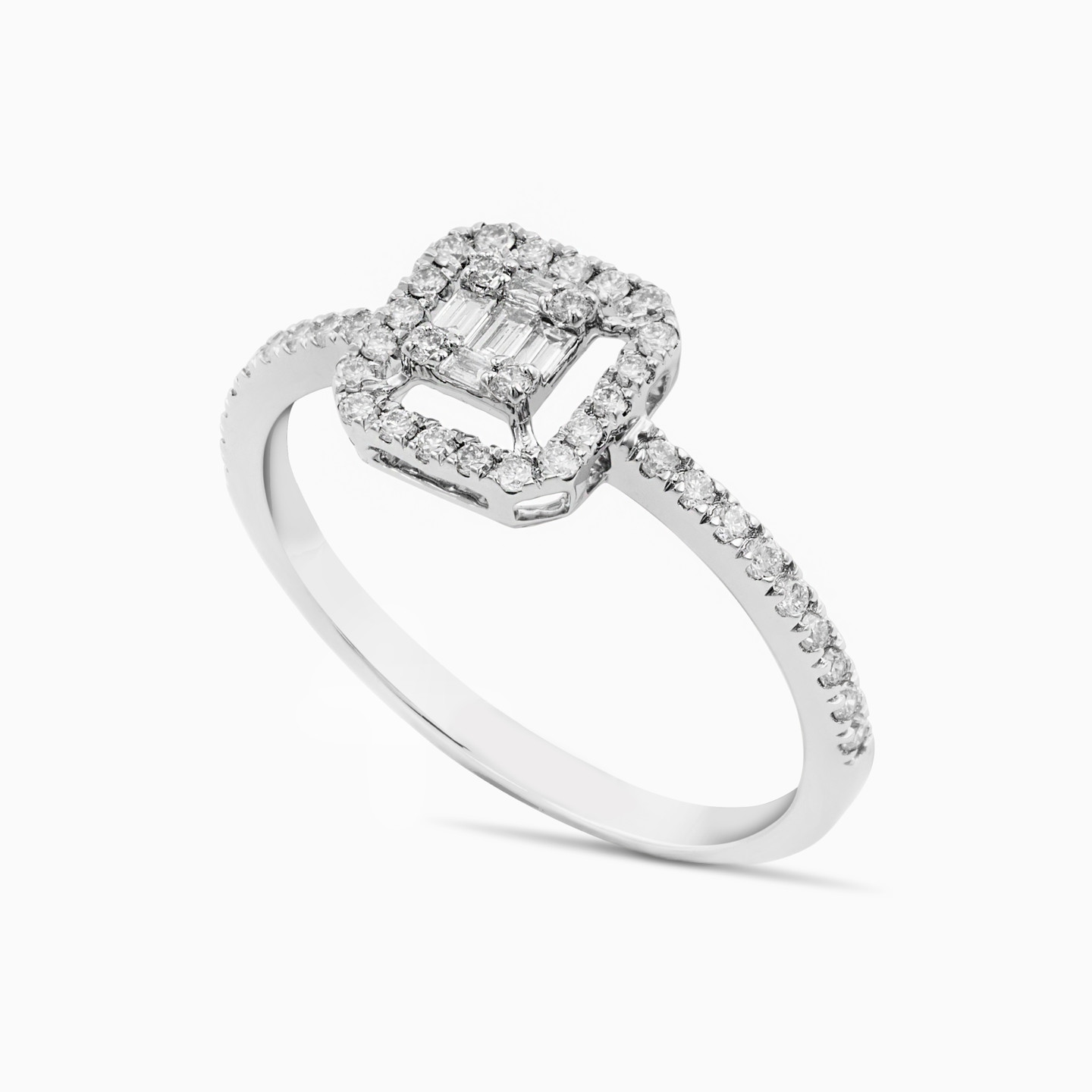 Make a graceful impression effortlessly by wearing this eye-catching diamond ring from L'azurde Diamonds. Beautifully crafted in lustrous 18-karat white gold, this gorgeous ring features a chic square motif of baguette and round diamonds in an elegant diamond frame, with additional diamonds sparkling along the ring's shank. We love how this simple accessory can instantly elevate your daytime and evening outfits, bringing a touch of glamorous sparkle to any outing.