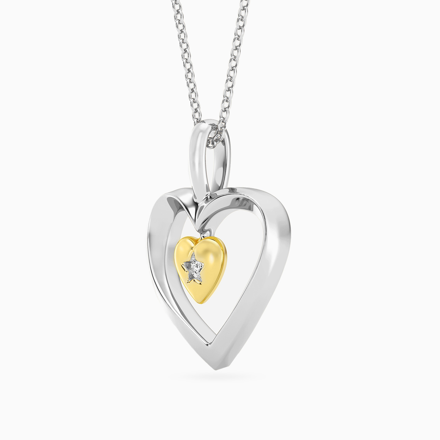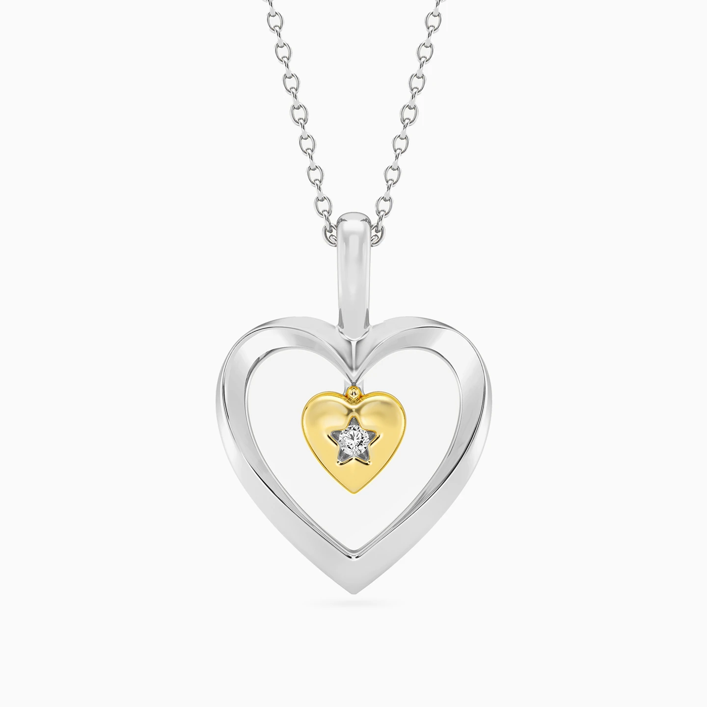 Discover affordable glamour and timeless style with this piece from Waves! This sterling silver necklace radiates romantic charm with an open heart pendant encircling a smaller golden heart, which gently holds a brilliant lab-grown diamond at its center. Perfect for those who adore heartfelt designs and subtle elegance, it’s a beautiful piece to add a touch of love and sparkle to any look.
