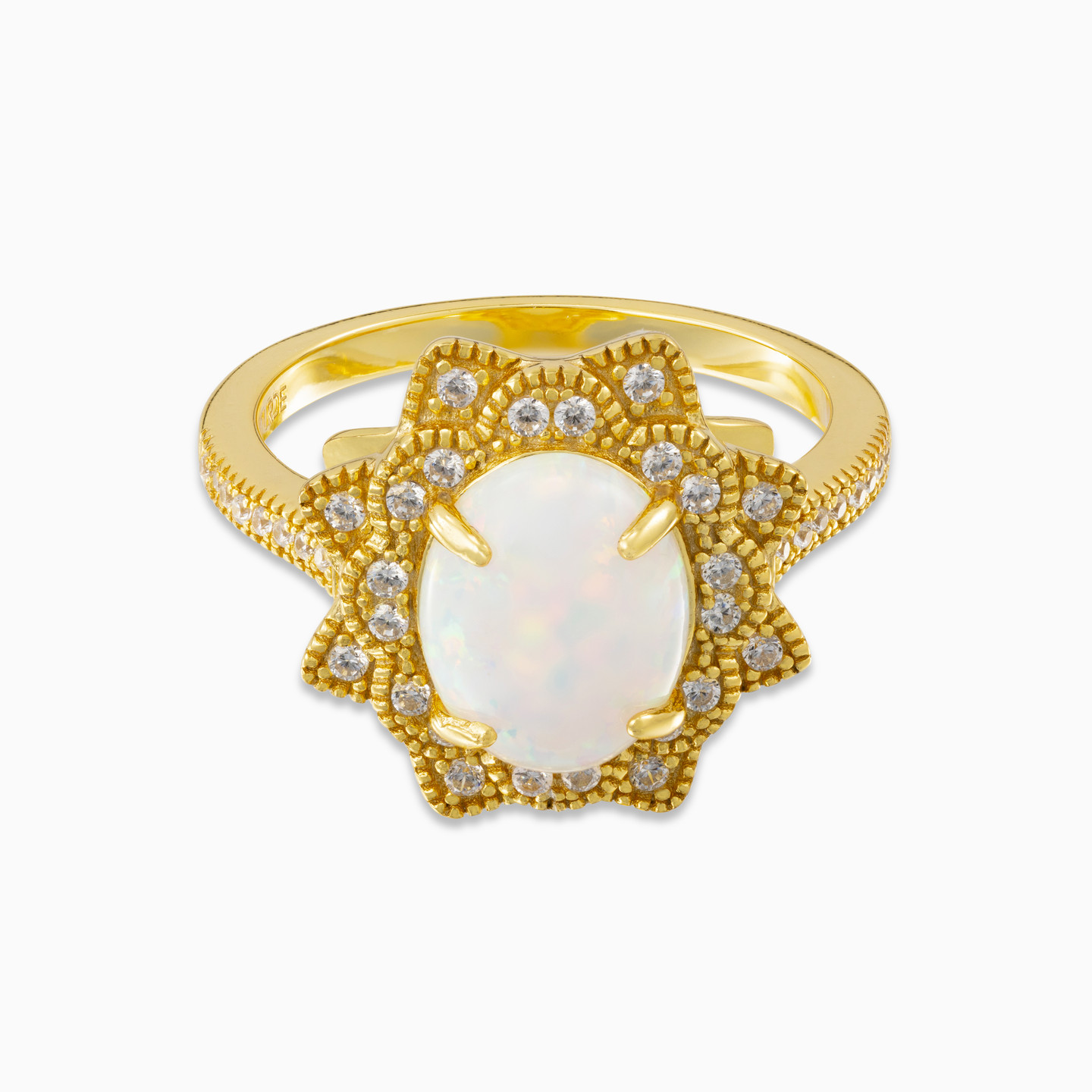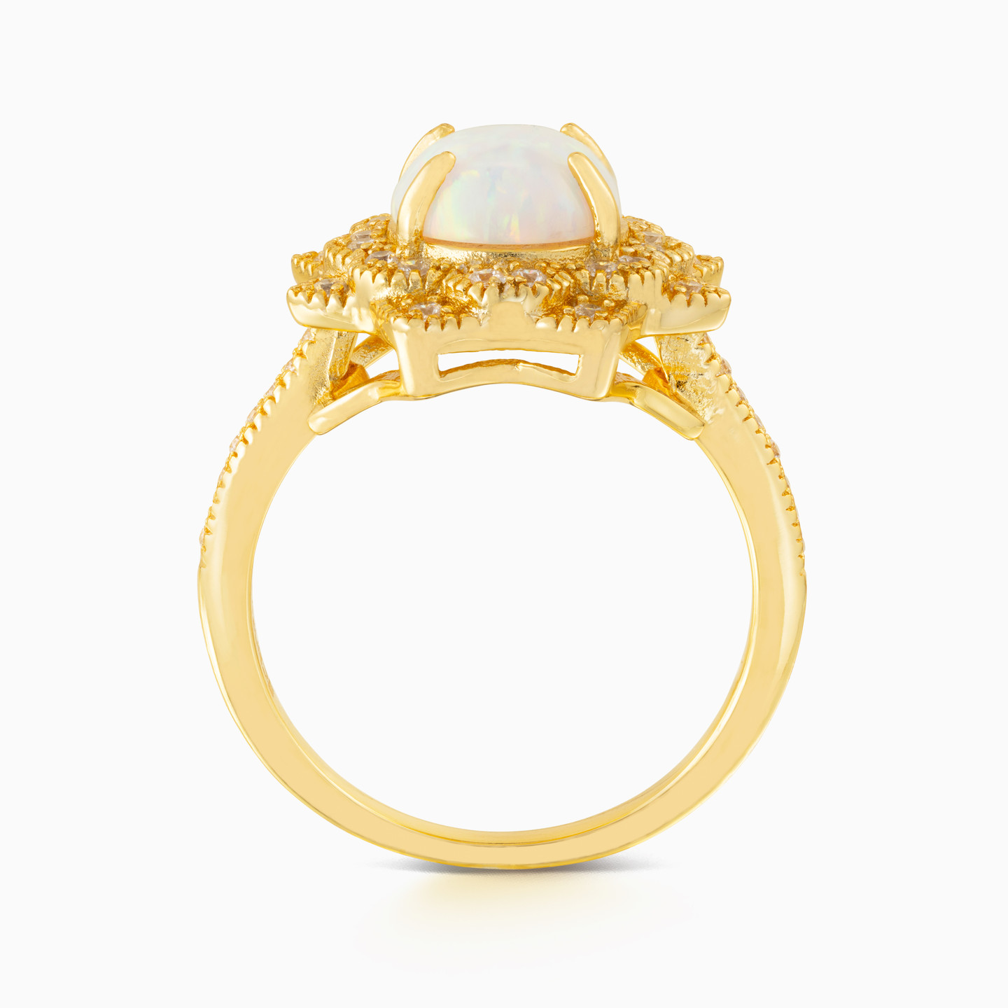 With a prong set colored stone at the center of a floral motif, this mesmerizing yellow gold plated ring is bound to capture attention. It sparkles with colored Stones on the flower petals, adding to its sophisticated feminine style.