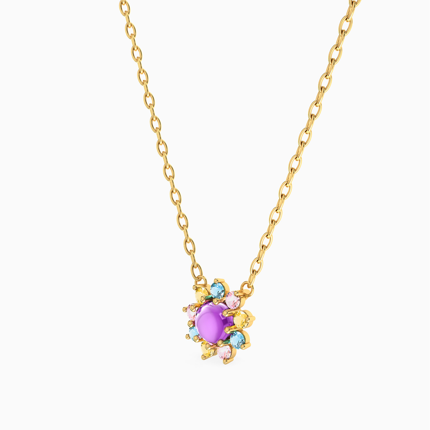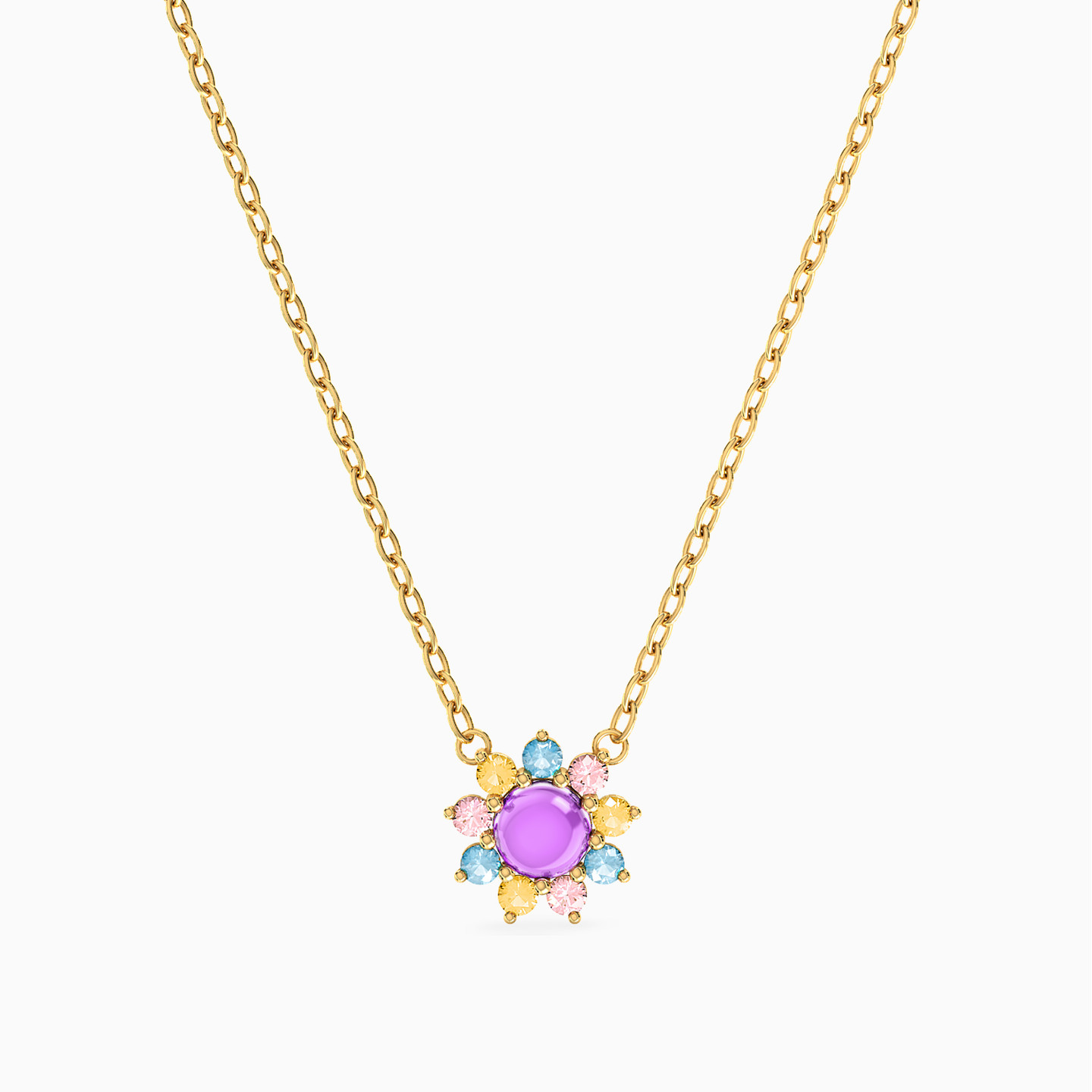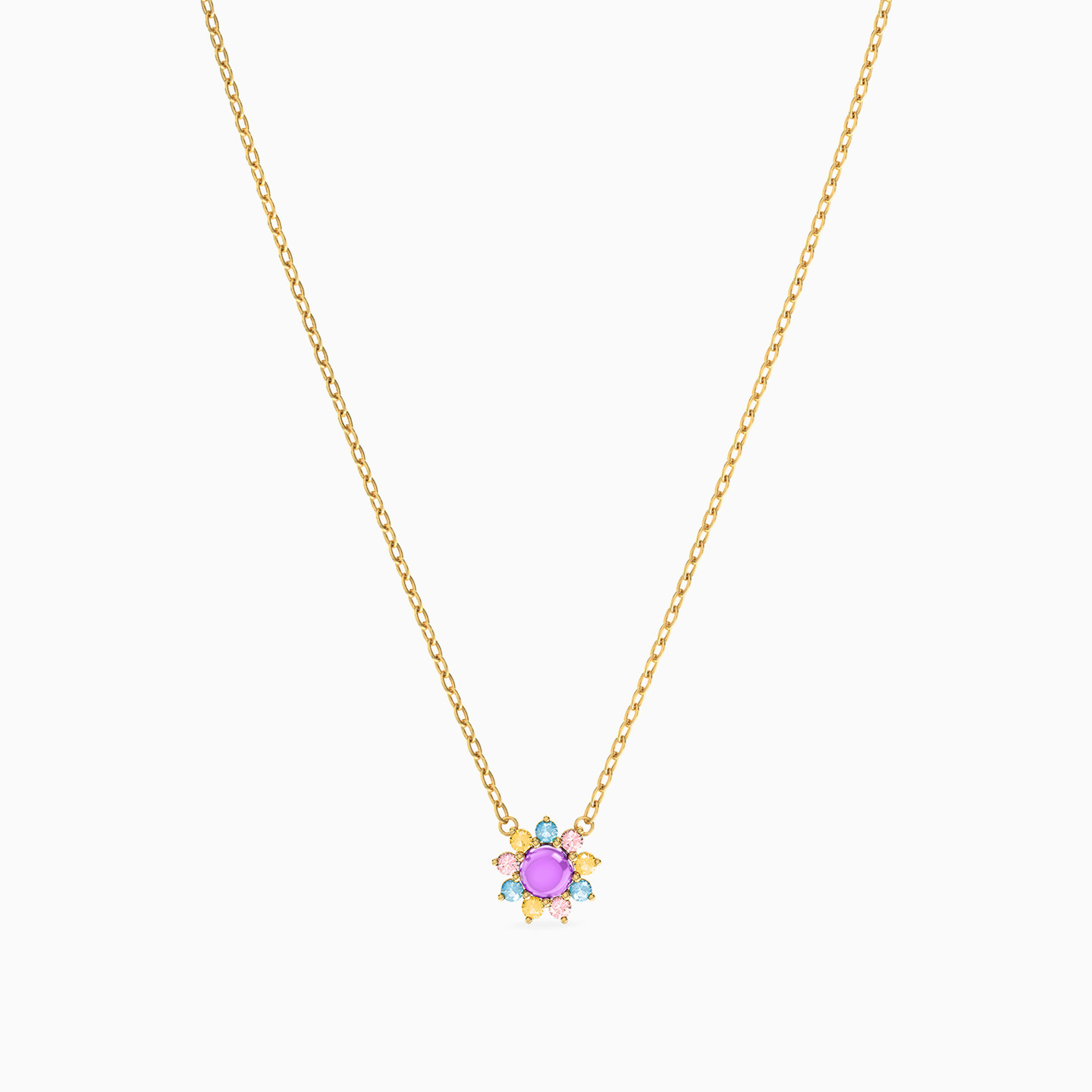 This enchanting 18-karat yellow gold pendant necklace from Instyle is a radiant tribute to the beauty and magic of blooming flowers. Adorned with a delicate chain, this necklace showcases a mesmerizing floral pendant with a round colored stone in the center framed by a delicate dance of round-shaped colored stones, creating a dazzling blossom of nature's elegance. Celebrate nature's grace and beauty every time you wear this beauty!
