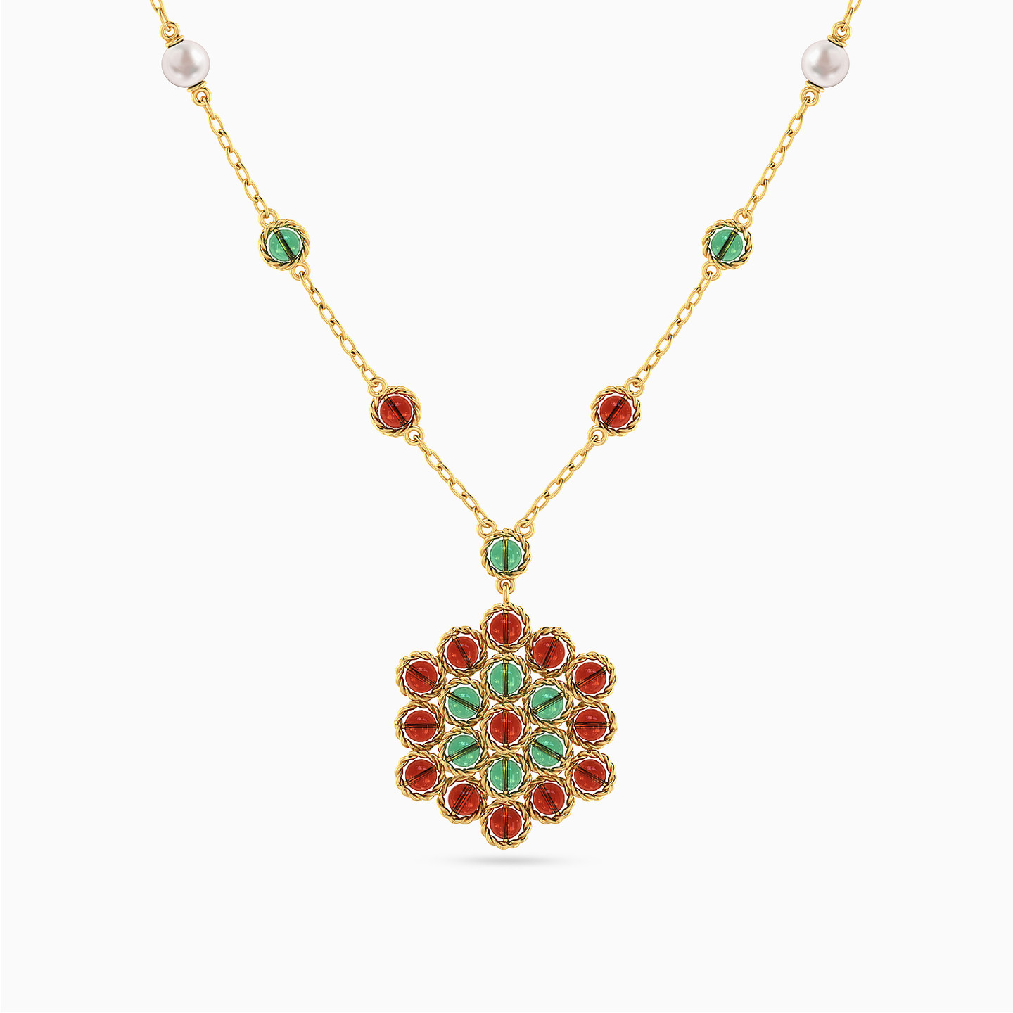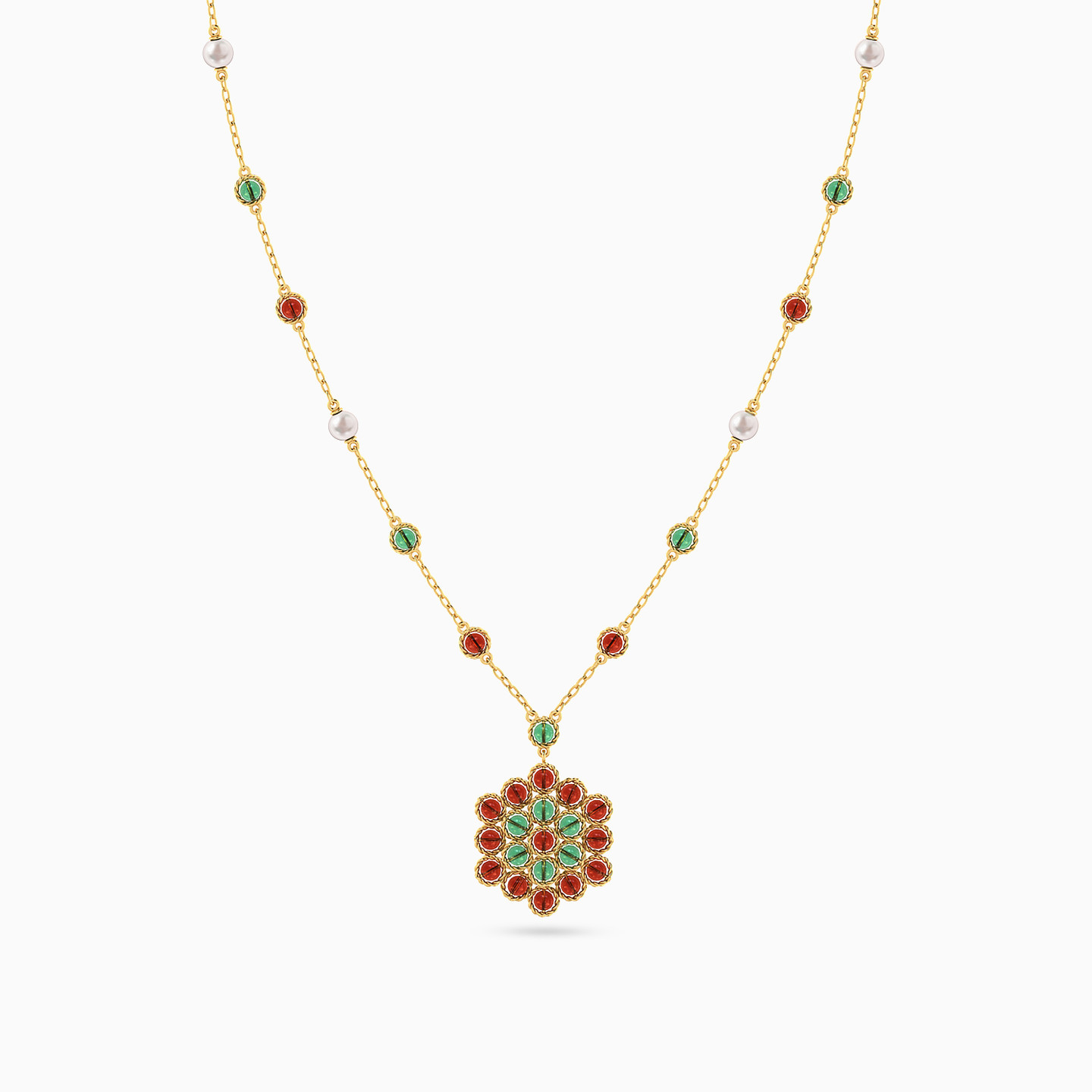 Introducing an exquisite 18-karat yellow gold pendant necklace from L'azurde Instyle, a radiant gem that effortlessly fuses tradition and contemporary style. The dainty links chain is adorned with meticulously spaced round-shaped colored stones, each nestled within a braided frame. The pièce de résistance is the captivating floral pendant made from an intricate arrangement of round-shaped colored stones meticulously nestled within a braided frame, blossoming into a stunning flower. This pendant necklace is all about refined elegance and makes the perfect choice to complete your Ramadan ensemble.