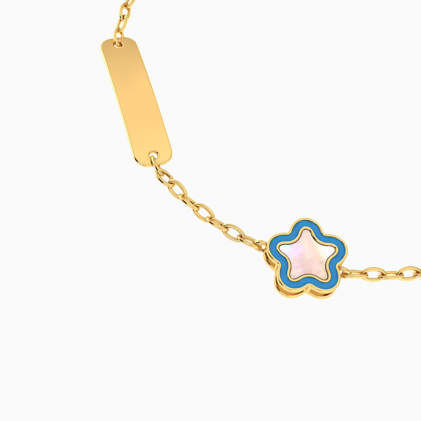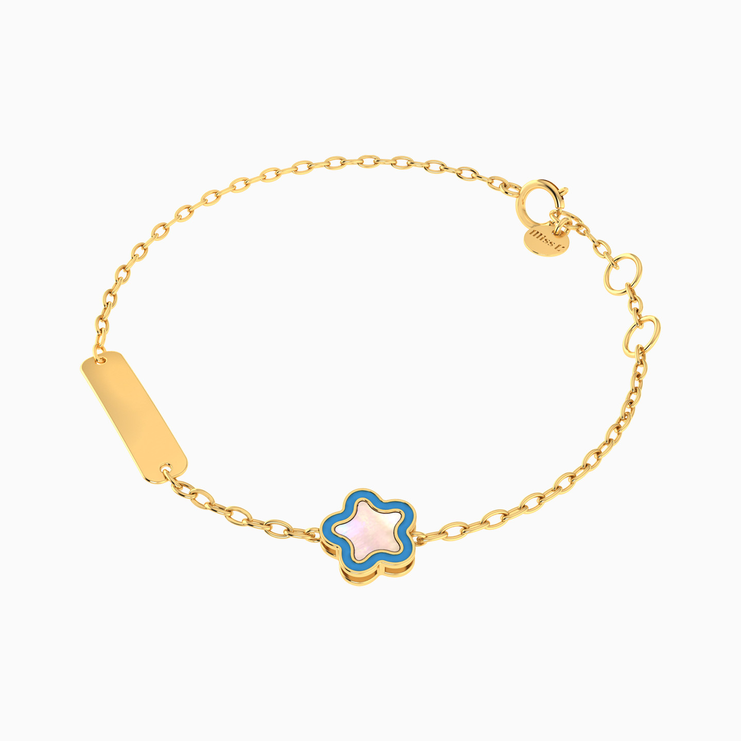 A little star just for her. This Miss L’ bracelet for kids features a glowing mother-of-pearl star with a bright blue enamel outline, alongside a polished gold plate perfect for engraving. A sweet and thoughtful keepsake for the little star in your life.