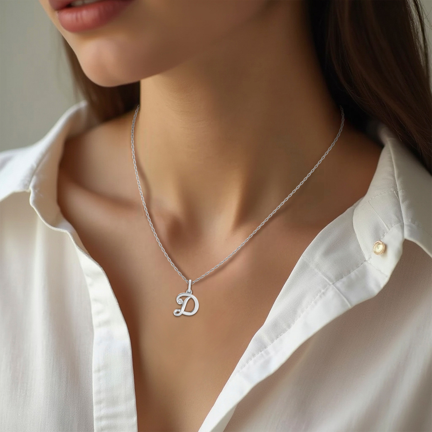 Discover affordable glamour and timeless style with this piece from Waves! This sterling silver necklace features a delicate pendant shaped as the elegant letter “D” suspended gracefully along a fine chain, and accented with a shimmering lab-grown diamond for a touch of modern sparkle. Perfect for those who adore personalized jewelry and refined elegance, it’s a beautiful way to carry a piece of your identity close to your heart.