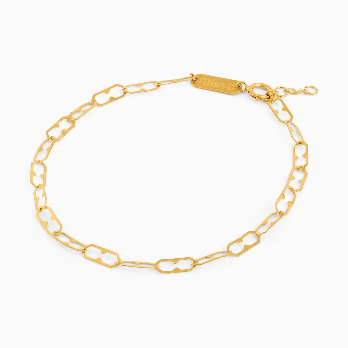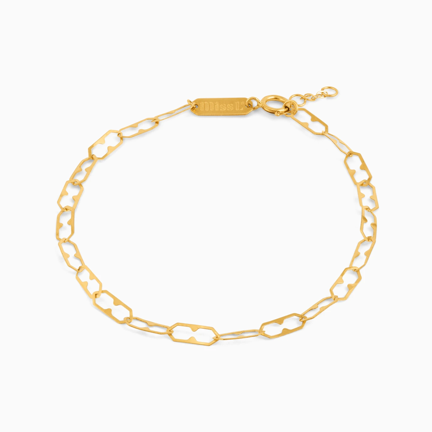 Simplicity that speaks volumes. This Miss L’ bracelet features open gold links in a soft geometric pattern—light, airy, and effortlessly elegant. Its minimal design makes it perfect for layering or wearing solo as a subtle statement. A refined piece for everyday wear, or a graceful gift for someone who appreciates timeless beauty.