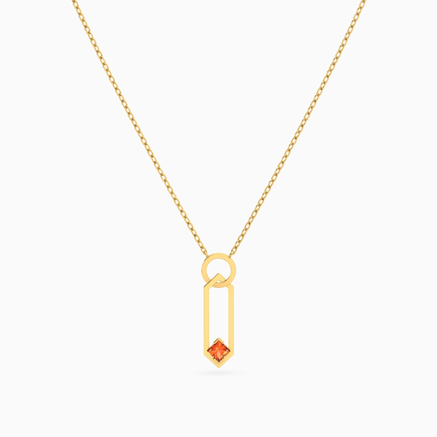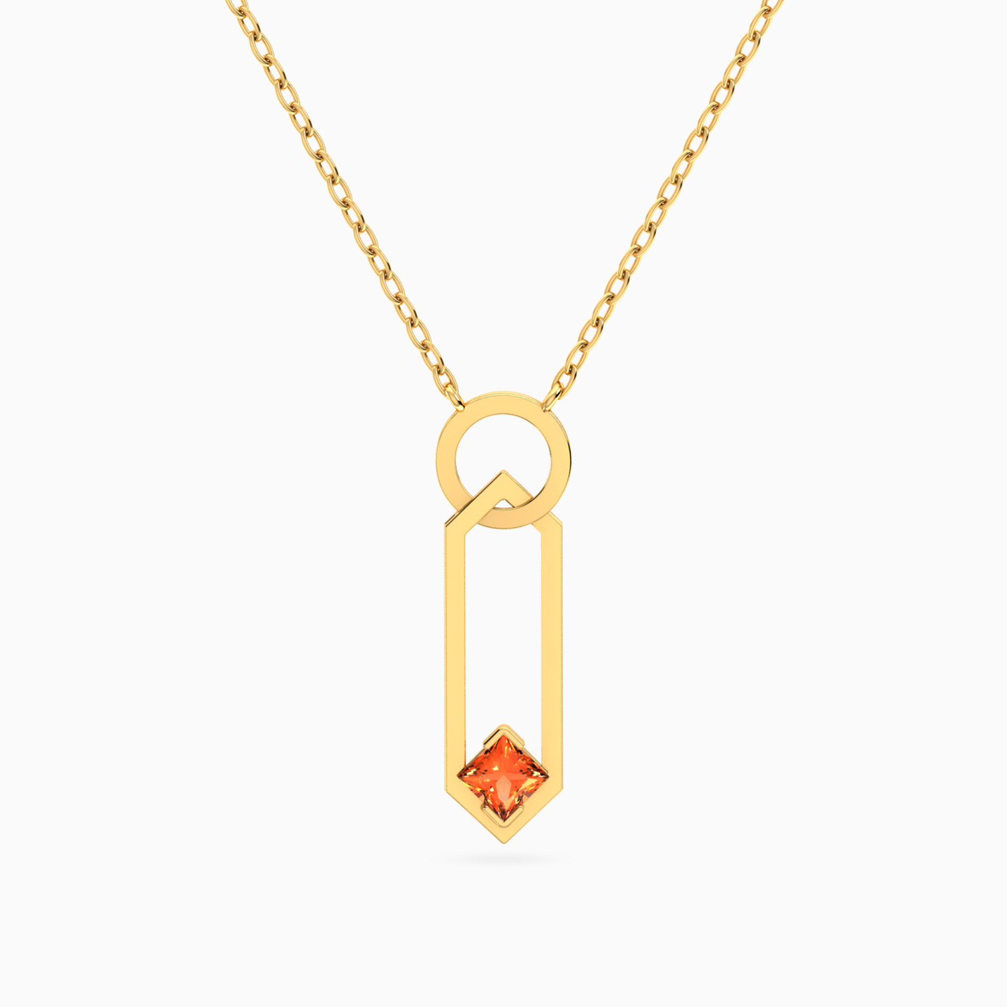 Show off your love for geometric shapes with this chic Necklace from L'azurde Instyle. Crafted from lustrous 18-karat yellow gold, this necklace features a classic links chain leading to an eye-catching drop pendant showcasing a circular frame linked to an elongated hexagon-shaped frame cradling a round-shaped colored stone set on the tip with chic triangle-shaped prongs. This geometric and minimal beauty is perfect for amping up the style quotient of your everyday outfits.