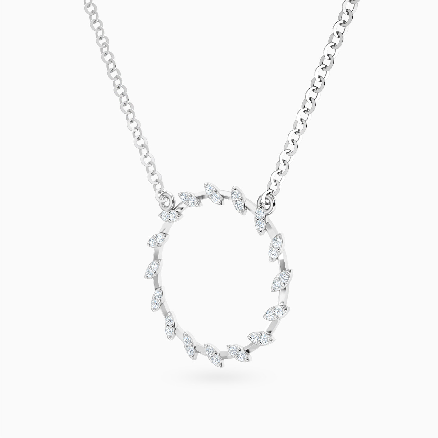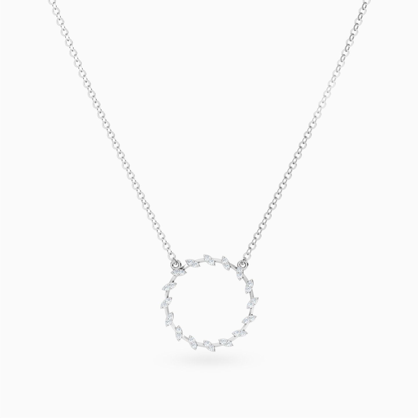 A circle of light and grace. This Lazurde Gold necklace crafted in white gold forms a delicate open circle adorned with marquise-shaped motifs, each shimmering with cubic zirconia stones like a leaf kissed by sunlight. Elegant and timeless, it’s a symbol of endless beauty—an heirloom piece that feels both modern and eternal.