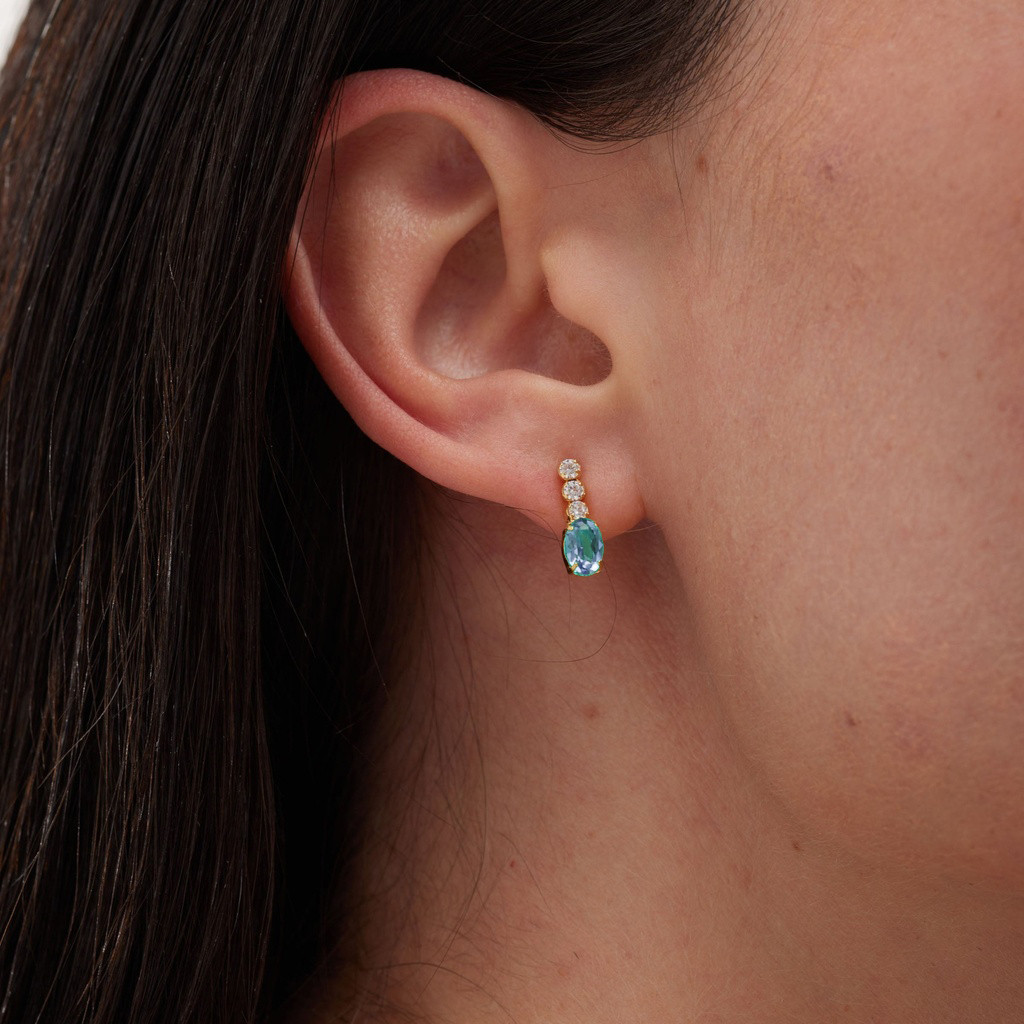 Effortless sparkle with a touch of nature. These Waves Earrings in sterling silver features a vertical design adorned with three shimmering cubic zirconia stones, leading to a soft aqua blue oval stone that catches the light beautifully. A delicate piece perfect for adding feminine charm to any look.