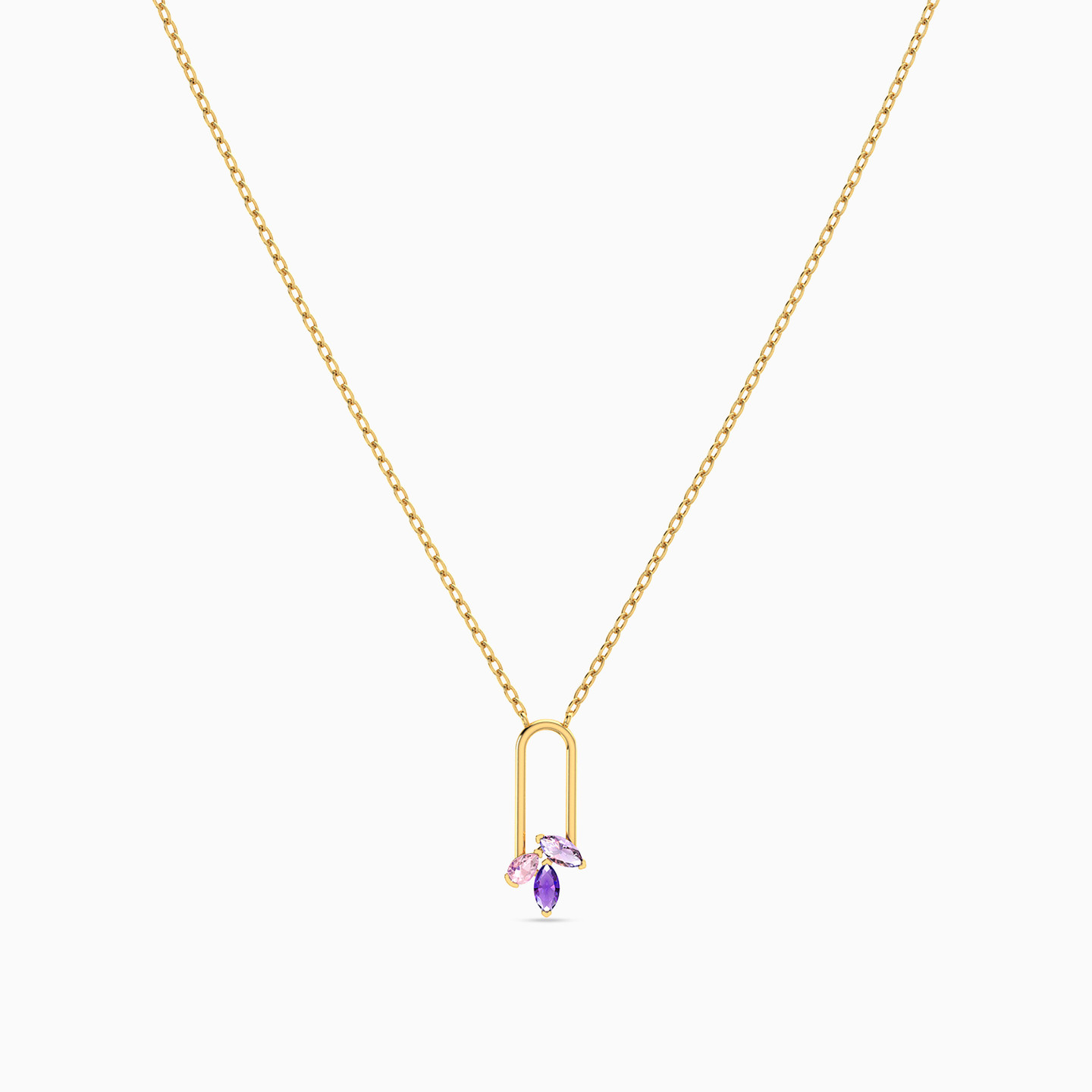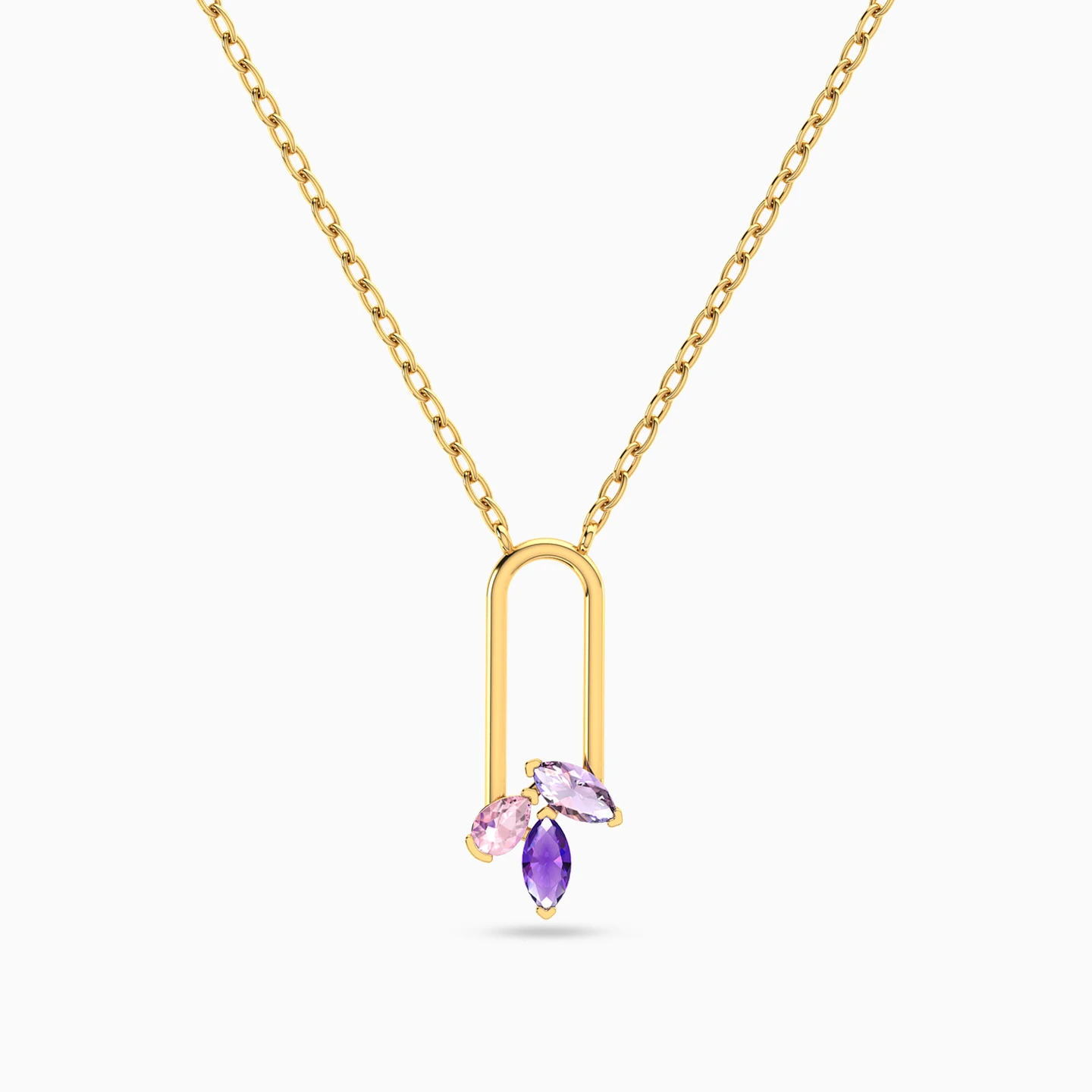 As elegant as it is feminine, this eye-catching necklace from Miss L’ is sure to become a wardrobe staple. The sleek and sophisticated design features an 18-karat yellow gold paperclip-style link at the center, accented with a trio of multi-shaped pink and purple stones. We recommend wearing this unique necklace with your favorite dress or sweater for a look that gets you noticed.