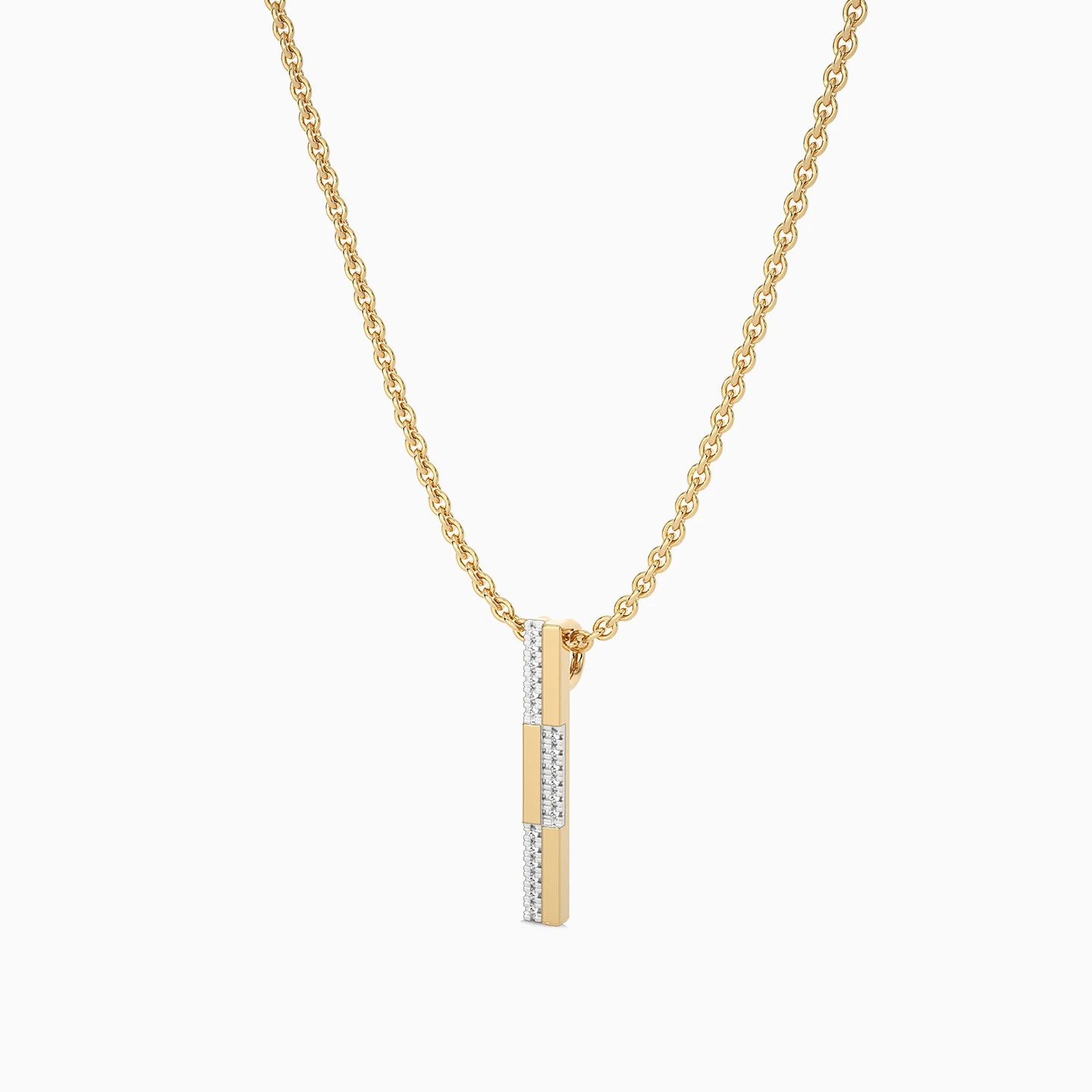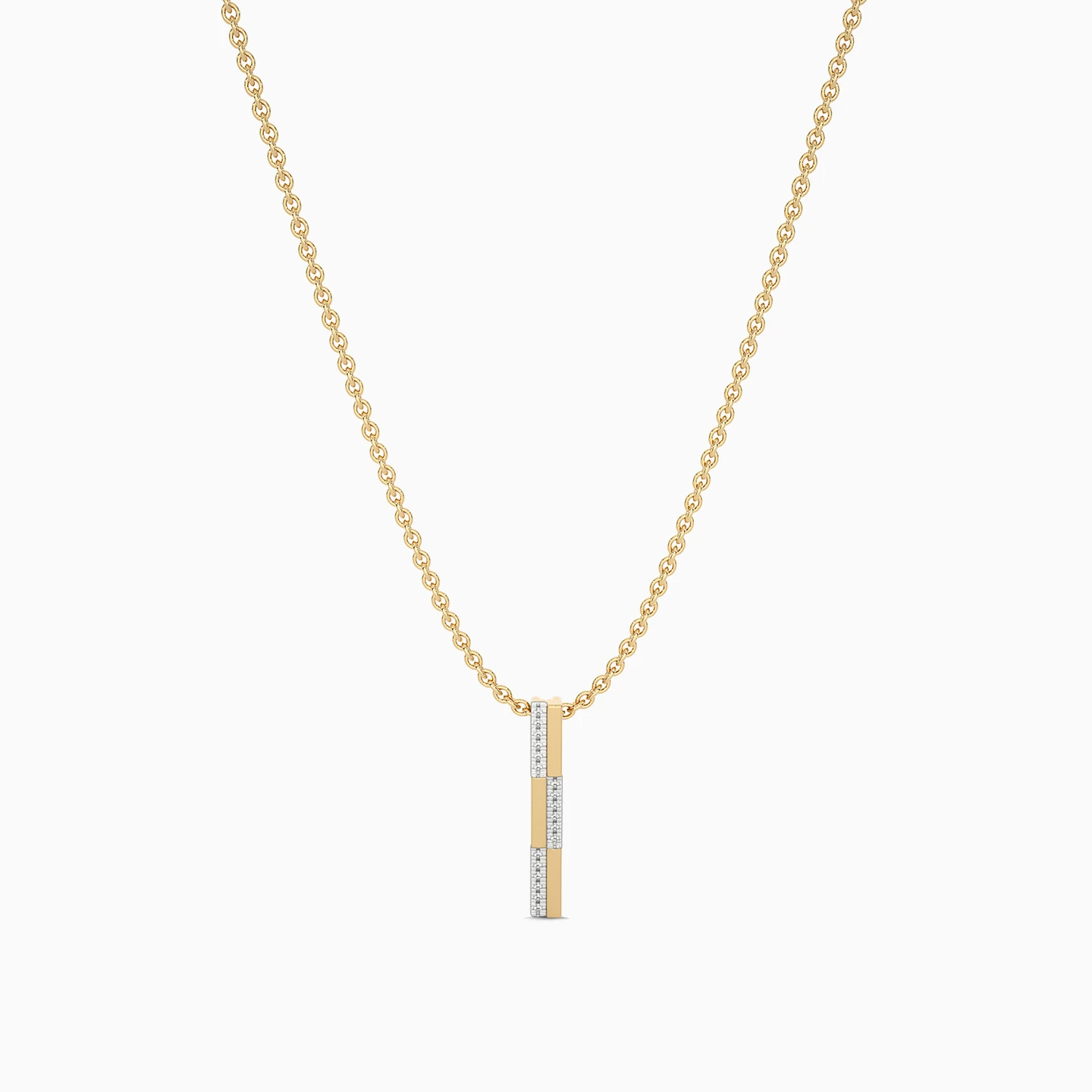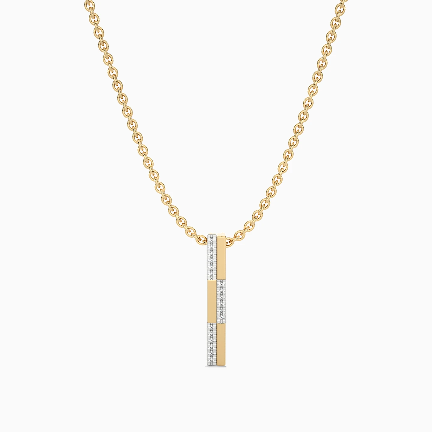 Sleek and contemporary, this chic pendant from L'azurde Diamonds is a jewelry box essential. Mixing 18-karat yellow gold bars with rows of dazzling diamonds in a staggered design, this stunning pendant adds the perfect touch to a business or formal look. We love this piece worn with the matching hoop earrings and ring to elevate formal wear with luxurious sparkle.