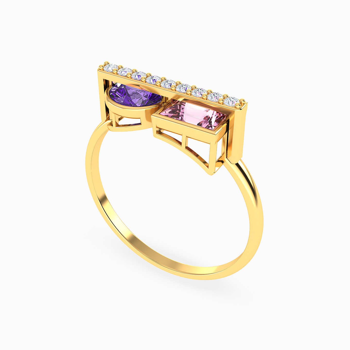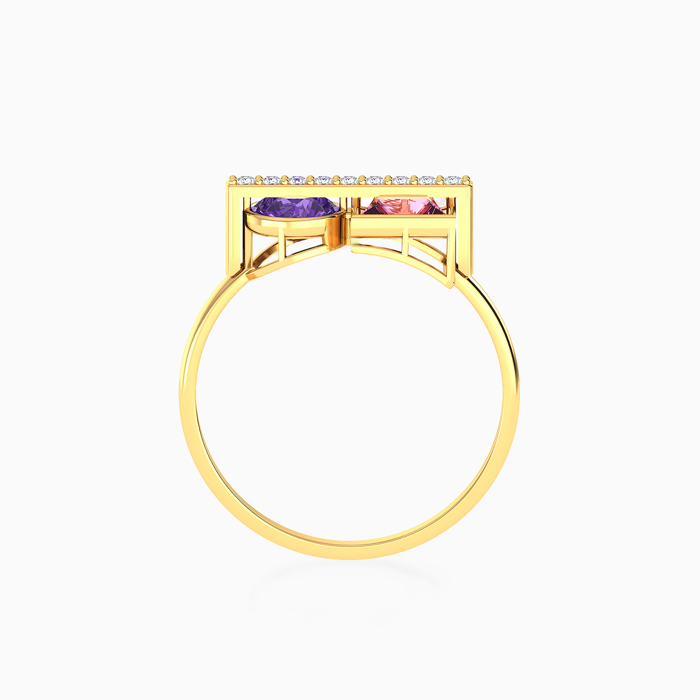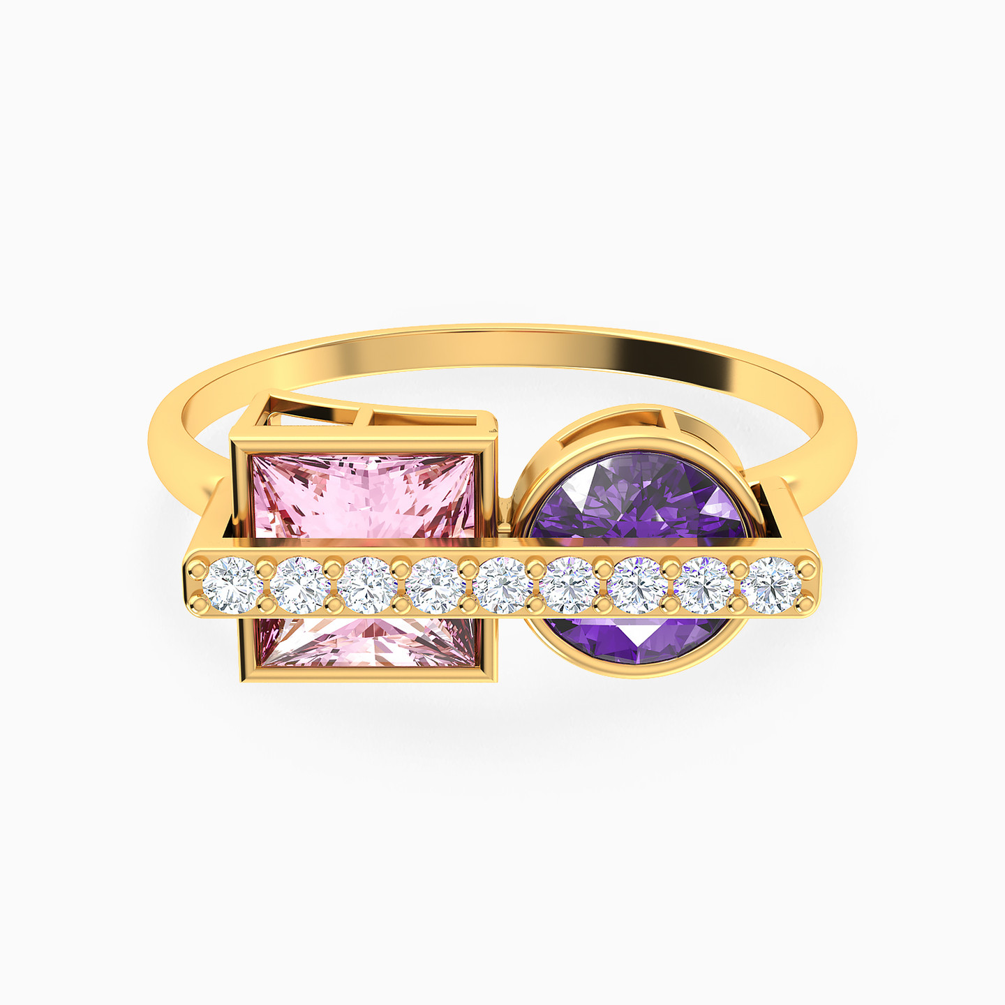 A modern duo of color and brilliance. This Instyle ring from the Chroma Collection features two stones—a pink square and a purple round stone—set side by side beneath a refined row of sparkling cubic zirconia. A stylish gift that radiates harmony, elegance, and individuality.