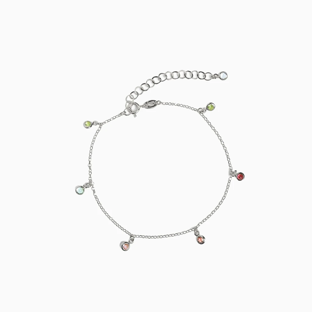 Playful elegance that dances with every step. This Waves anklet in yellow gold plating glimmers with delicate cubic zirconia charms in soft shades of blue, pink, and green. Each stone moves freely, catching the light with joyful ease. A delightful gift for those who carry sunshine wherever they go.