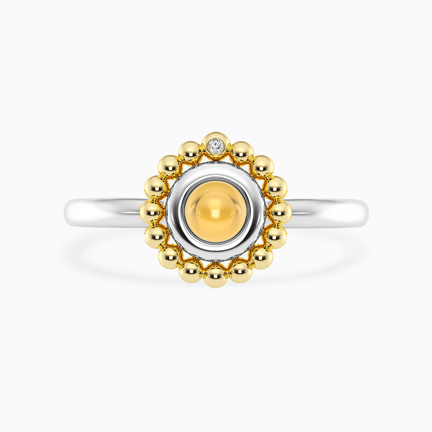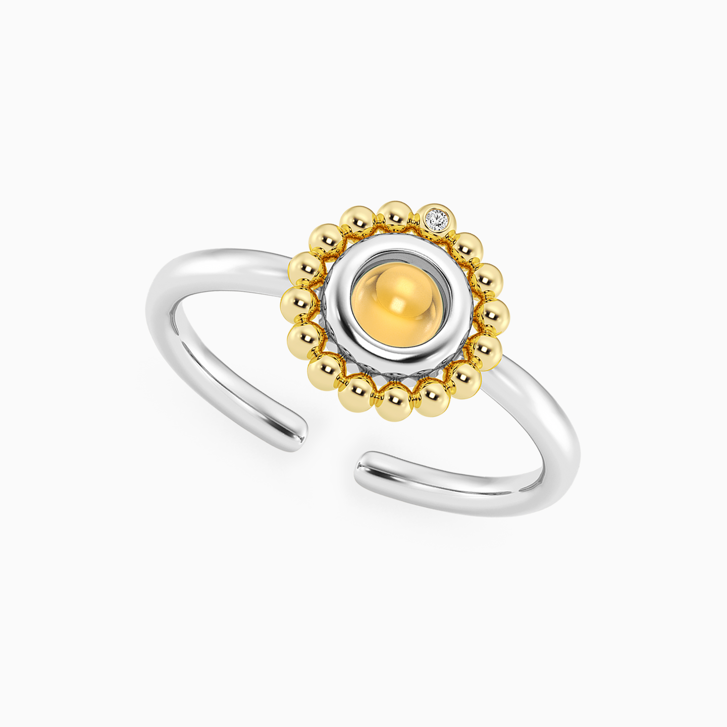 Discover affordable glamour and timeless style with this piece from Waves! This sterling silver open ring enchants with a round yellow center stone embraced by a halo of delicate golden beads, evoking a touch of vintage charm. A subtle lab-grown diamond sparkles above the design, adding a hint of modern luxury. Perfect for those who adore unique textures and a fusion of classic and contemporary elegance.