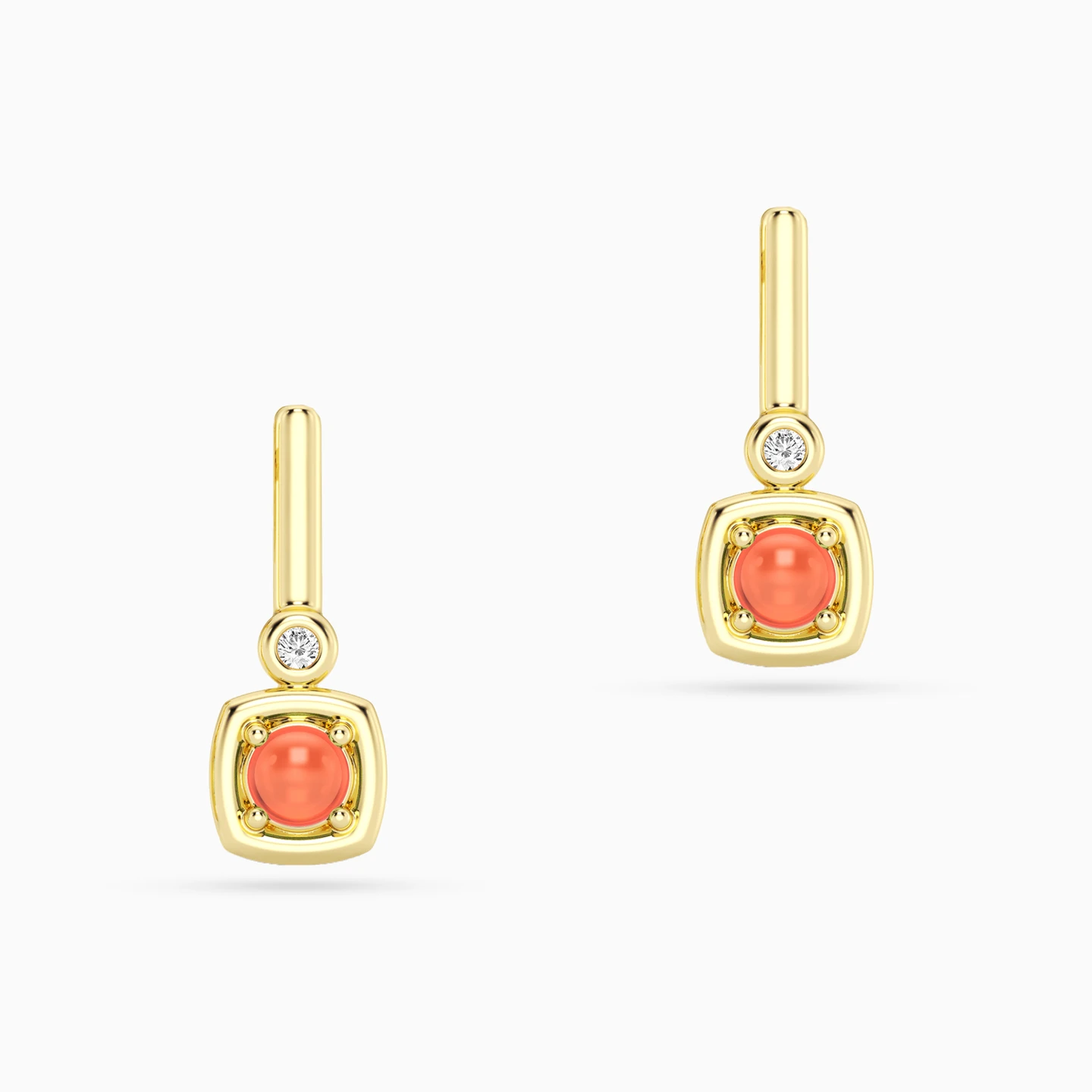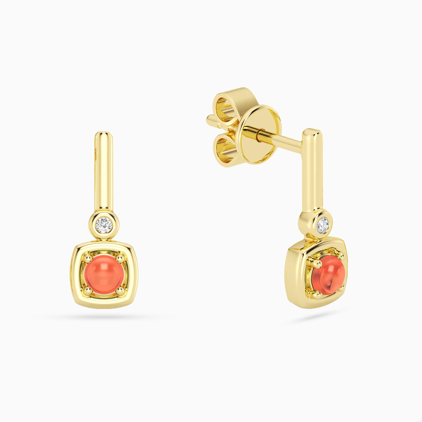 Discover affordable glamour and timeless style with this piece from Waves! These gold-plated drop earrings glow with modern vibrance, showcasing a round orange stone nestled in a cushion-shaped frame, while a sparkling lab-grown diamond sits above it, adding a refined touch of brilliance. Perfect for those who love bold colors and contemporary elegance, they’re an eye-catching addition to any outfit, day or night.