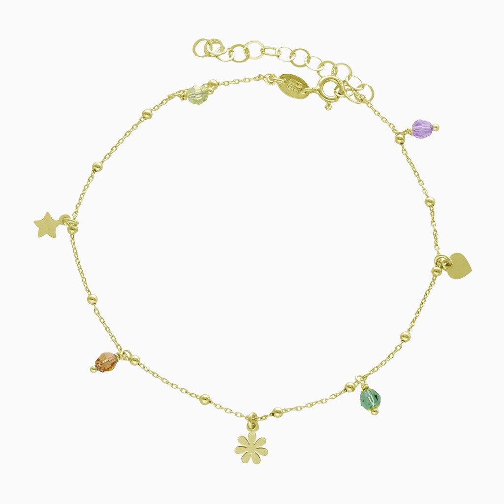 Where playfulness meets charm. This Waves anklet in yellow gold plating features a delicate chain adorned with dainty charms—a flower, star, and heart—interspersed with colorful crystals in green, purple, and amber. Each detail captures a carefree, sunny spirit. A joyful gift for those who love lighthearted elegance.
