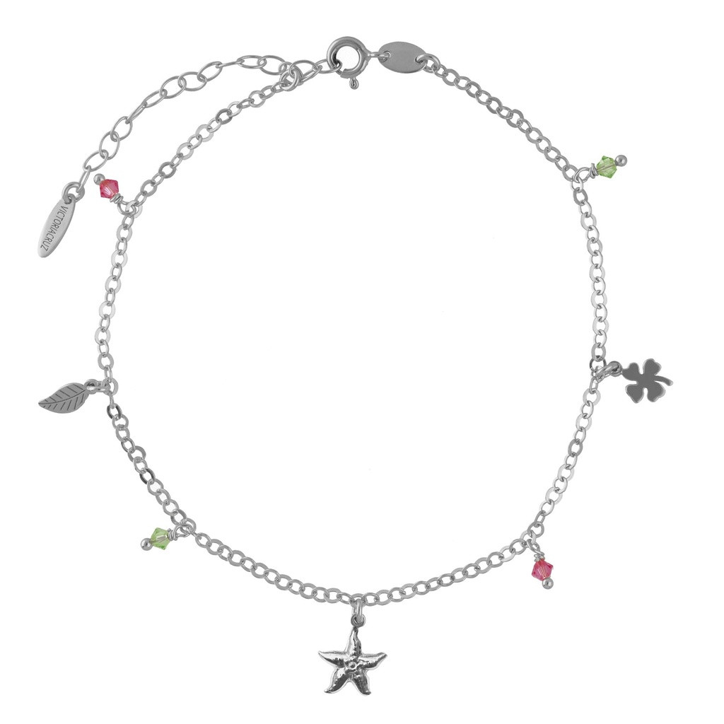 Moments of joy in every charm. This Waves anklet in sterling silver features playful symbols—a starfish, leaf, and clover—interspersed with tiny crystals in pink and green. Each detail sparkles with carefree spirit, evoking sunshine, sea, and laughter. A delightful gift for those who live with lighthearted grace.