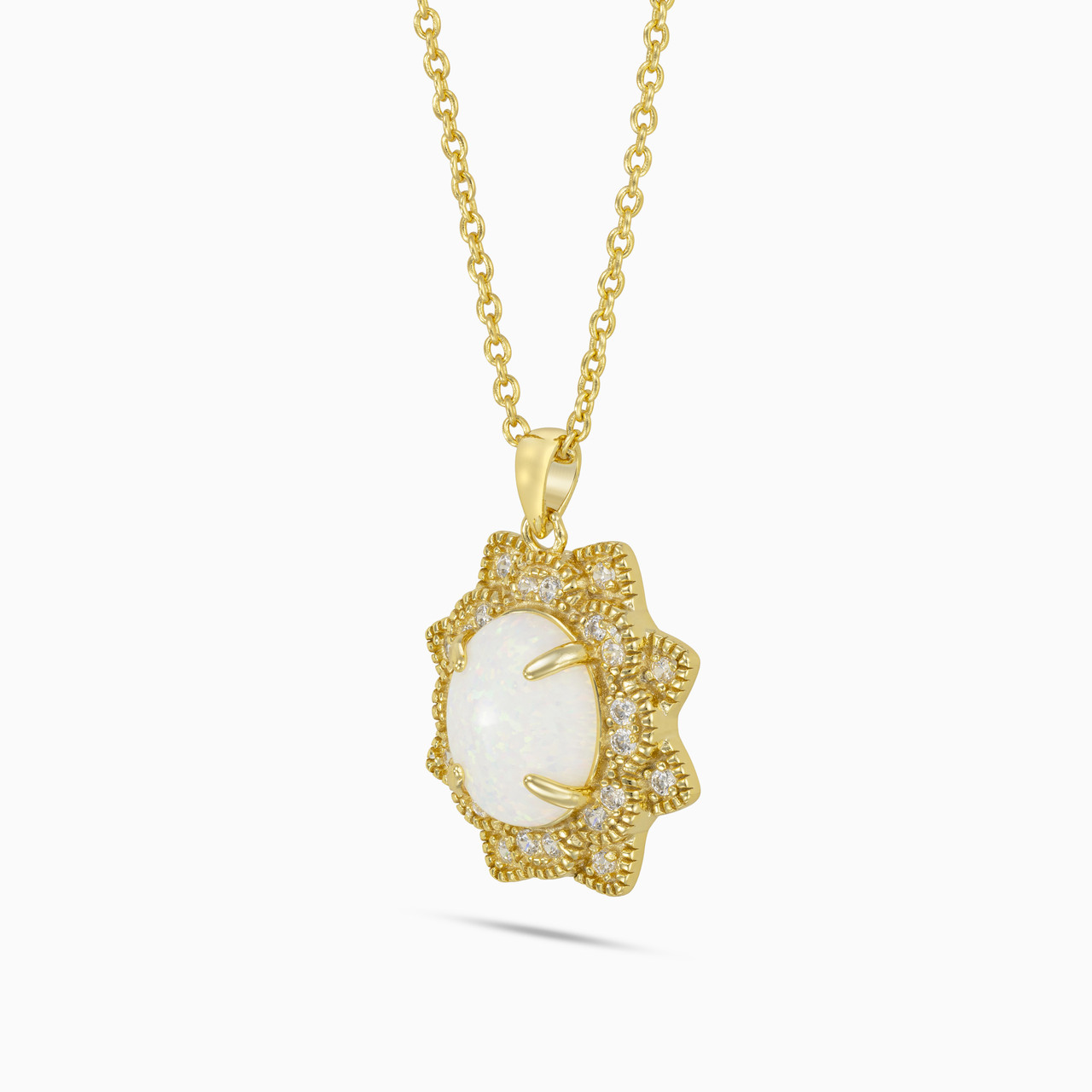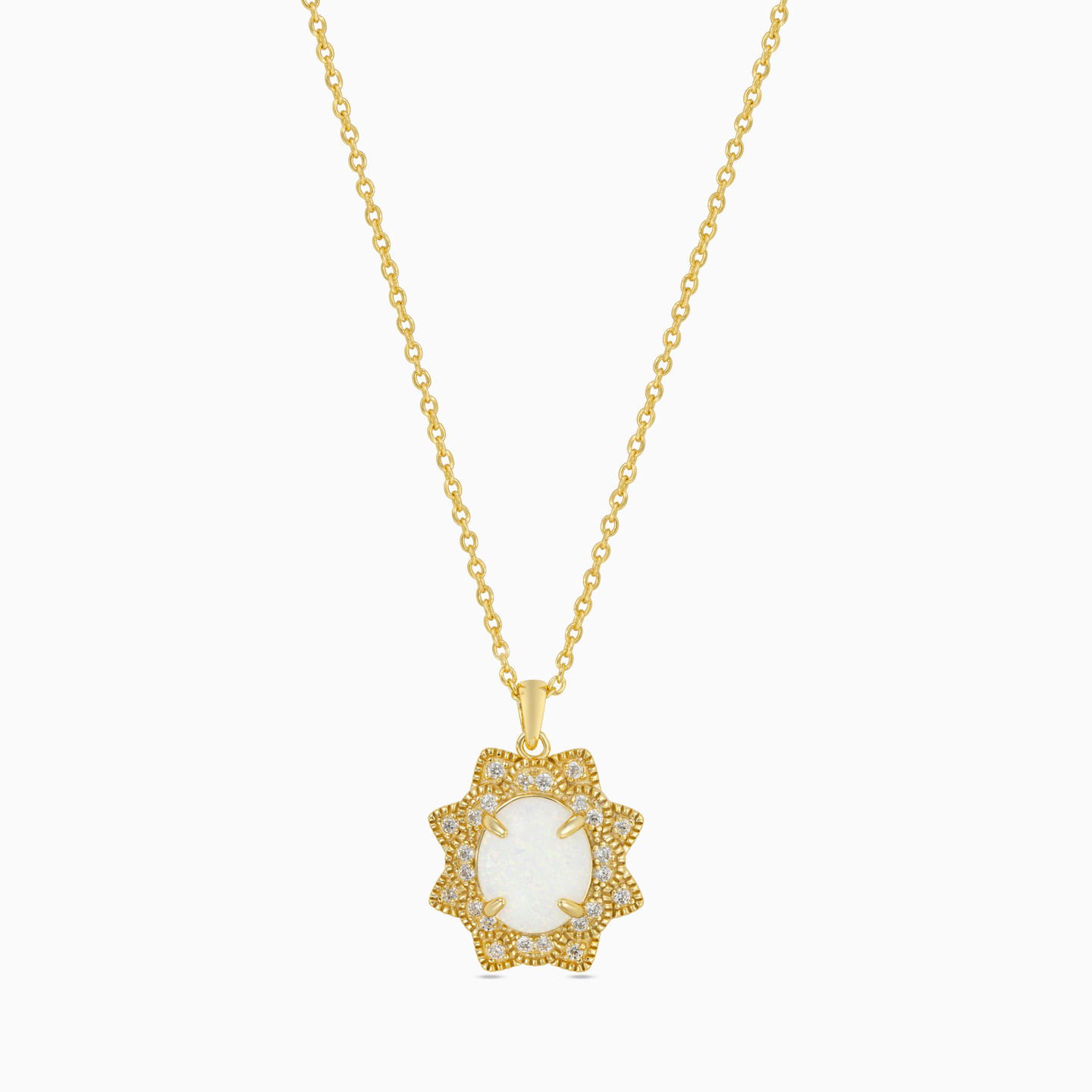 You'll radiate warmth and beauty with this eye-catching sun-like pendant necklace from L'azurde Waves gracing your neckline. We love how fun and feminine this chic piece is and how the ray-like edges gleam in yellow gold plate, dotted with dazzling clear stones. At the center of this pendant is a magnificent opalescent colored stone that instantly brightens your outfits. We predict that this beautiful pendant will quickly become your go-to favorite. Pair it with the matching drop earrings from L'azurde Waves to complete daytime or evening looks.