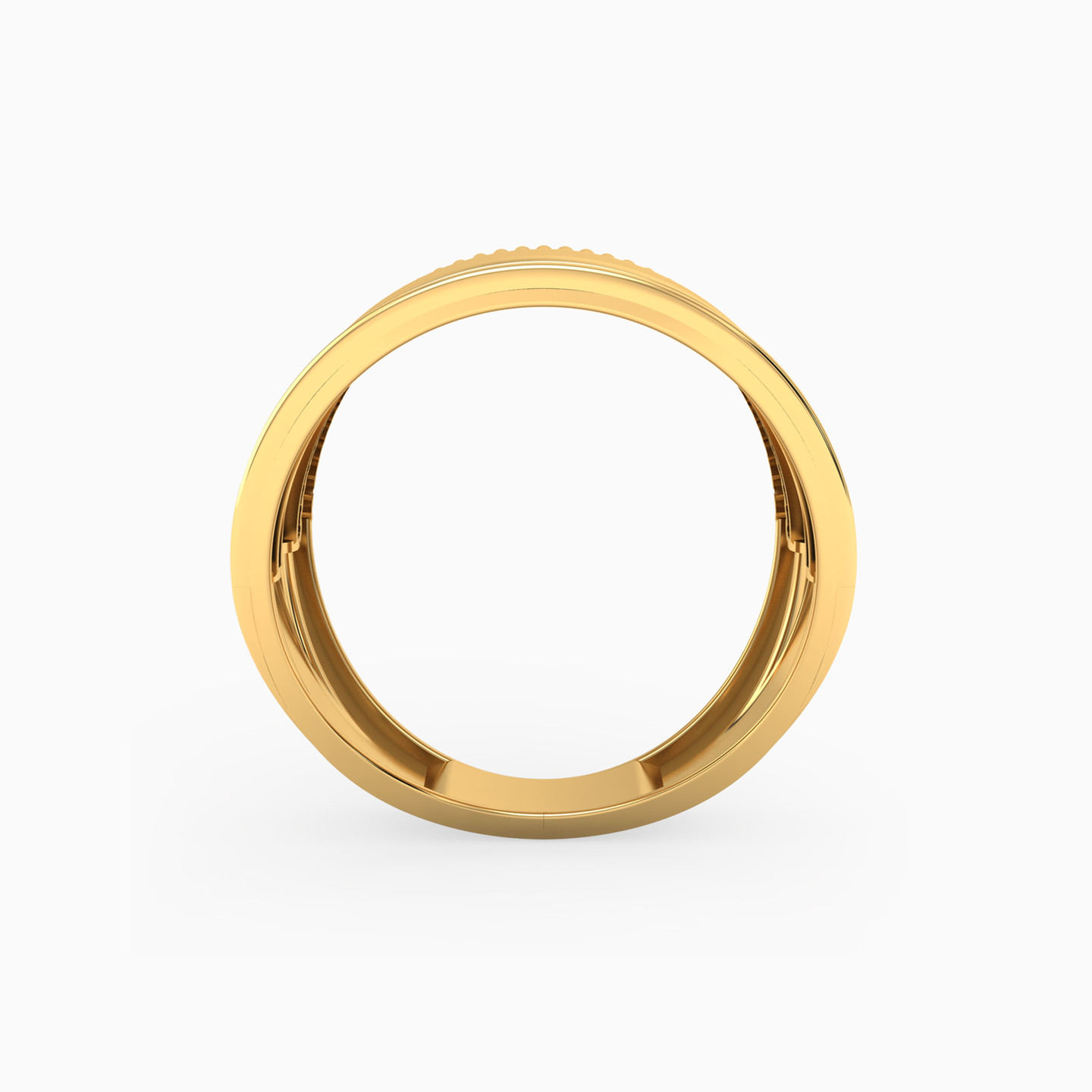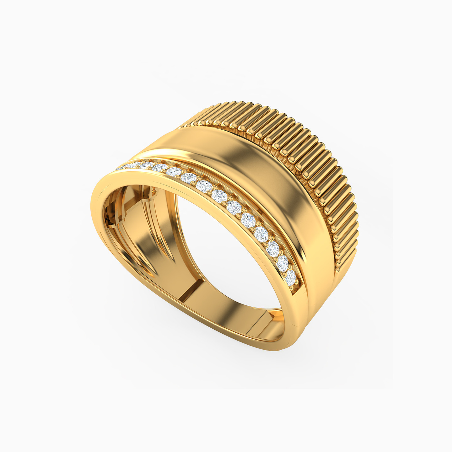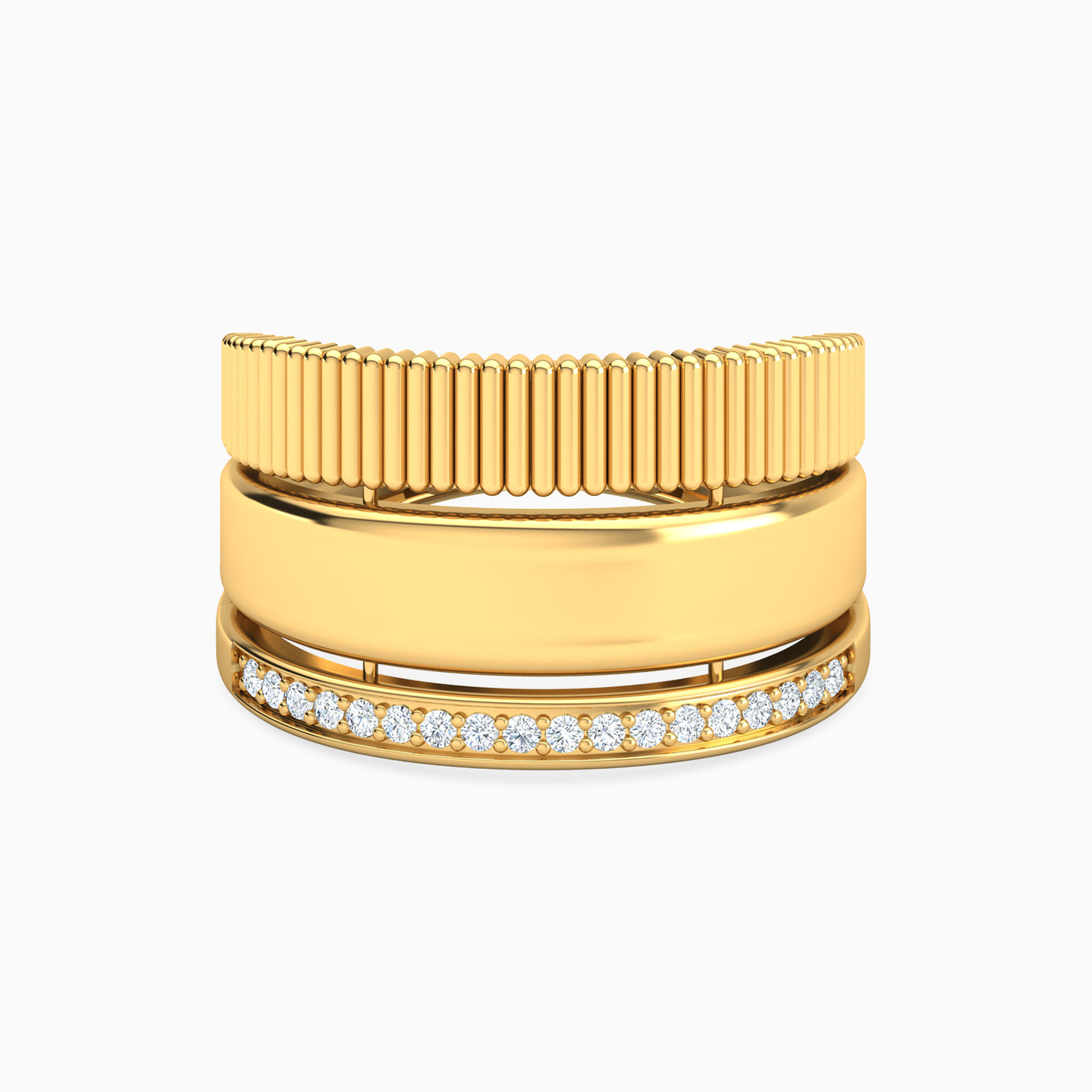 Make a bold statement with this stunning ring from L’azurde Gold. Featuring three solid layers of 21-karat yellow gold - one with a ribbed design, one with a sleek, shiny finish and the last layer studded with cubic zirconia stones, this ring is here to grab all the attention. Wear it on days when you want something bold and beautiful.
