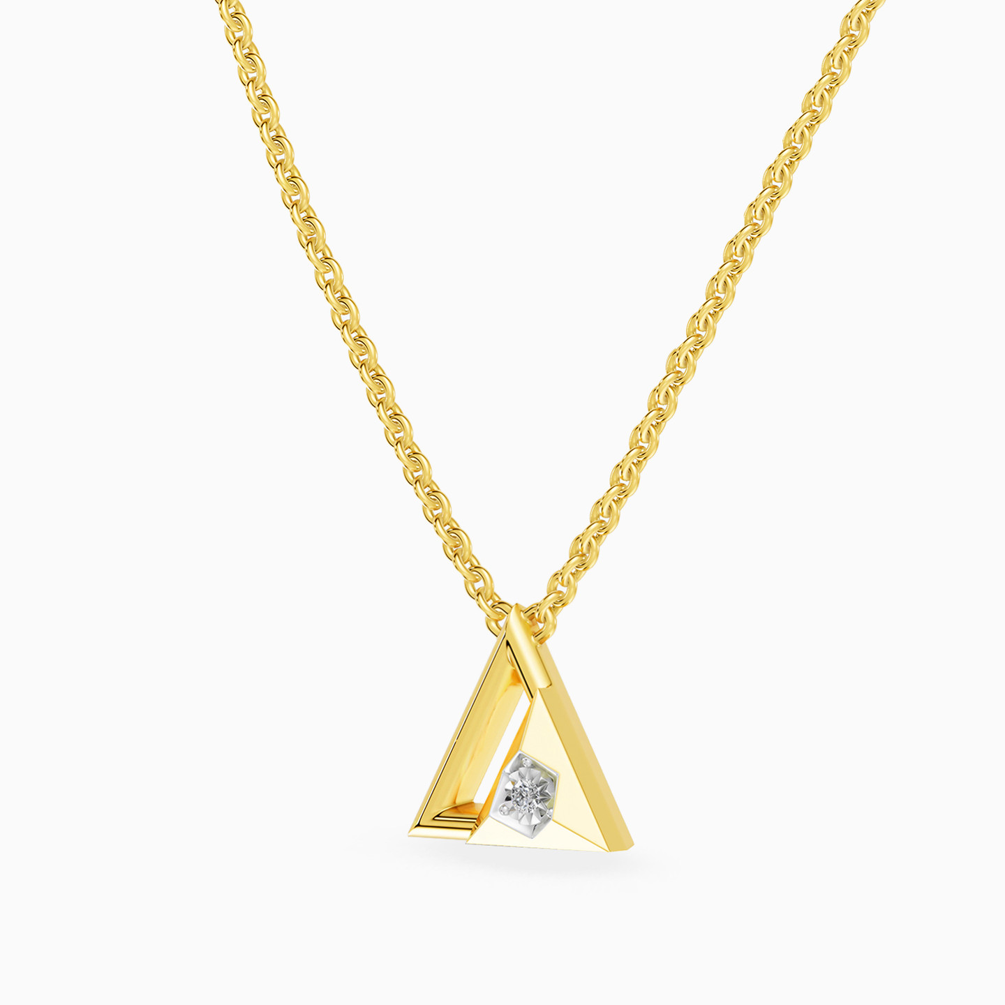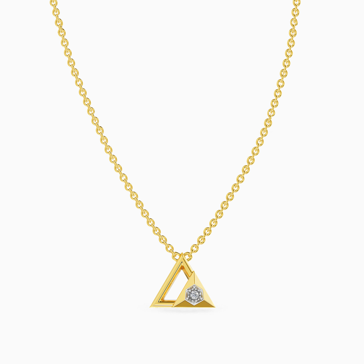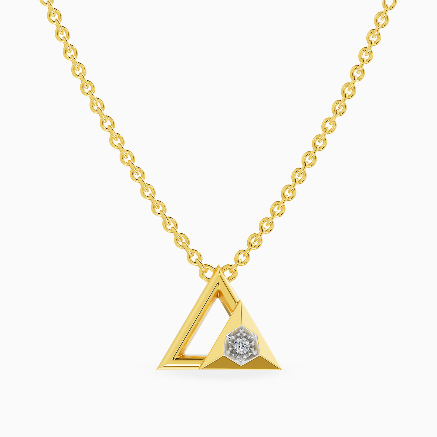 Discover affordable glamour and timeless style with this piece from Waves! This gold-plated necklace captivates with a contemporary design featuring two adjoining triangles—one solid and the other open—beautifully balanced to create a modern geometric statement. The solid triangle gleams with a brilliant lab-grown diamond nestled at its corner, adding a striking sparkle. Perfect for those who adore bold shapes and sophisticated minimalism, it’s an elegant piece to elevate everyday looks or special moments.