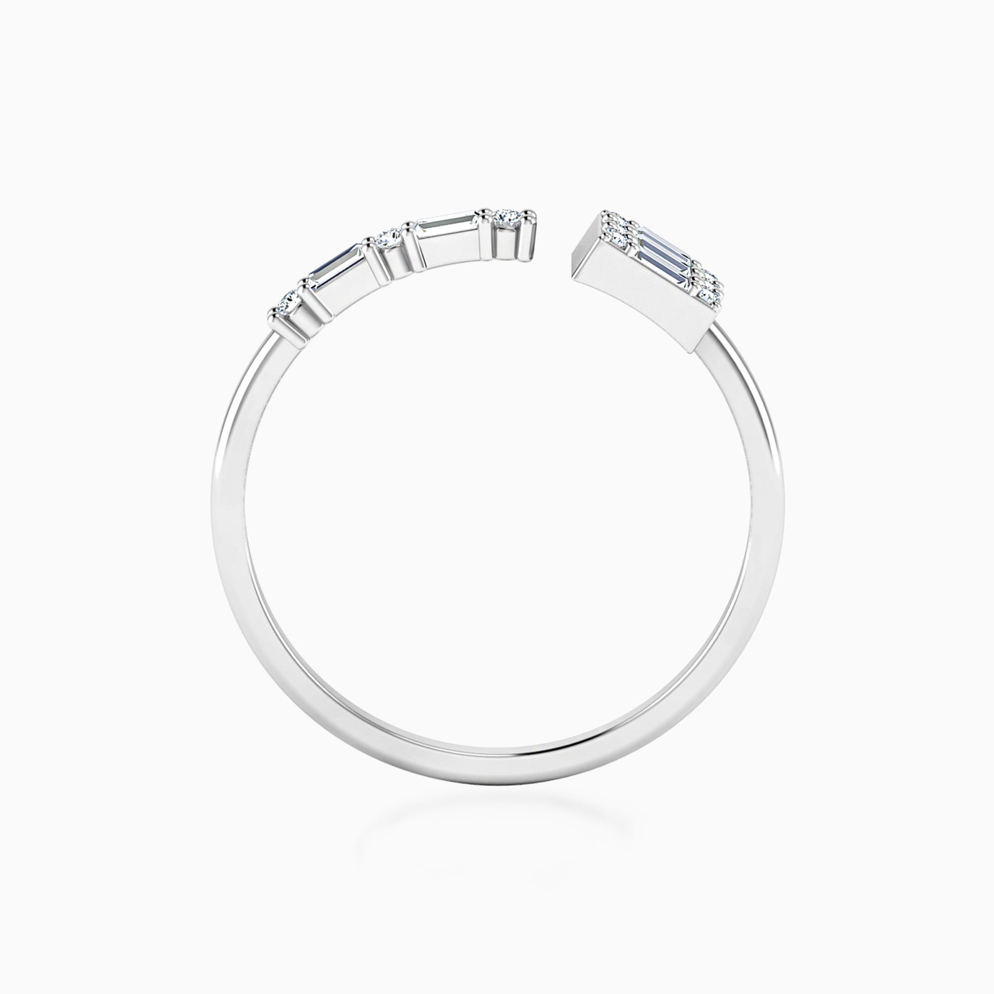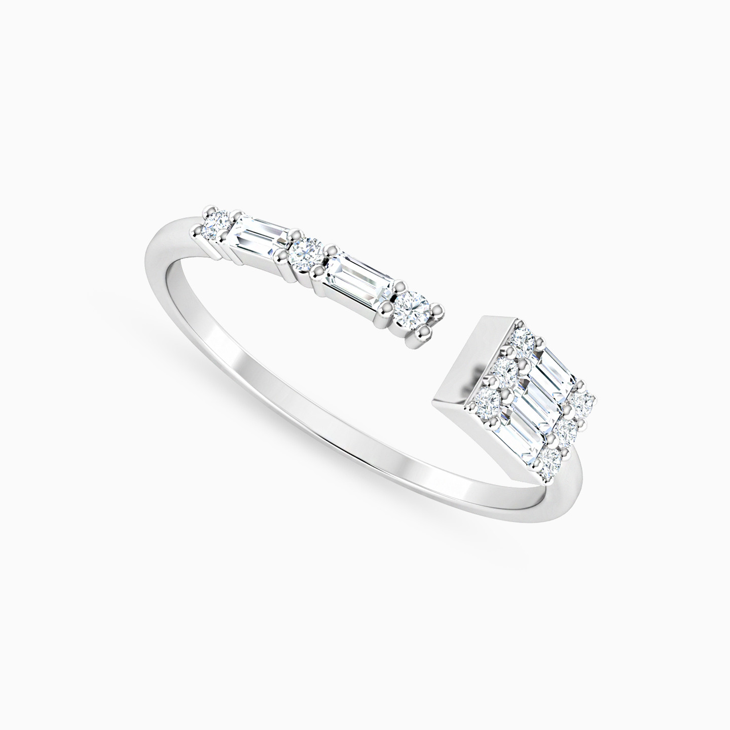Infuse sophistication into your power dressing wardrobe with this scintillating ring from Miss L’. The open styled design gives it a sharp look, while the baguette cut diamonds lend a bold finish. We recommend pairing this with a subtle diamond bracelet for maximum effect.