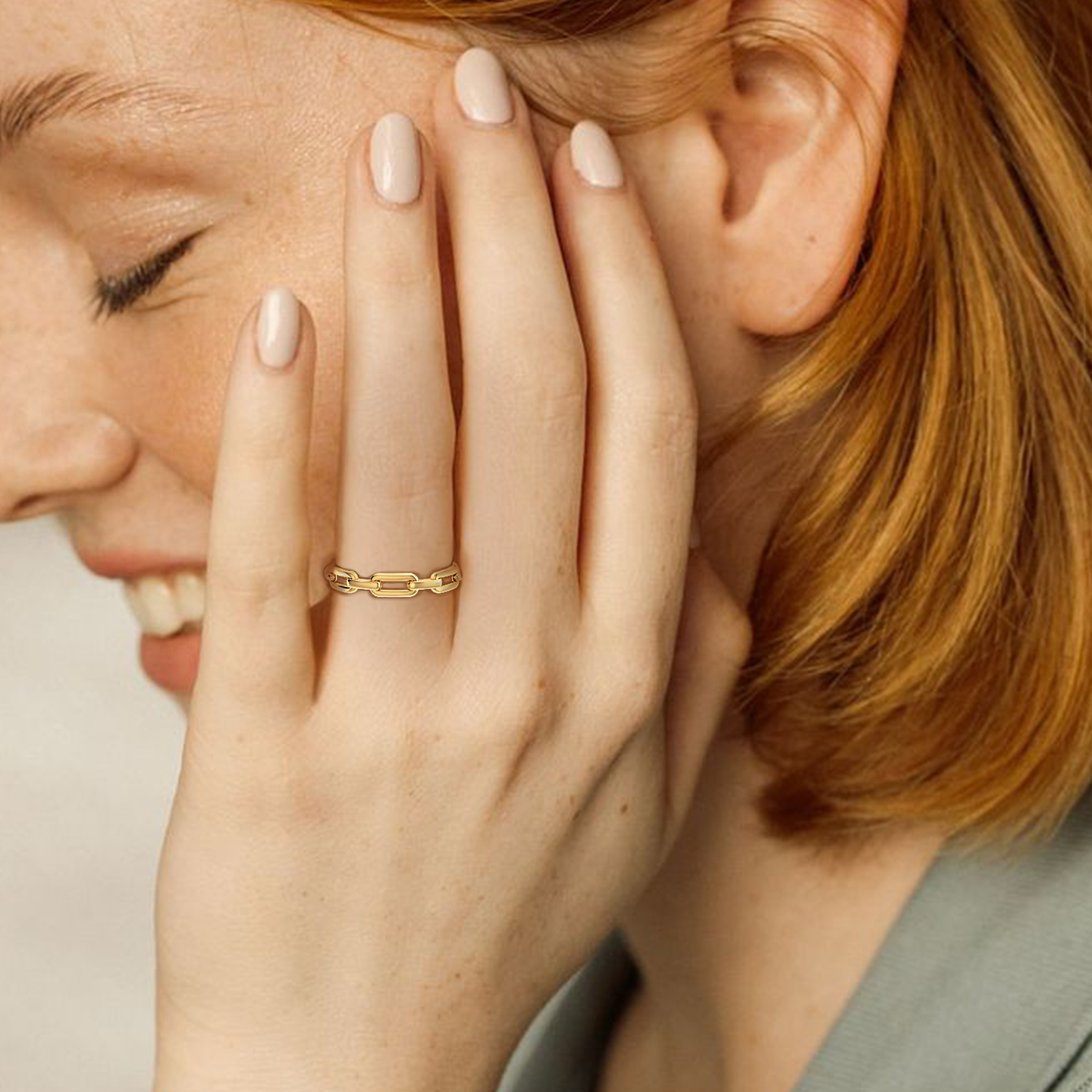 Add glamour and sophistication to your daytime and evening looks by wearing this gorgeous stackable ring from Miss L'. Crafted in 14-karat yellow gold, this bold ring features an elegant chain link design. We love this ring worn on its own for a simple yet elegant look, or stacked for a stylish twist.