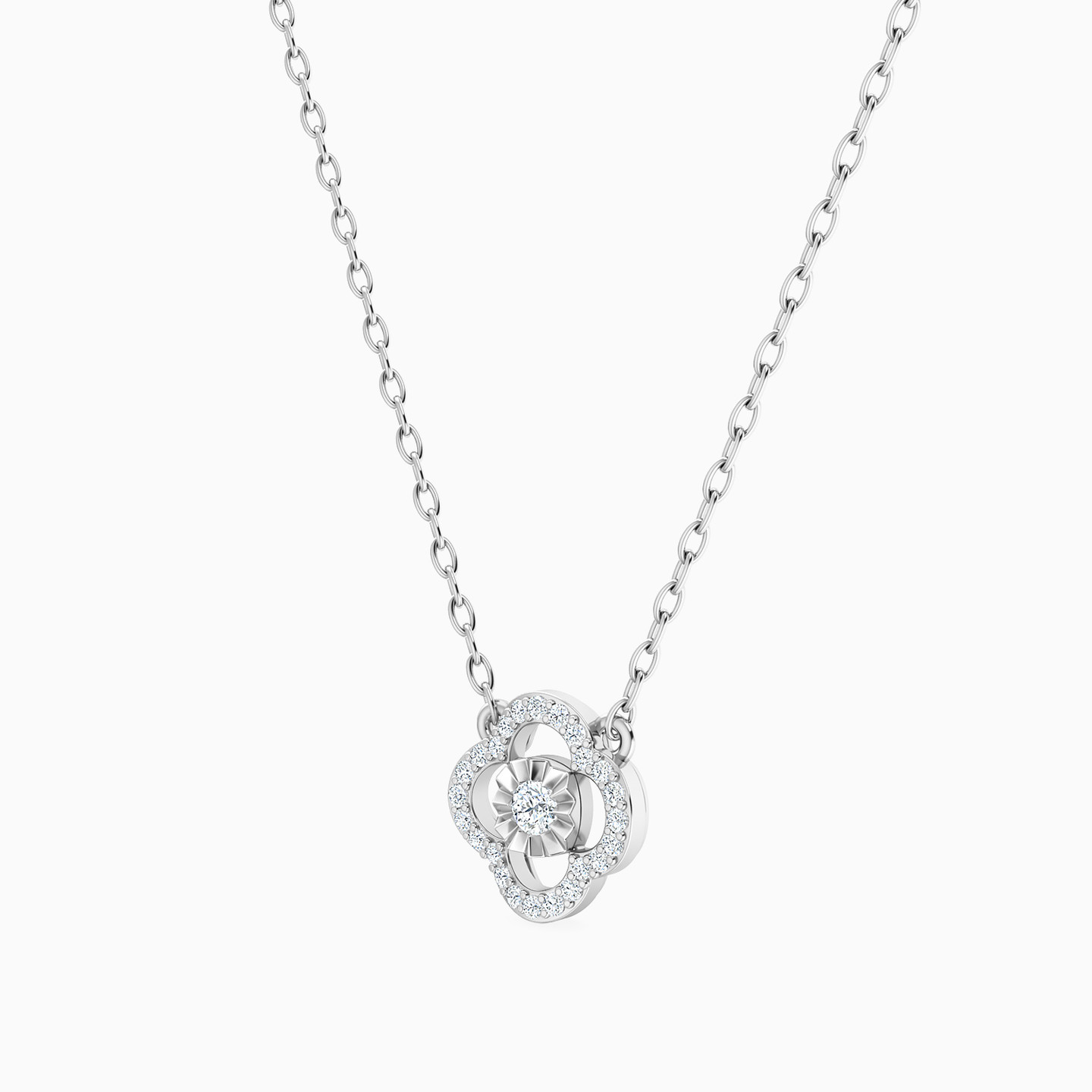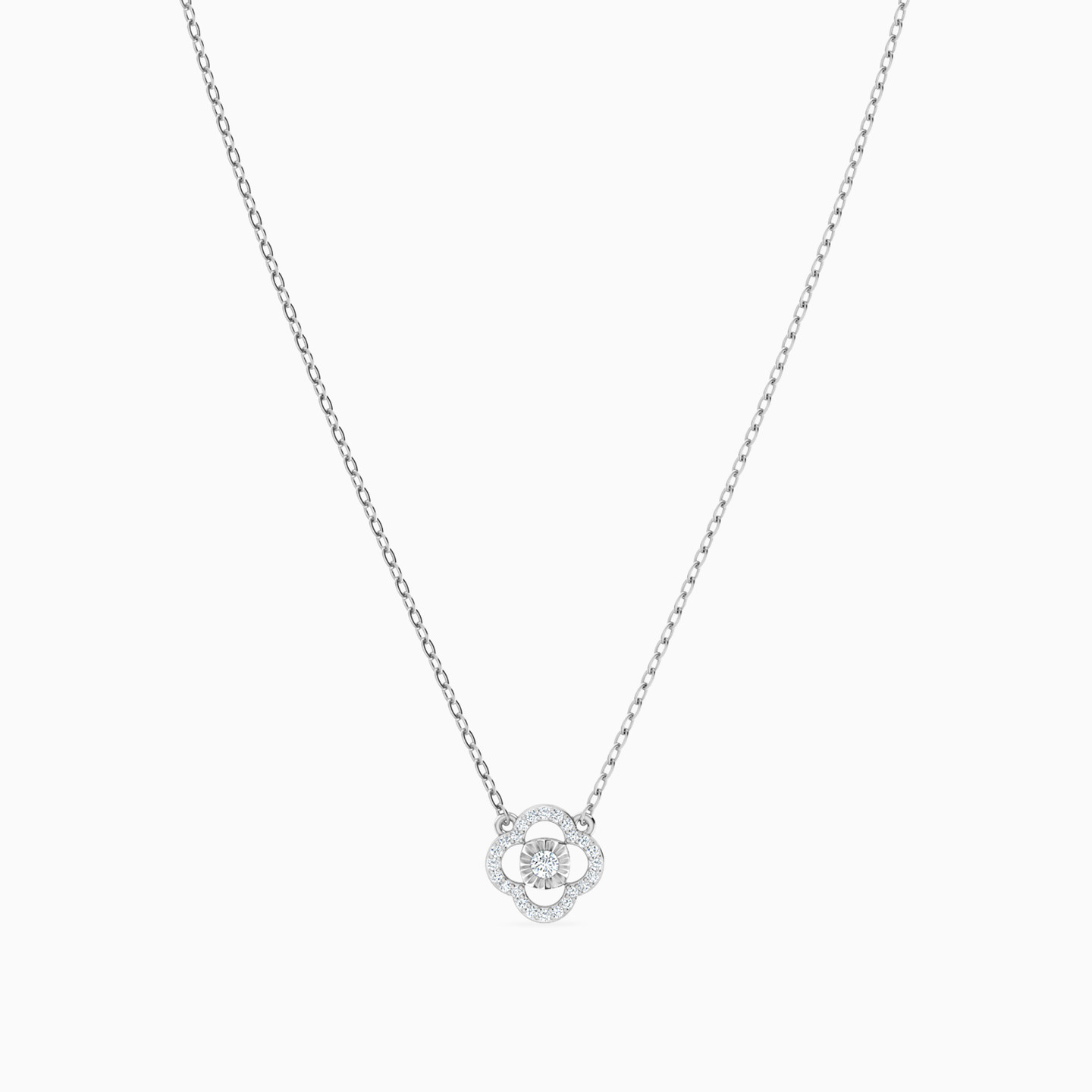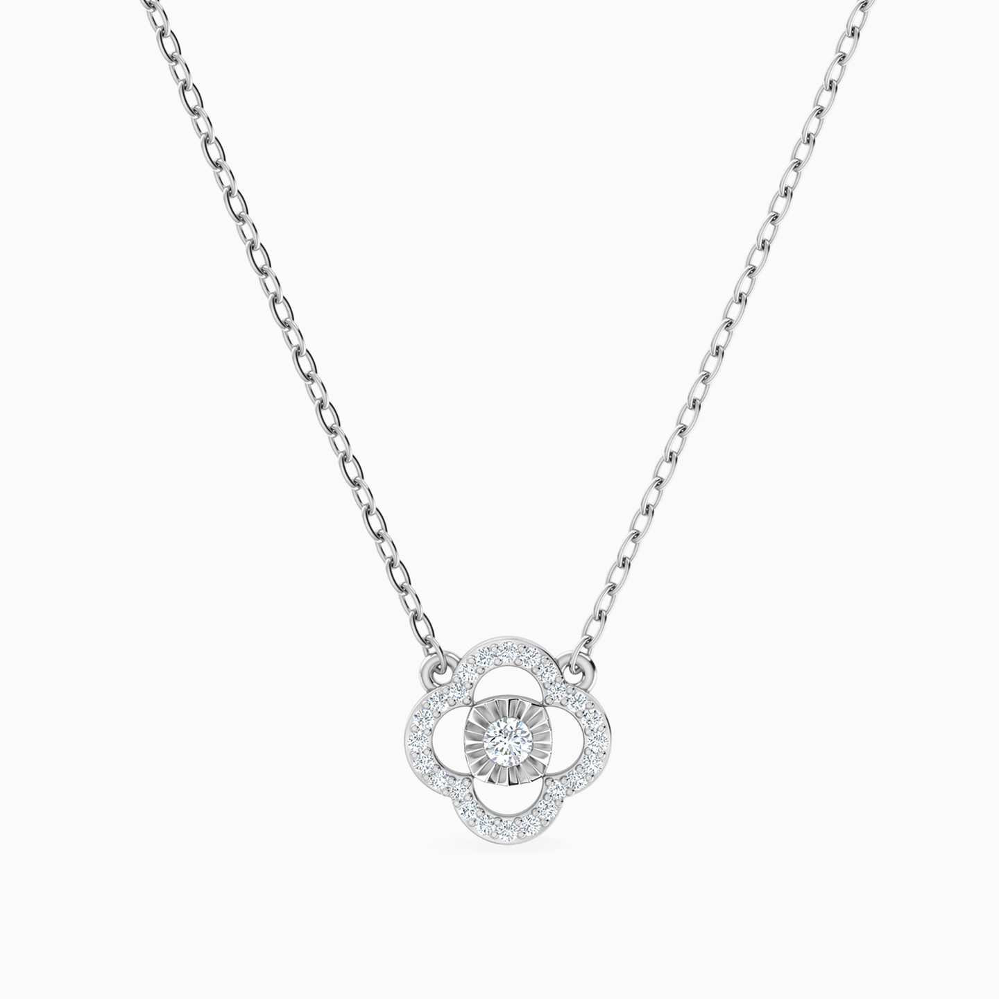 Simply sophisticated, this diamond pendant necklace from Miss L is ready to become your favorite everyday look. Crafted in 18-karat white gold, this eye-catching necklace features a brilliant cut diamond within a clover-shaped diamond frame. This beautiful pendant easily takes you from a day at the office to an evening on the town.