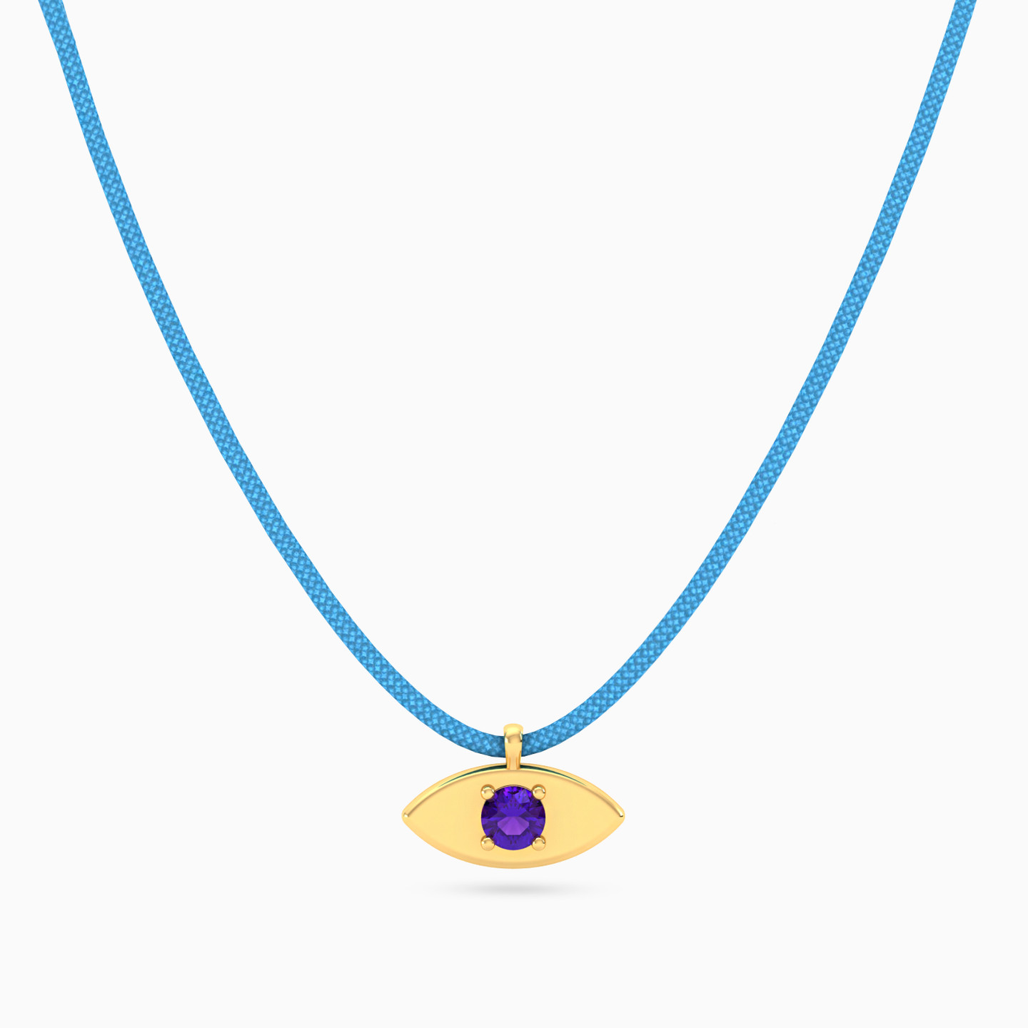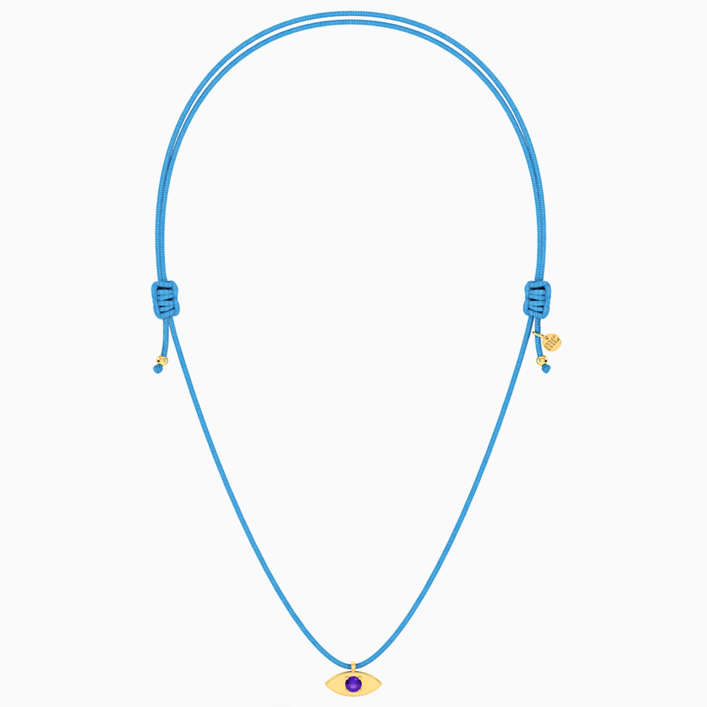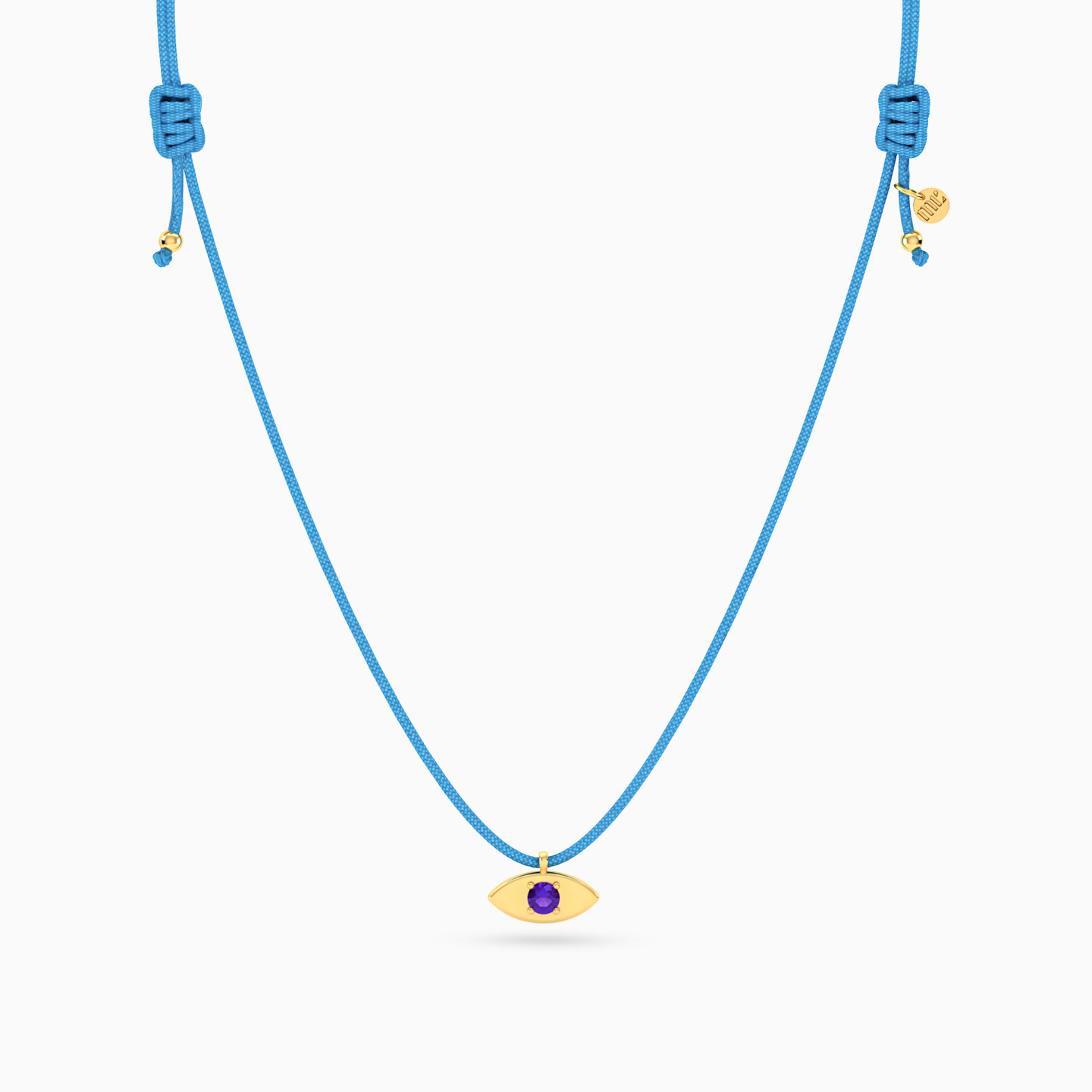 A charm to watch over her. This sky-blue cord necklace features a tiny golden eye pendant with a purple gem at the center—designed to inspire positivity and playful imagination. A thoughtful gift for daily wear.