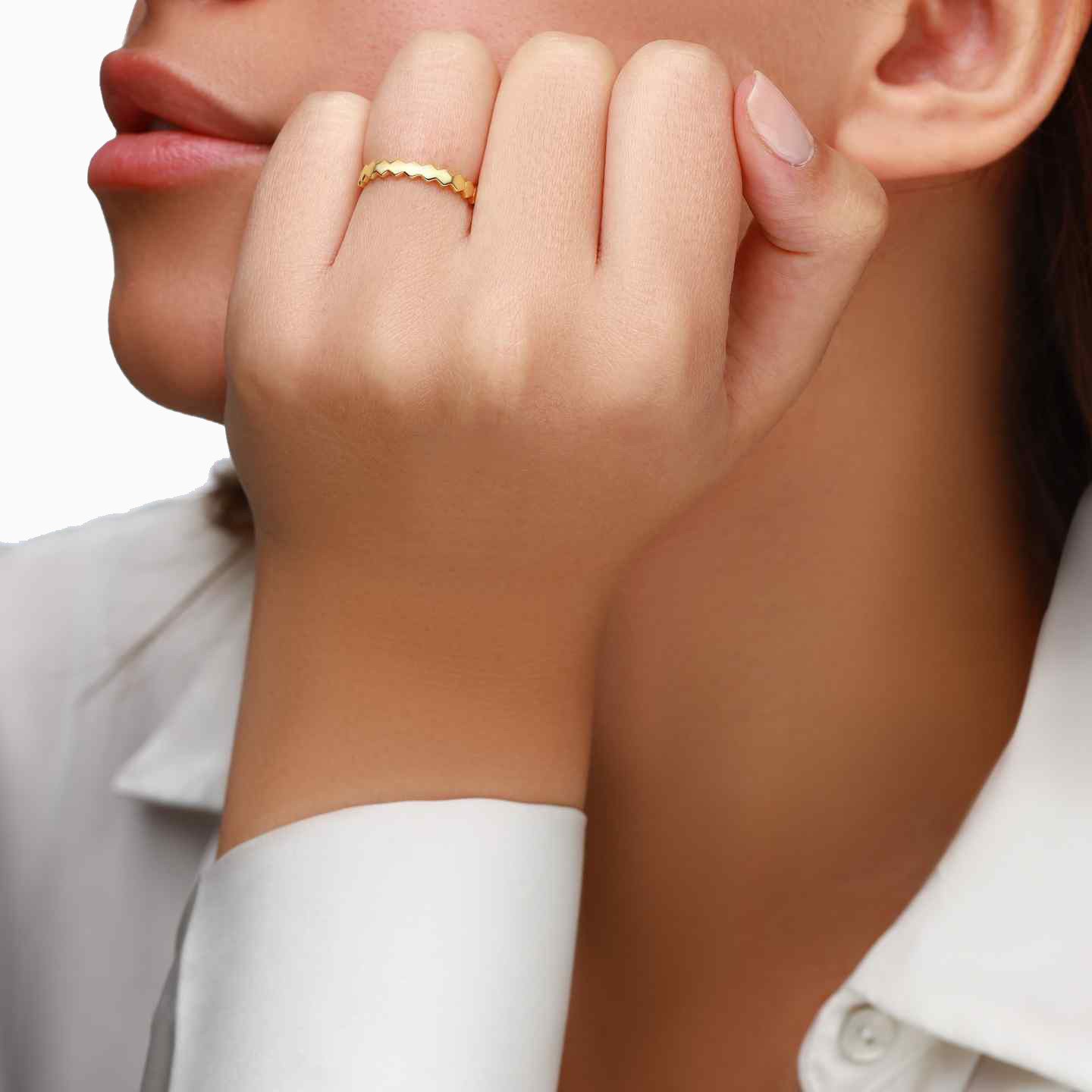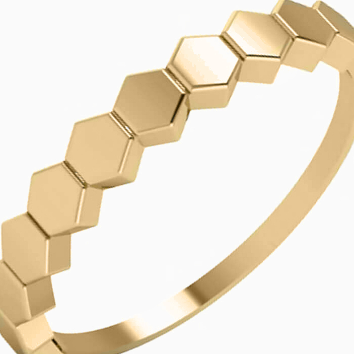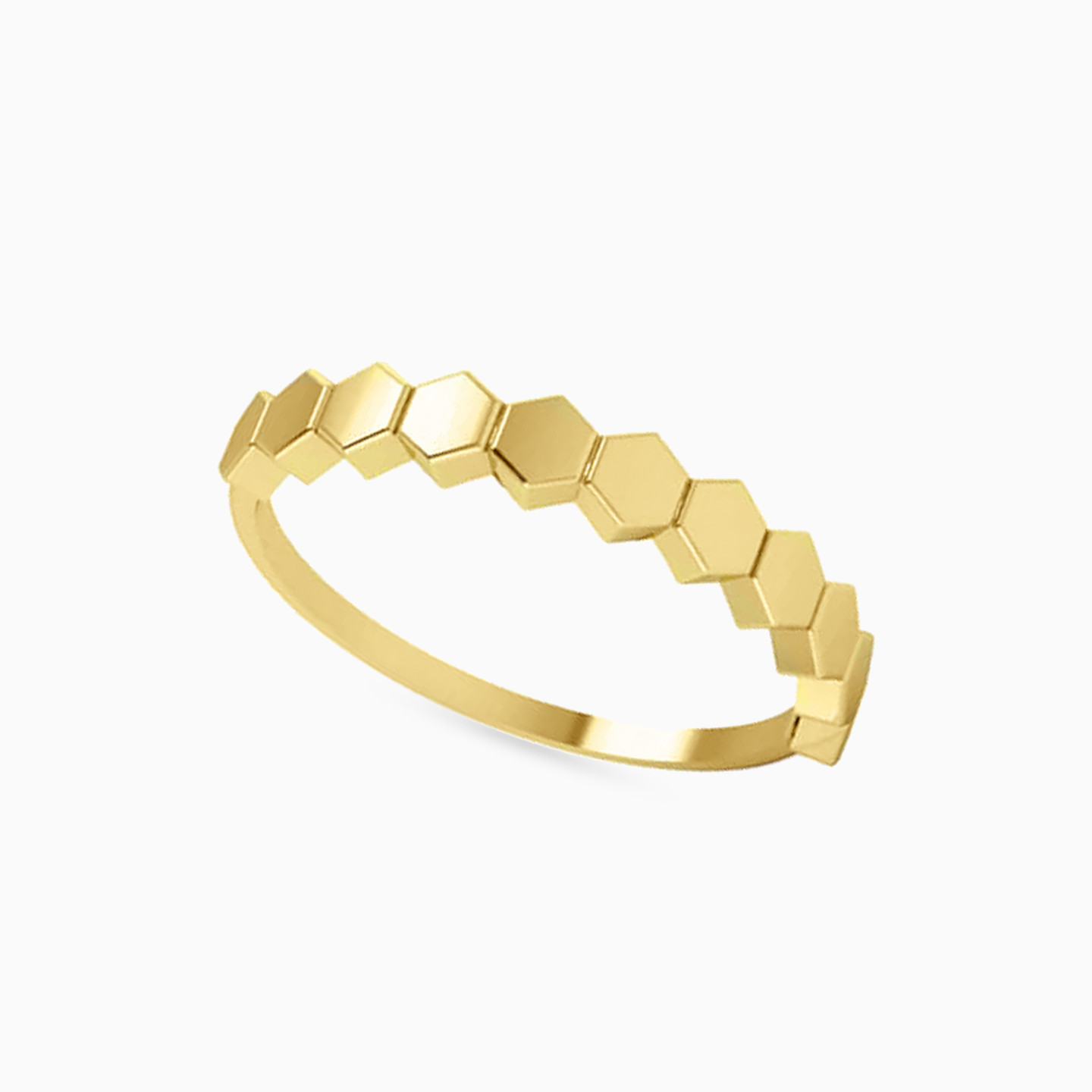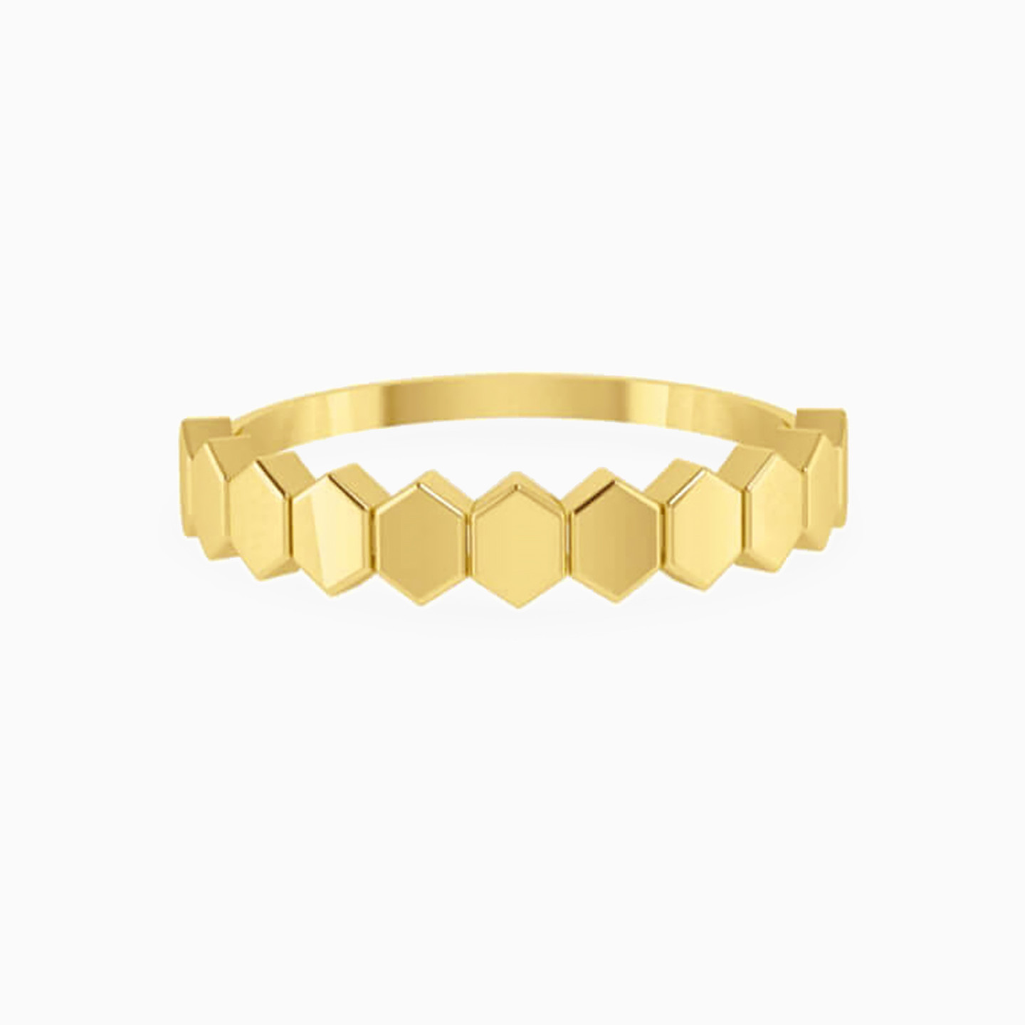 Classy yet contemporary, this ring from Miss L’ cannot be ignored. We love the lineup of mini hexagon accents on the slim 18-karat yellow gold band. We recommend you pick this ring in different hues to create a stacked look.