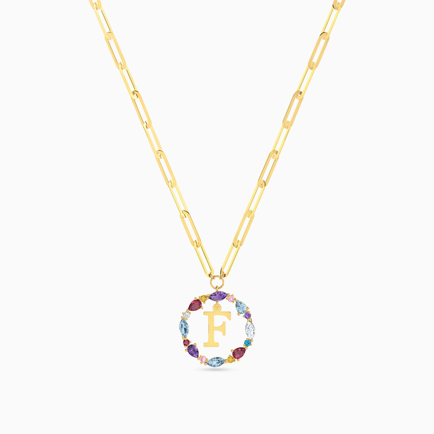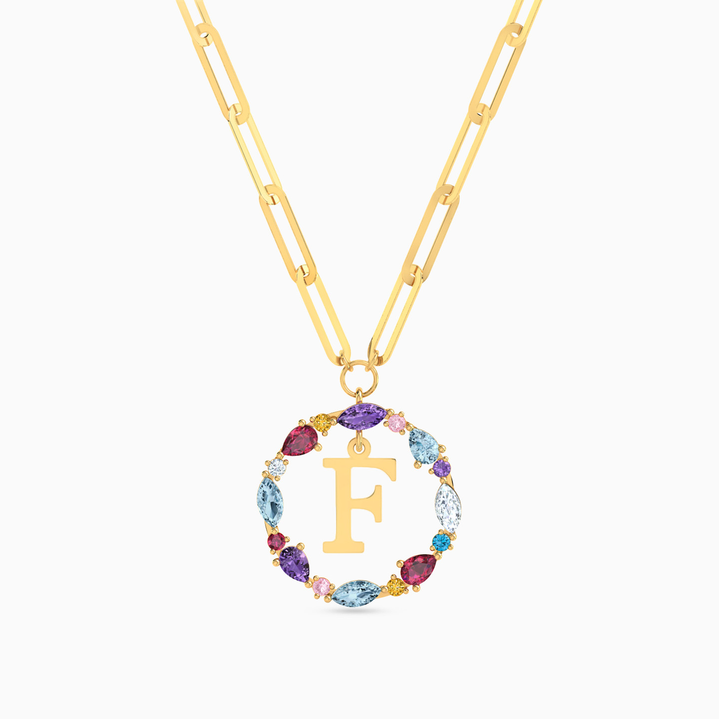 Fashion your name into your everyday style with this necklace from L'azurde Instyle. We love the F letter pendant that's bordered with a circle of colored stones and suspended from an 18-karat yellow gold link chain. Pick it for yourself or gift it to someone special.
