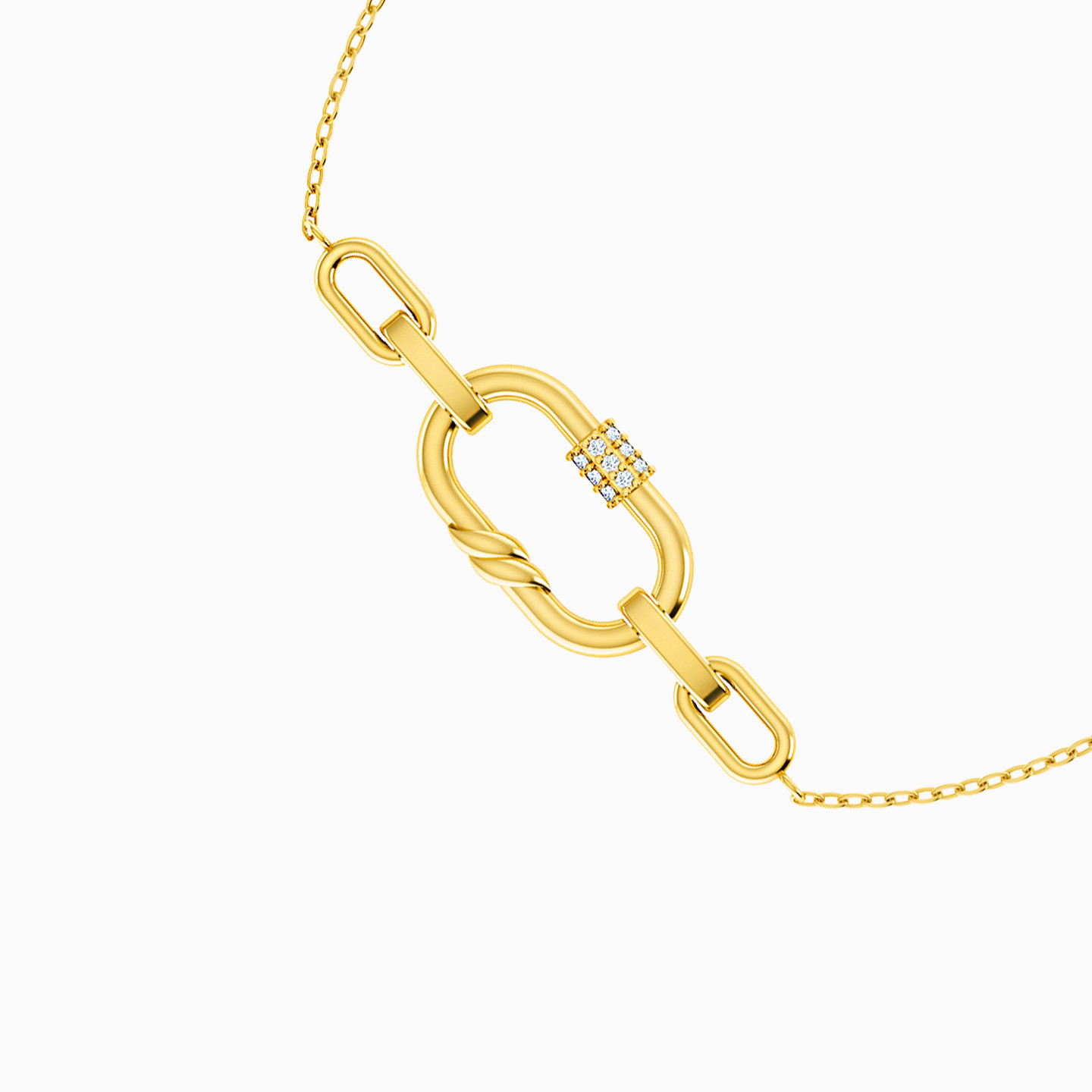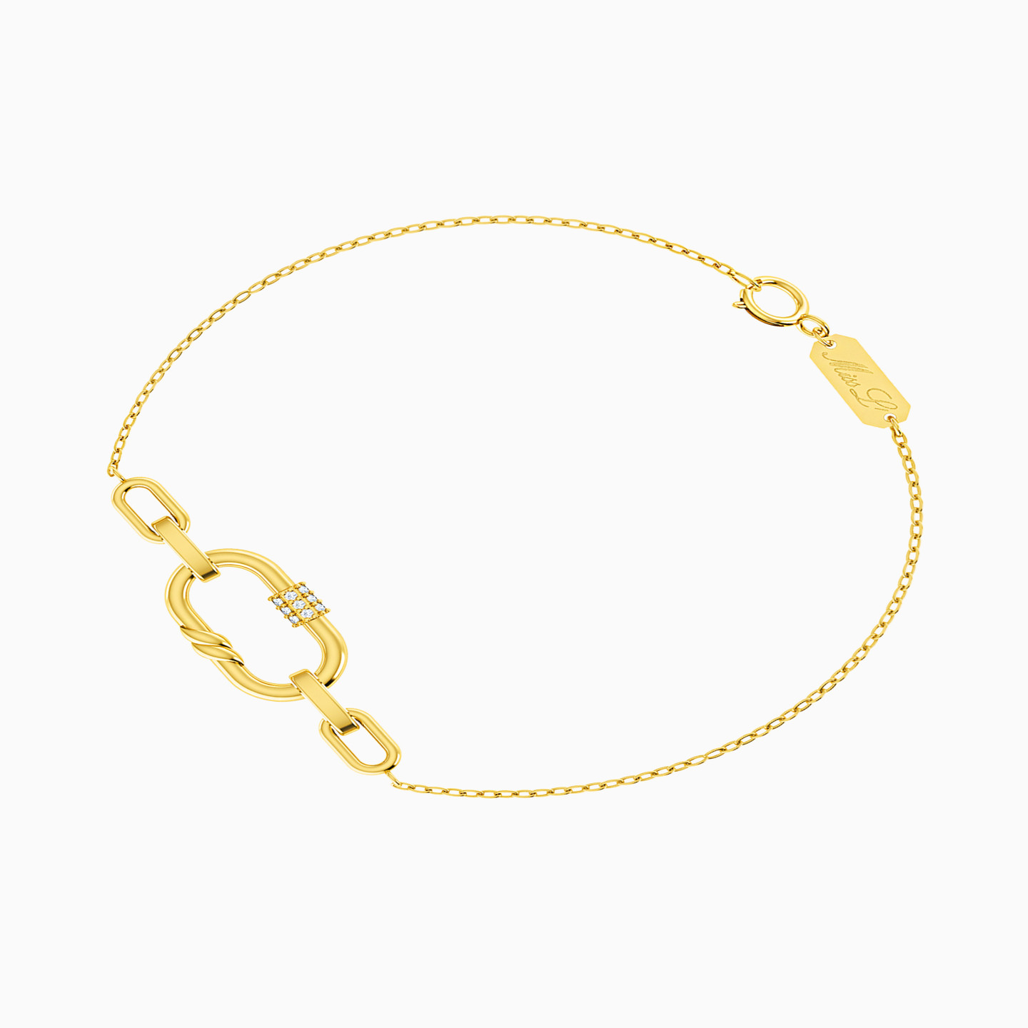 Show off your bold appeal with this statement bracelet from Miss L’. Flaunting our signature design to the center with link accents to the side, this 18-karat yellow gold bracelet exudes a confident vibe. Pair it up with your power dressing style for a look that will take you towards success.