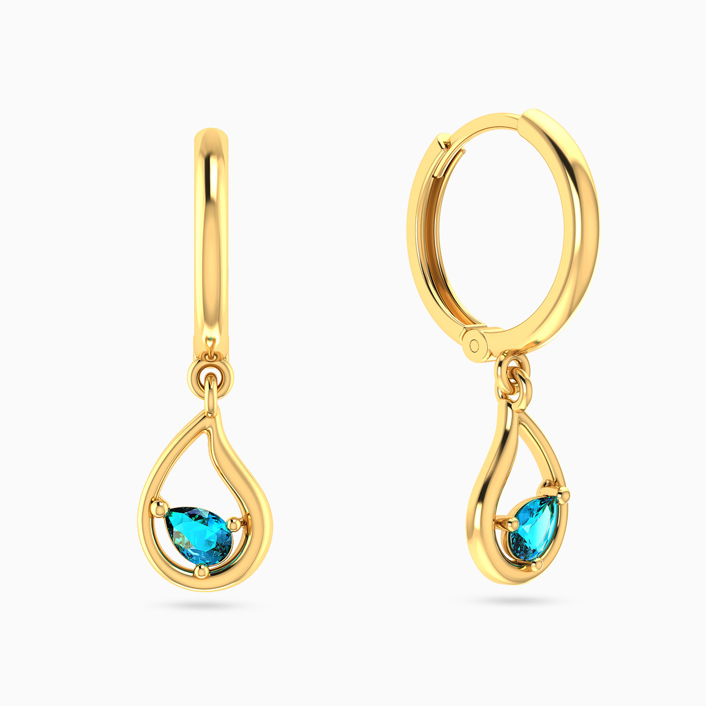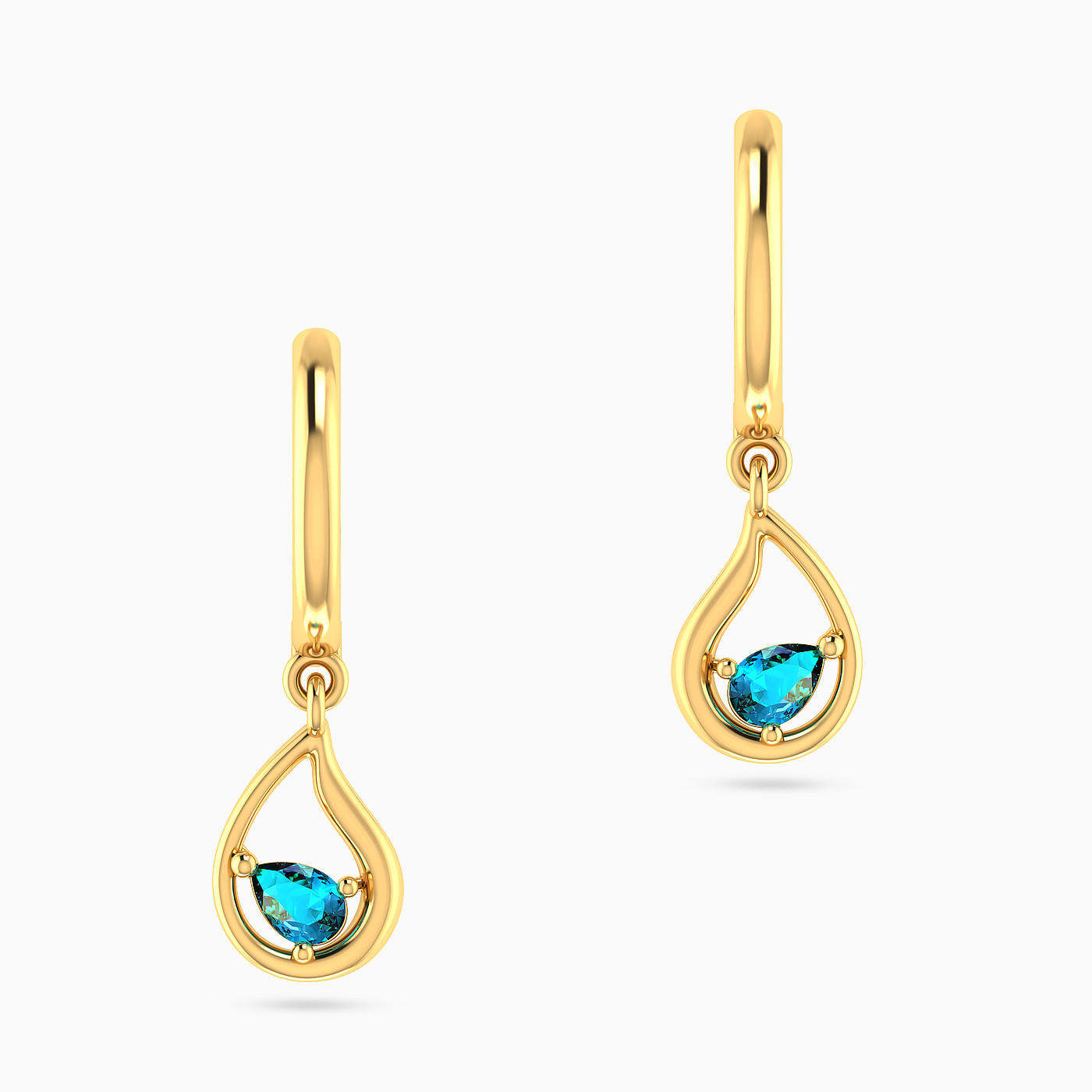 Add a captivating pop of color to your daytime and evening looks by wearing these eye-catching Water element drop earrings from Miss L'. Fashioned in 14-karat yellow gold, these feminine earrings feature gold water drops dotted with pear-shaped stones in a gorgeous shade of blue. The Water element belongs to those born under the zodiac signs of Pisces, Cancer and Scorpio who share the common traits of being peaceful, sensitive, mysterious, trusting and full of emotion. Pair these earrings with the matching choker necklace from Miss L' to elevate your outfits.