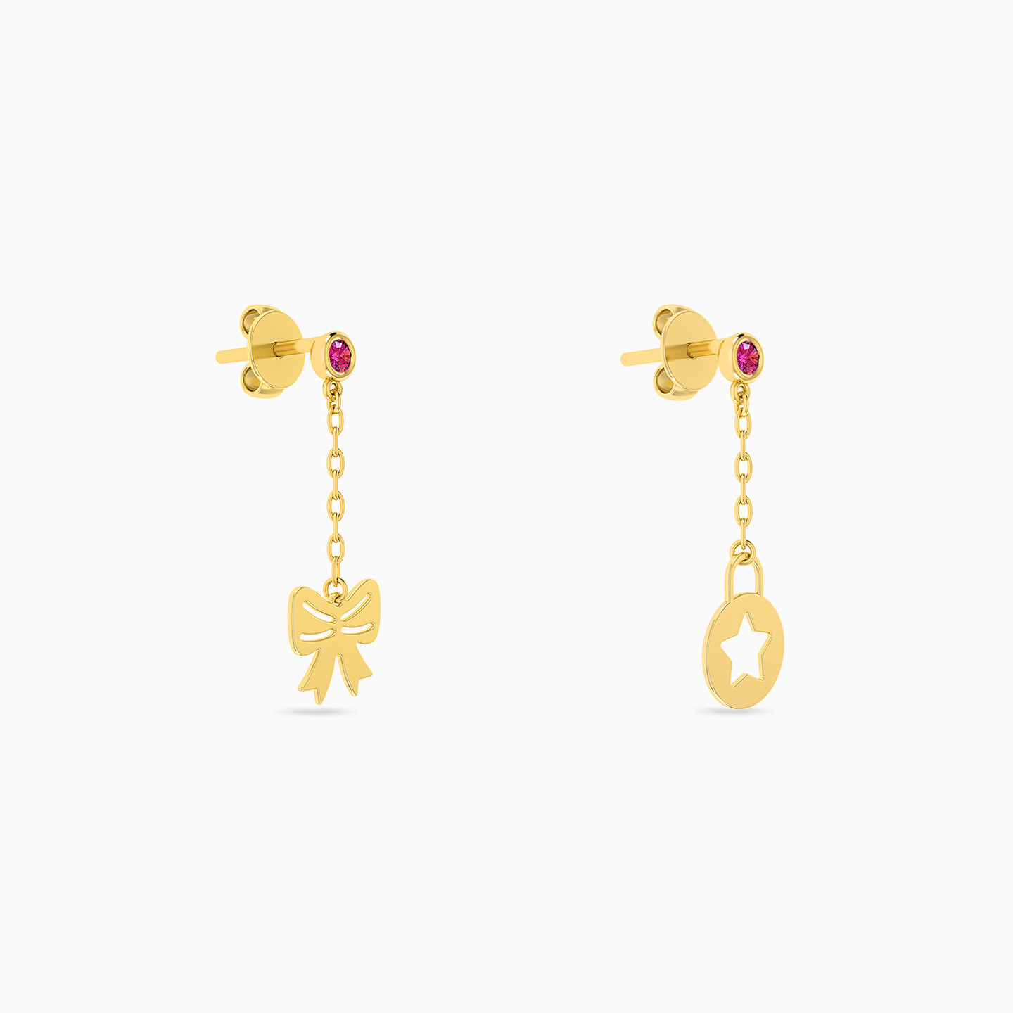 Turn yourself into a shiny gift box for that special someone with these asymmetrical drop earrings from Miss L’. Featuring one bow drop and one star cut out drop, cast in 18-karat yellow gold and dotted with a pink stone on top, this pair is sure to add a playful appeal to your evening outfits.