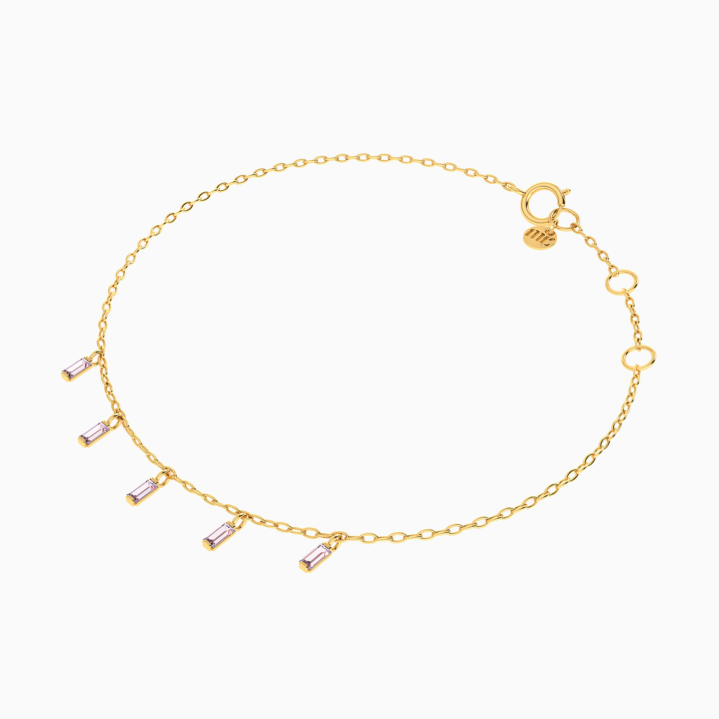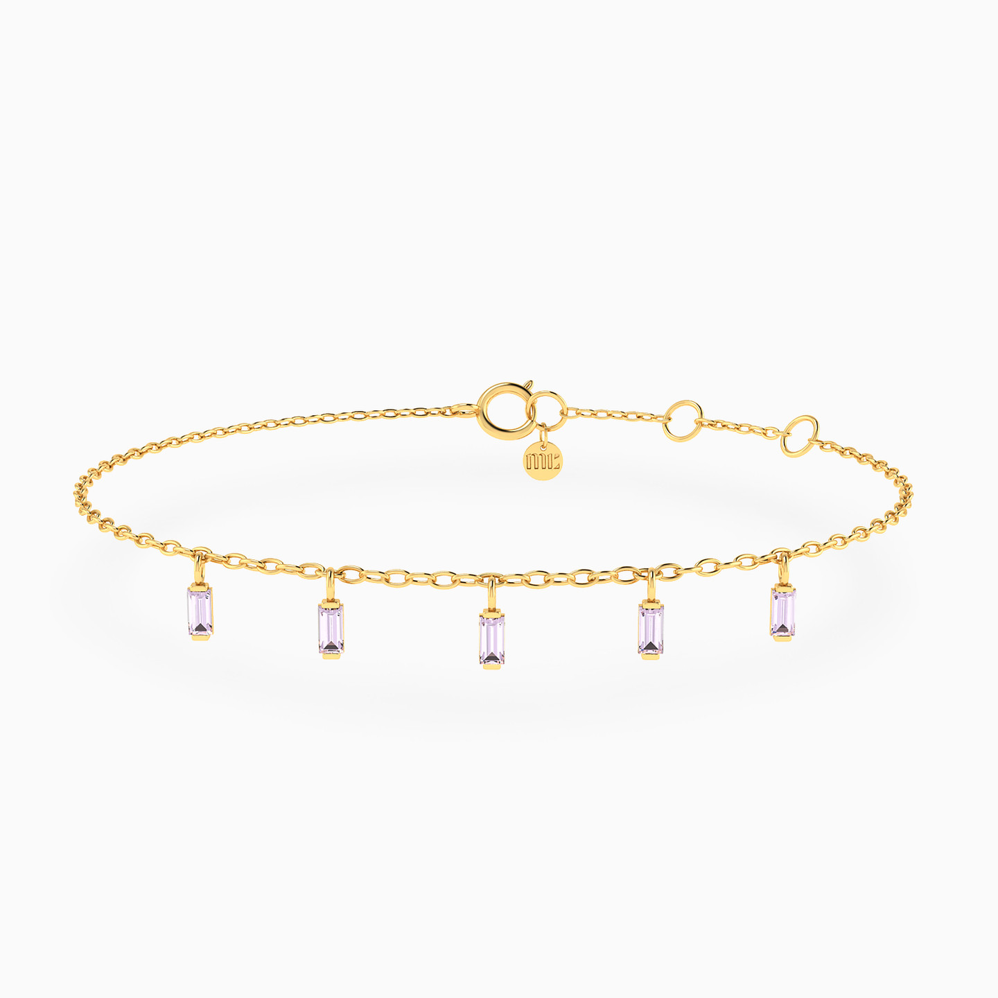 Simply sophisticated, this chic chain bracelet from Miss L' is a timeless symbol of elegance. Beautifully crafted in 14-karat yellow gold with five baguette-shaped colored stones that will shimmer with your every move. This bracelet adds the perfect finishing touch to an office or casual look.