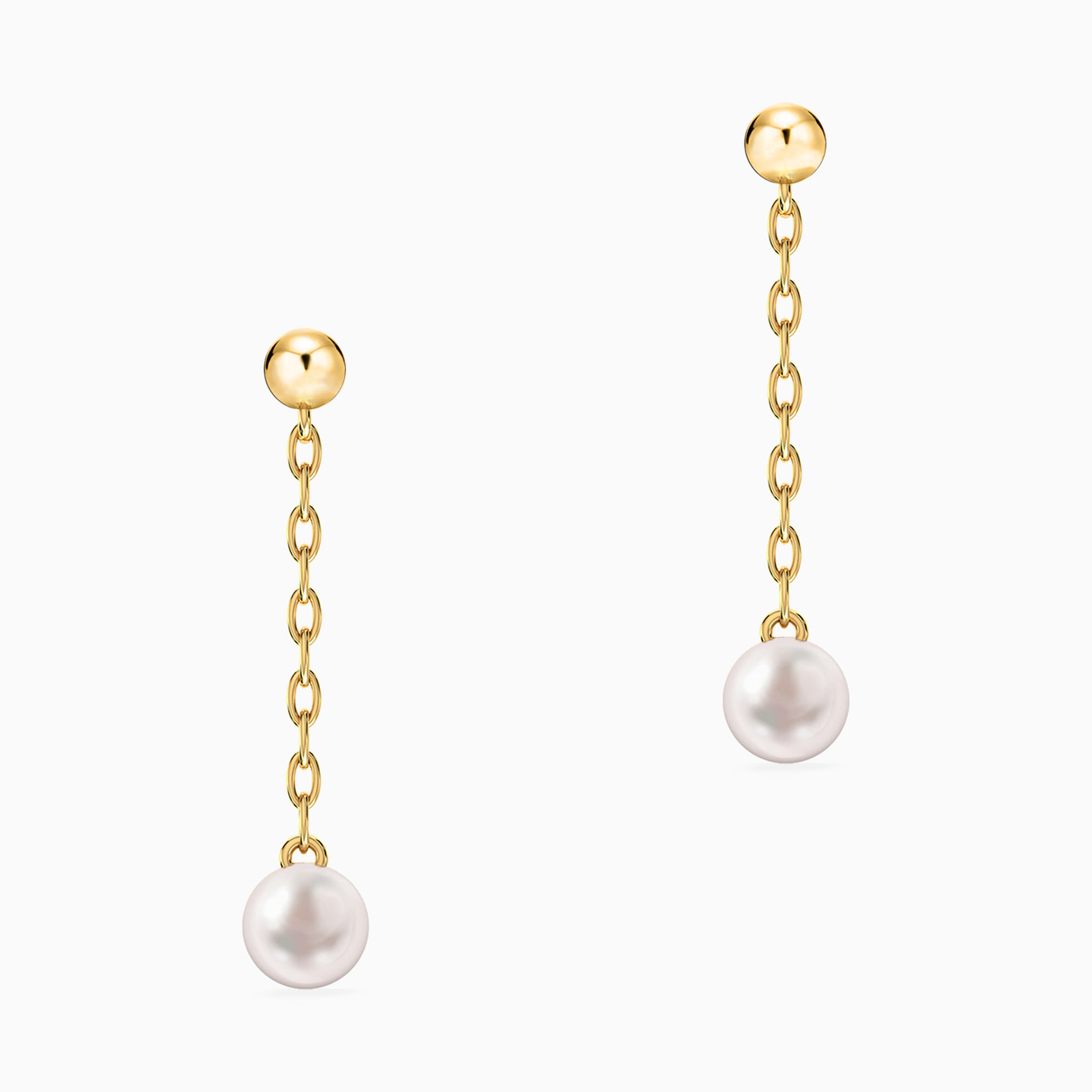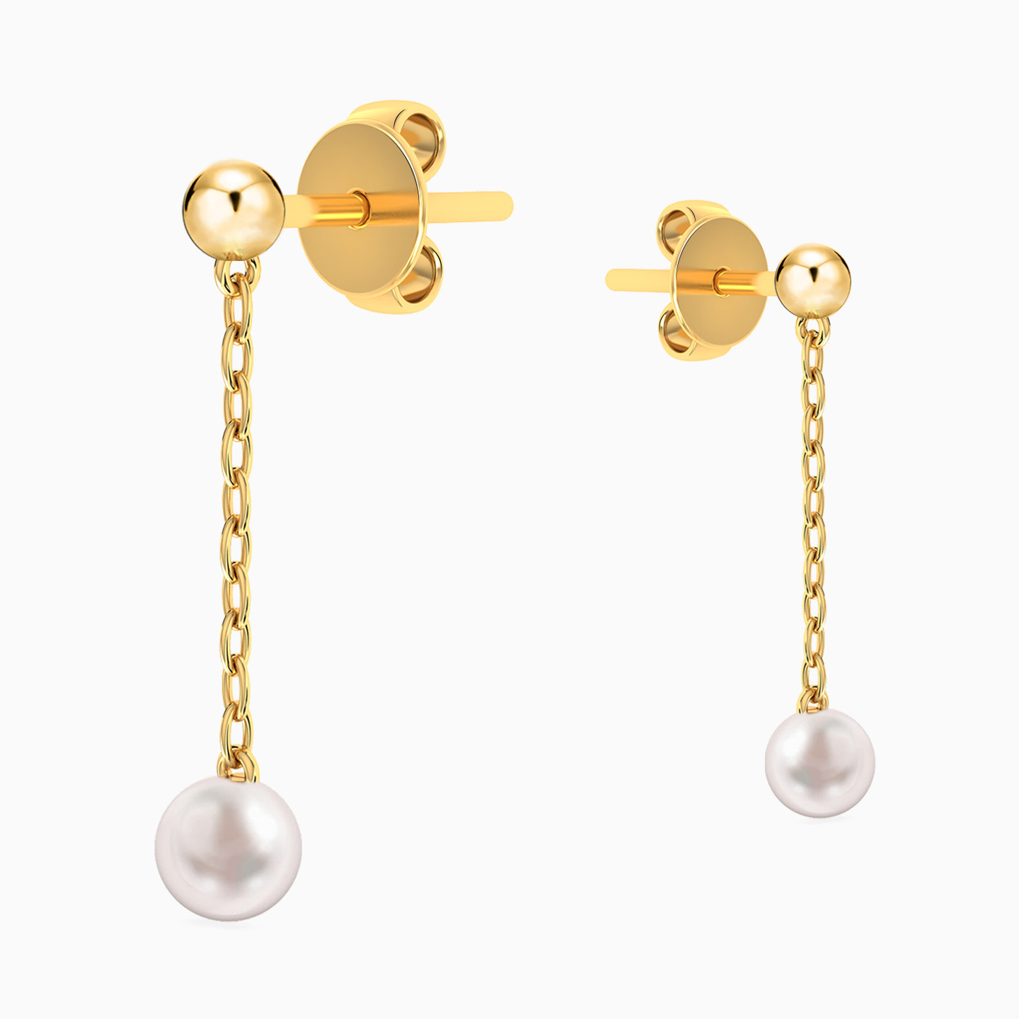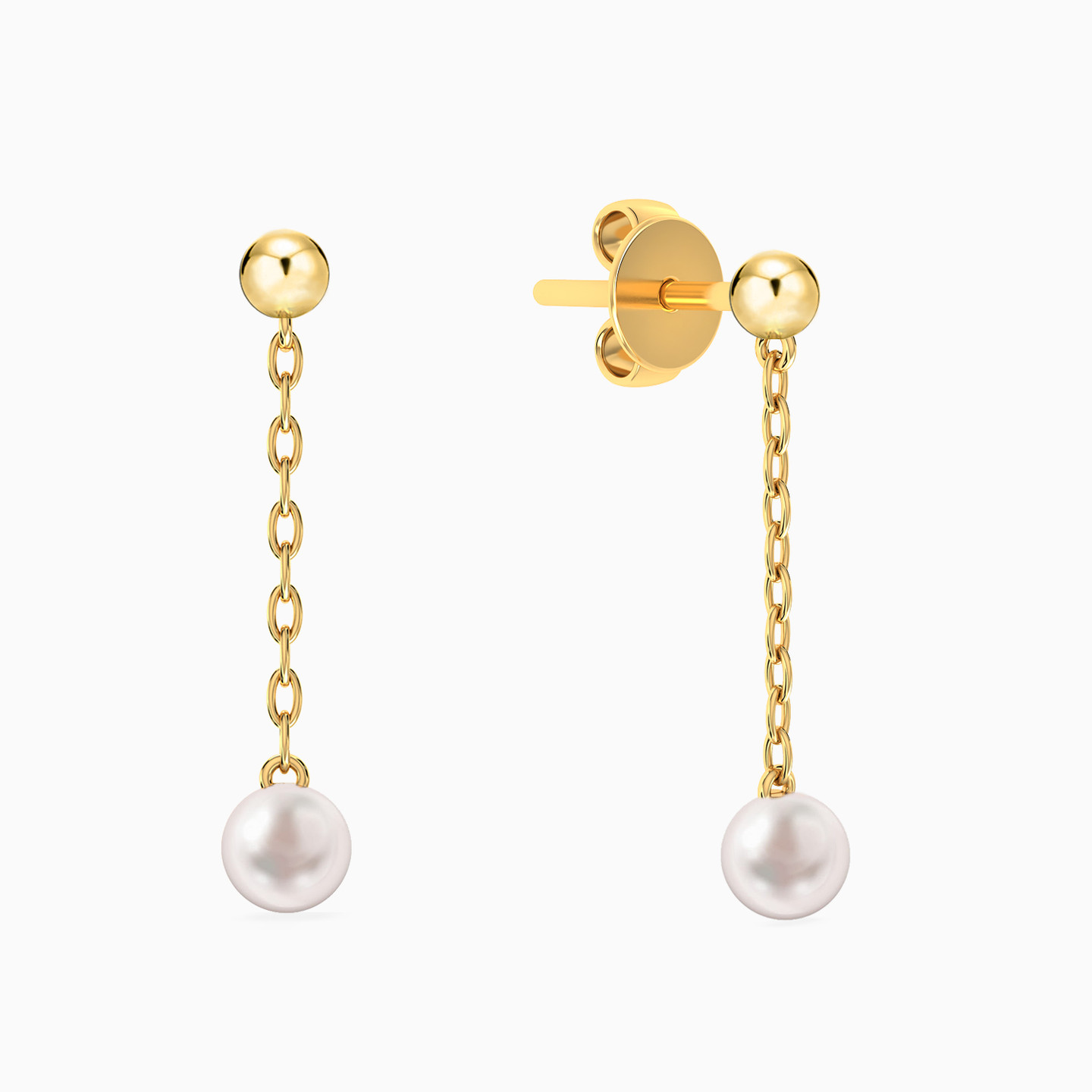 Nothing defines class and elegance like pearls and these drop earrings from Miss L' are here to prove just that. Crafted from the finest 14-karat yellow gold, these drop earrings feature a classic round yellow gold base with a delicate chain links dangle that is completed with a pristine and beautiful round-shaped pearl at the end. These earrings are designed to match your every movement.