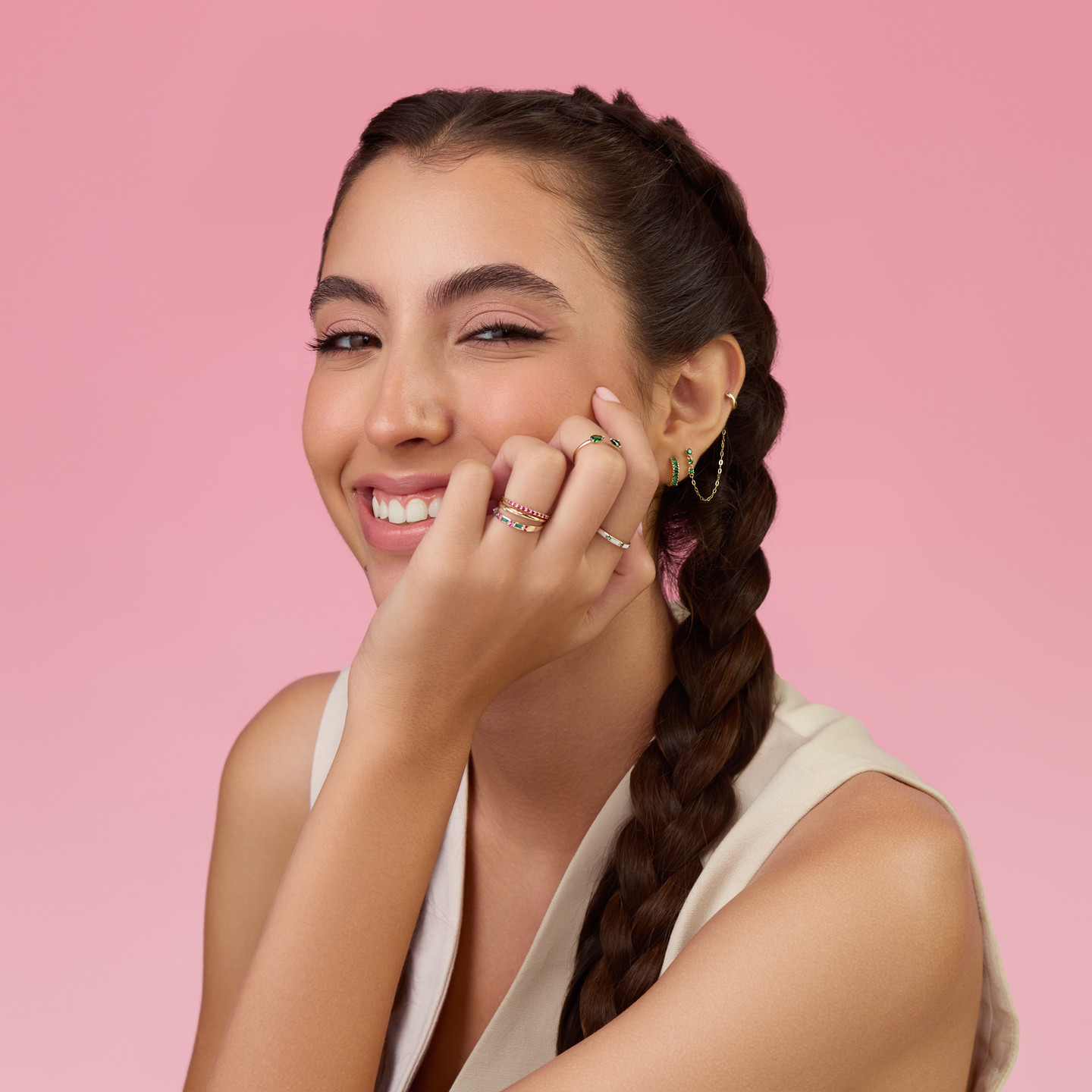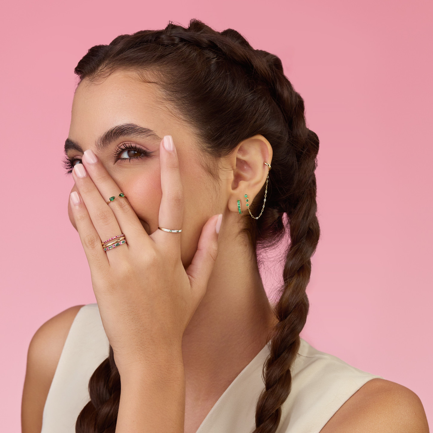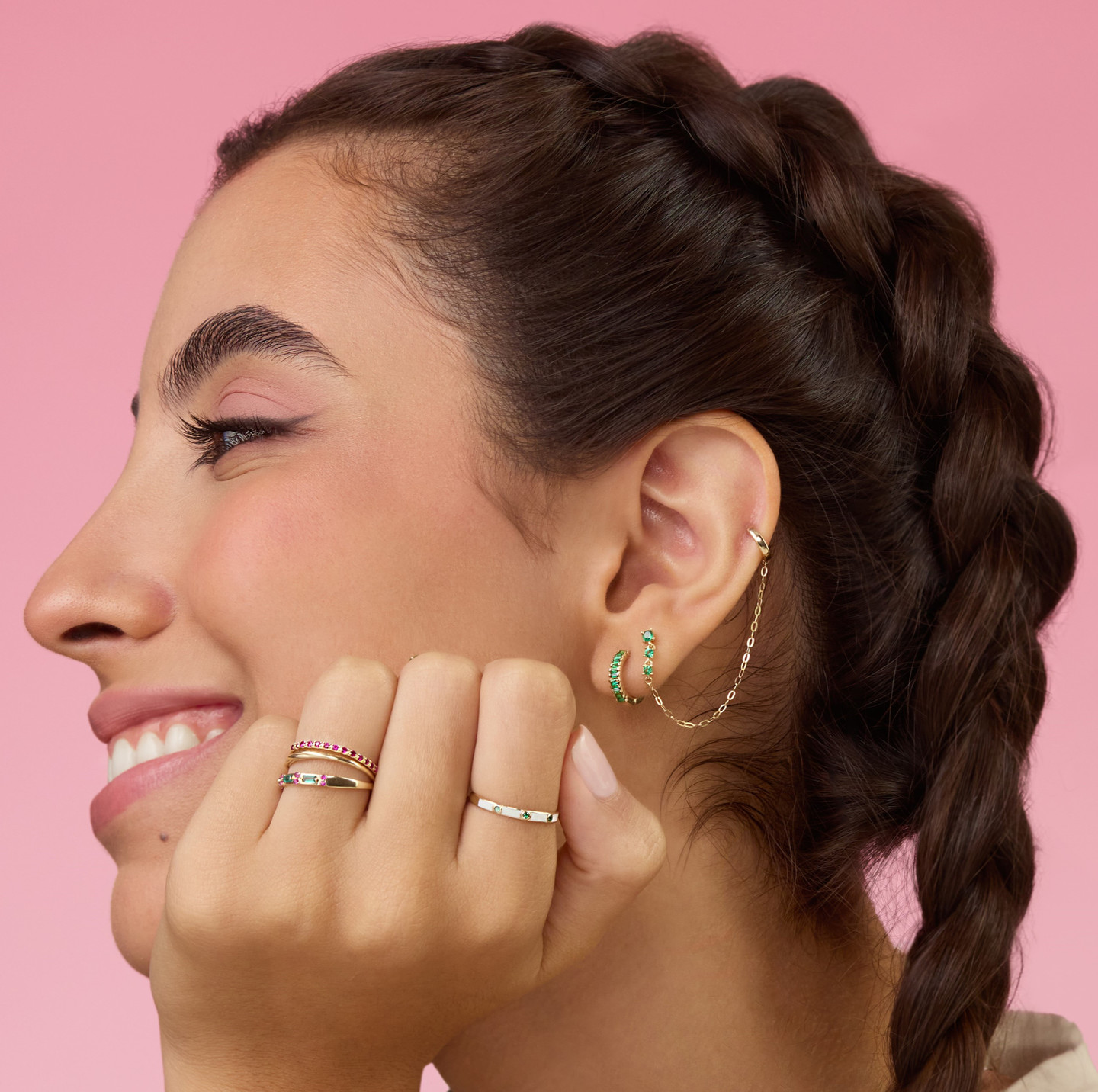 Add texture, color and style to your look by wearing this trendsetting stack earring from Miss L'. Elegant round colored stones, a dainty long chain and 14-karat yellow gold hoop give you several styling options. Perfect for giving your outfits an additional edge, this chic drop earring transforms every look.