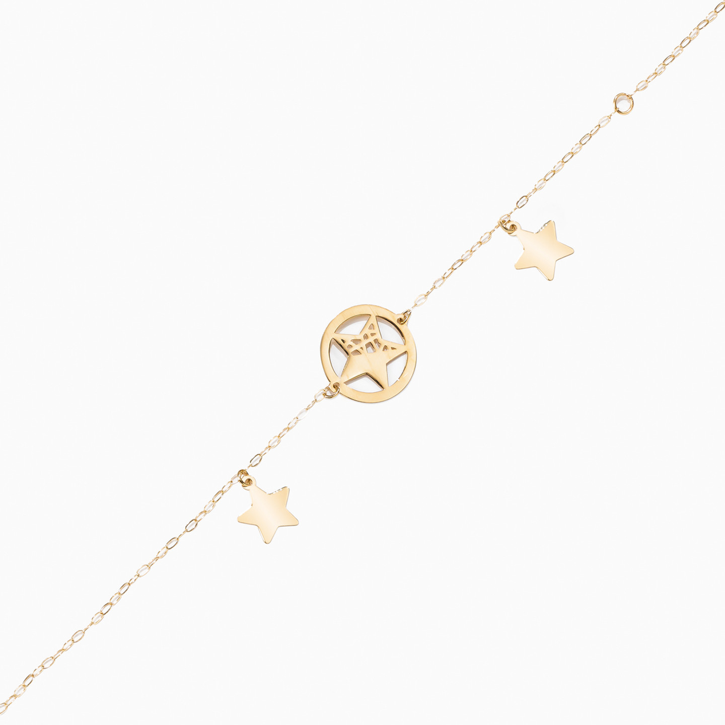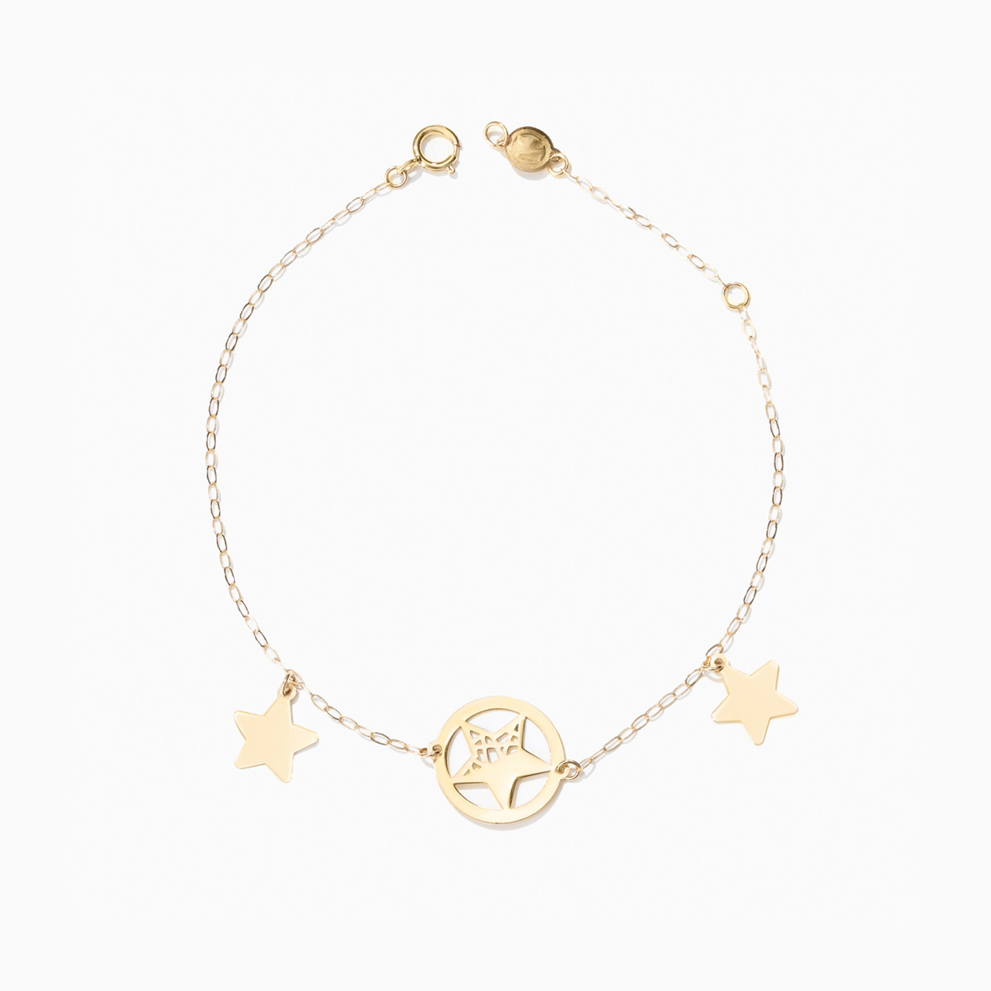 Shine with celestial brilliance by wearing this eye-catching chain bracelet from Miss L'. Two solid stars shimmer on each side of a round charm with openwork star motif at the center, giving this beautiful bracelet its mesmerizing alure. Cast in 18-karat yellow gold, this piece works beautifully to elevate your daytime looks. We suggest wearing this feminine bracelet with the matching necklace to add a charming touch to any outfit.