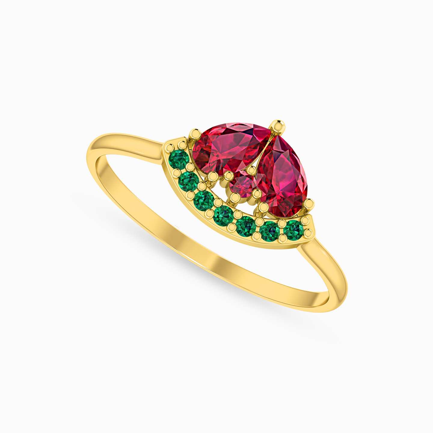 Indulge in a tropical treat with this 18-karat yellow gold watermelon ring from L’azurde Instyle. We love the deep red and green stones that make up the centerpiece and sit prominently on the slim yellow gold band. Wear this with your evening attire for an incredible shine.