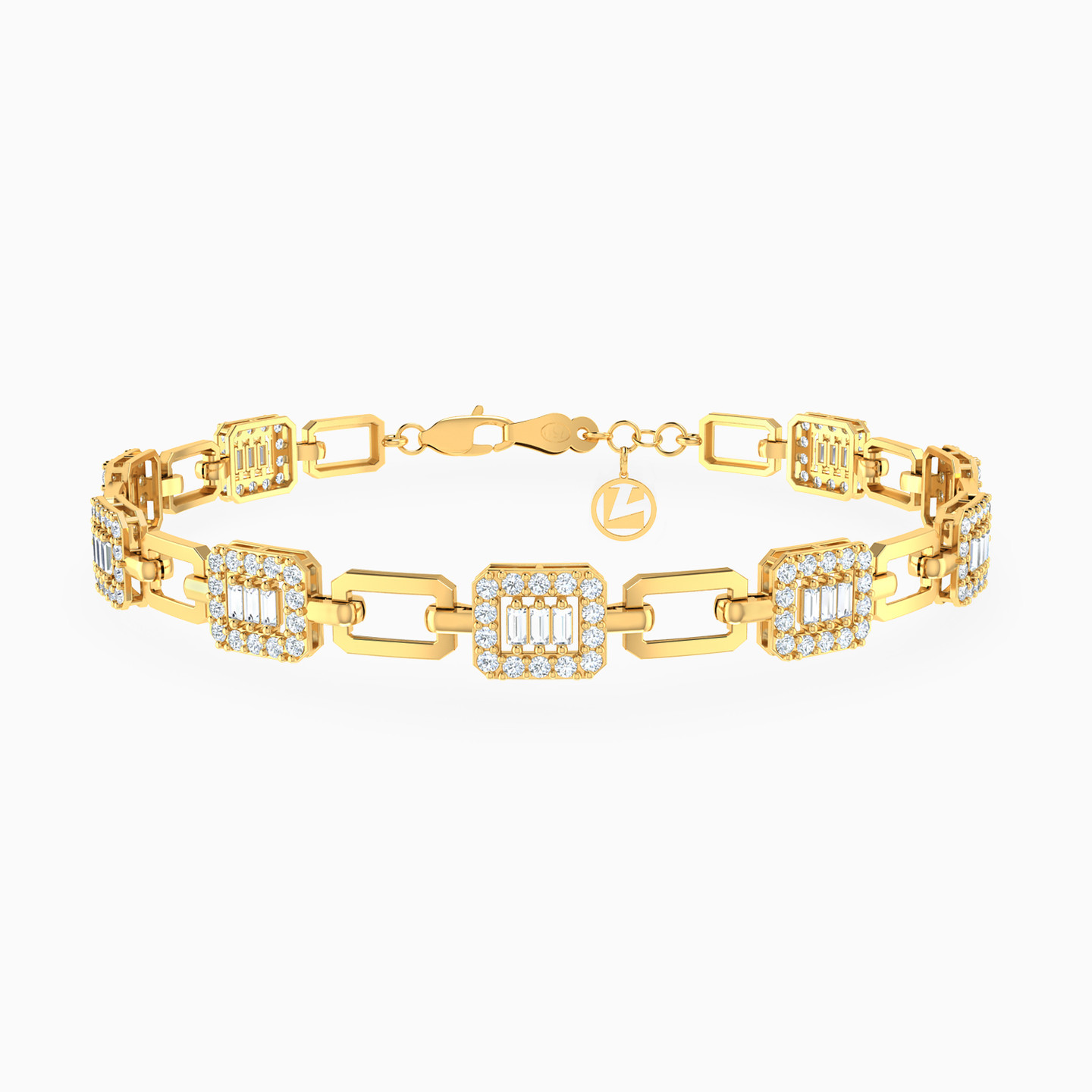 This 18-karat yellow gold chain bracelet from L'azurde Gold is a geometric marvel that's equal parts chic and charming! It features hexagon-shaped frames lined with sparkling round cubic zirconia and each frame cradles three baguette-shaped cubic zirconia stones, alternating with smaller hexagon-shaped frames with a shiny mirror finish, creating a dazzling tapestry of glamour. Style this chain bracelet with a hexagon pendant necklace for a dazzling look.