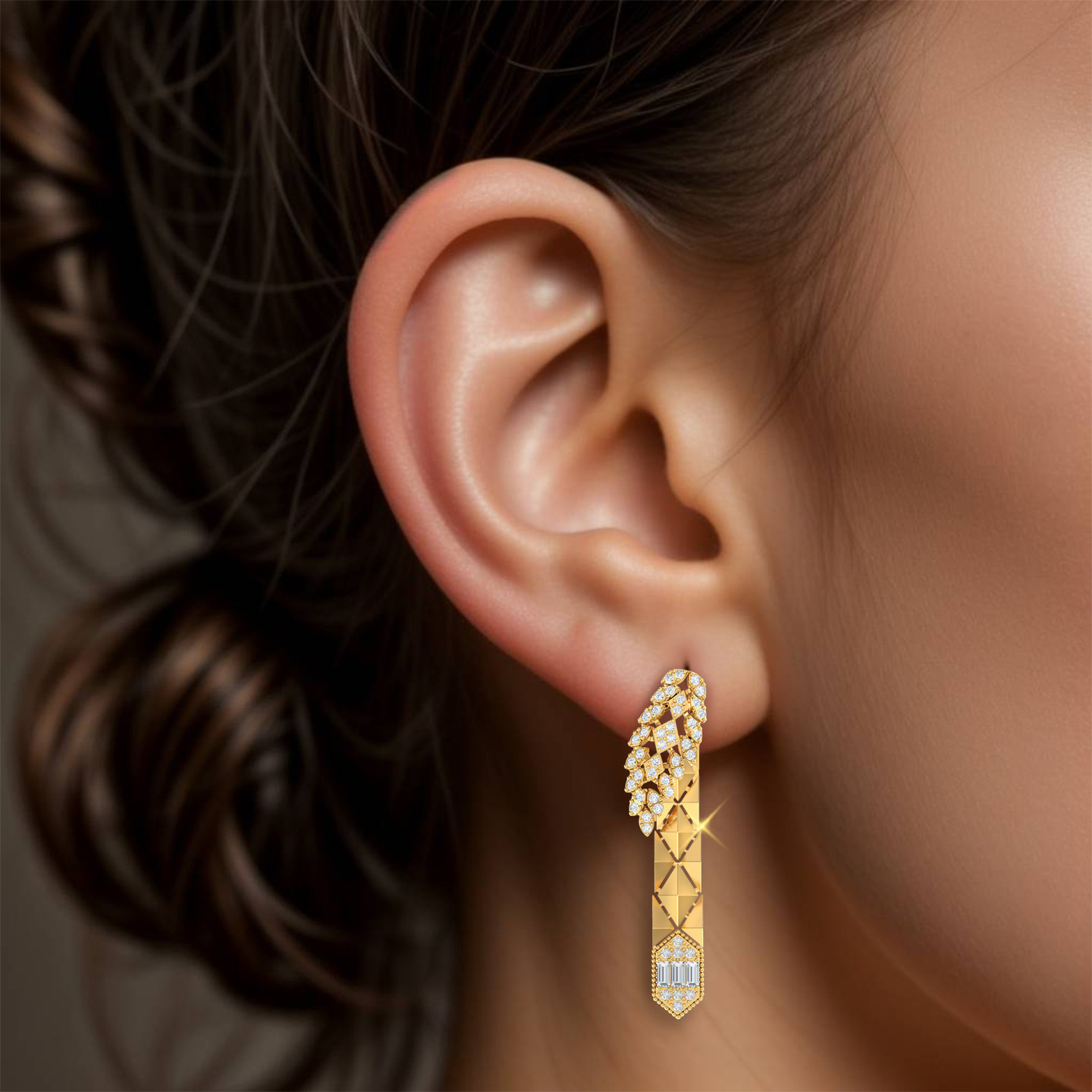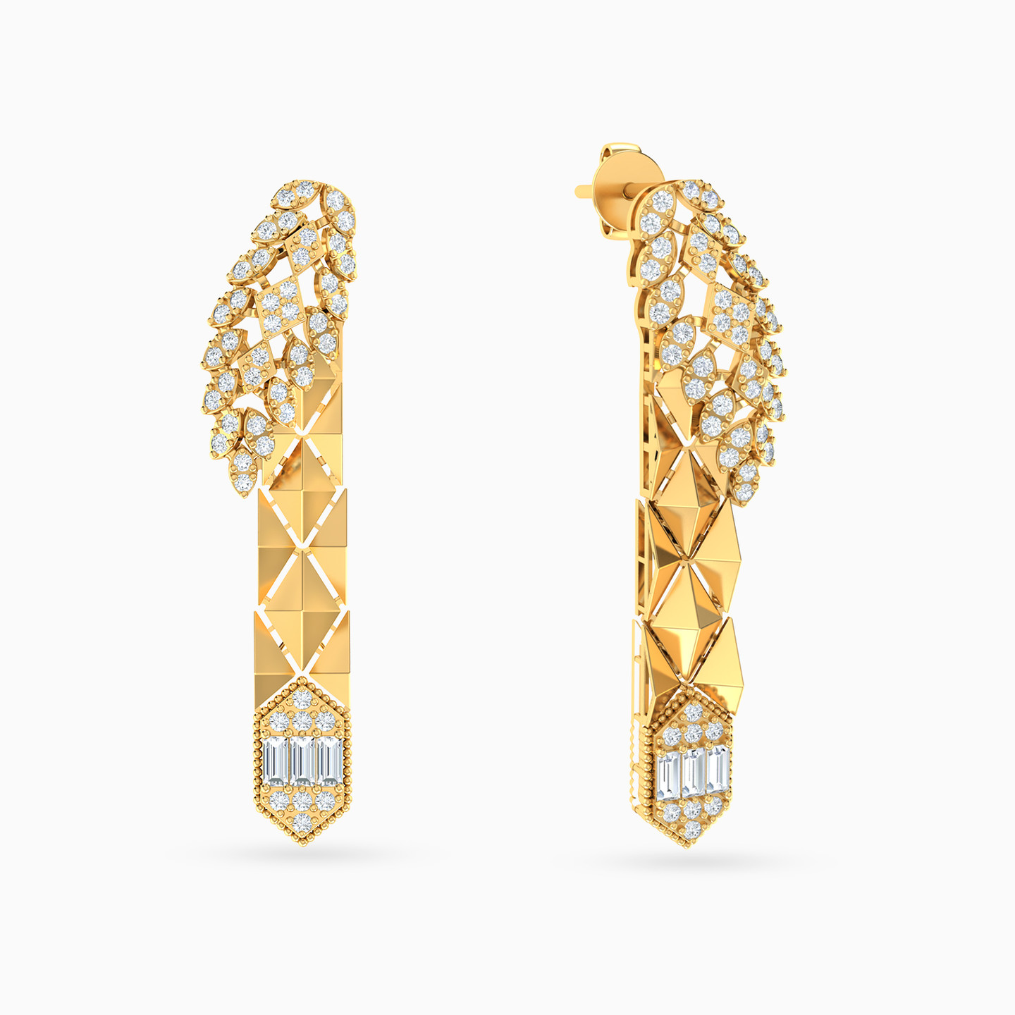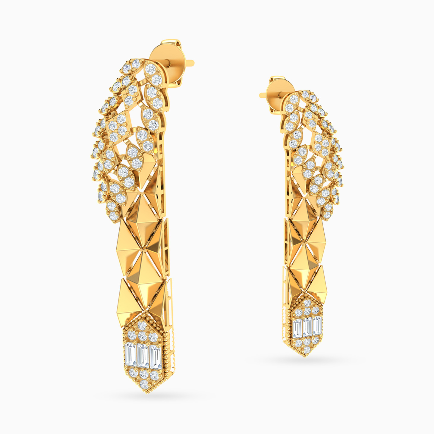 We are redefining glam with these stunning drop earrings from L'azurde Gold. Crafted from 18-karat yellow gold, these beauties feature an abstract shape with sparkling round-shaped cubic zirconia stones, sharp edges, an eye-catching dangle adorned with tiny gold beads and more sparkly cubic zirconia. Simply stunning! These drop earrings are just what you need for any special occasion.