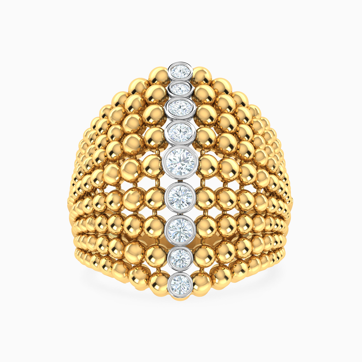 A dazzling symphony of design, this 18-karat yellow gold statement ring from L'azurde Gold is a true masterpiece that captures the essence of opulence and luxury. It features nine rows meticulously crafted with beautiful yellow gold beads, each row accentuated by a central round-shaped cubic zirconia stone bezel set in lustrous 18-karat white gold. With its stunning arrangement and the sparkle of cubic zirconia, this ring is the perfect accessory for those who seek to make a bold and glamorous fashion statement.