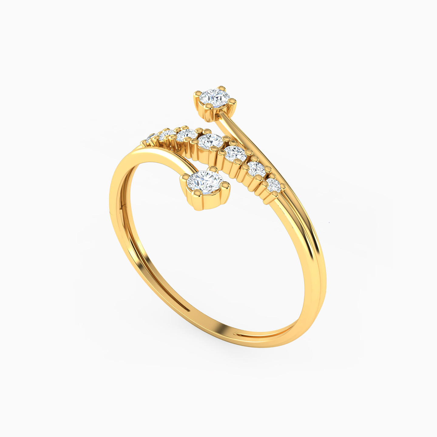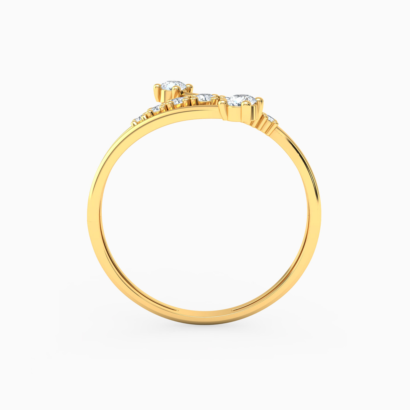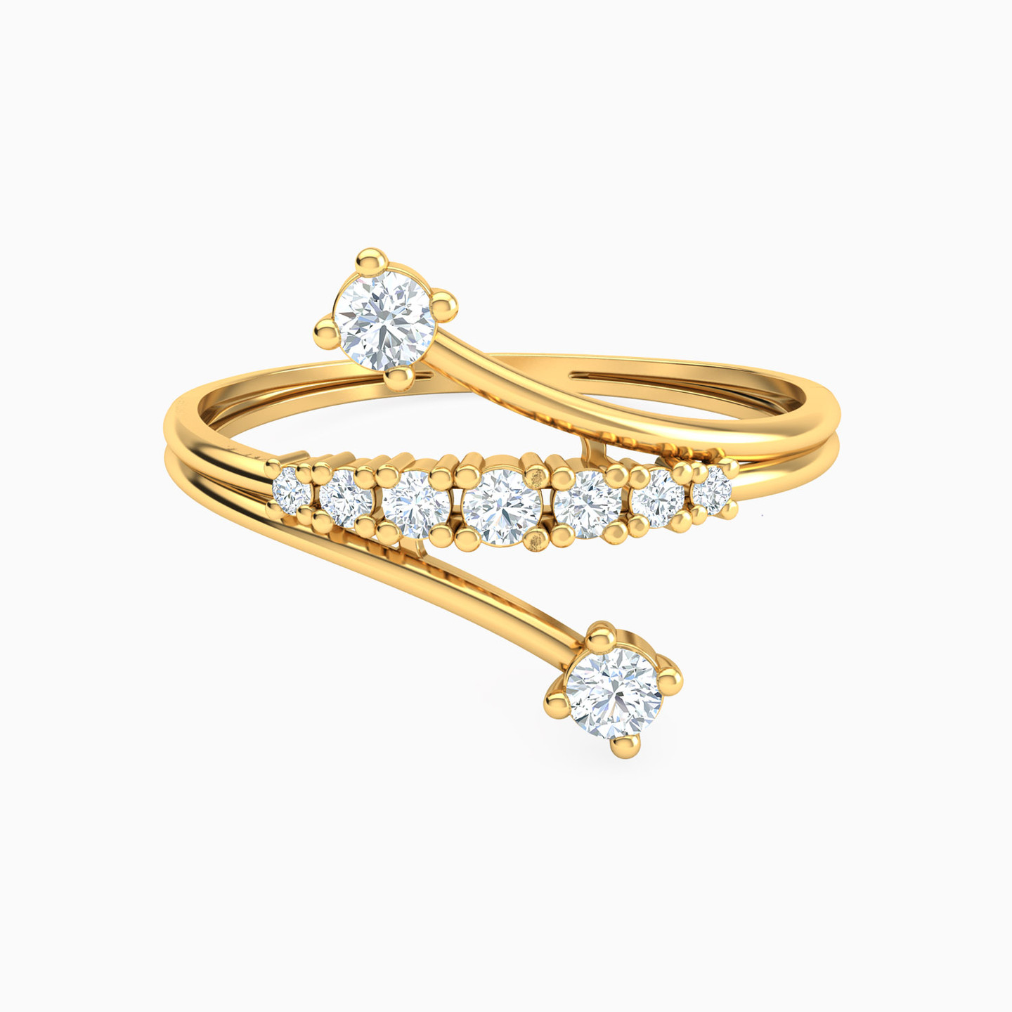 This 18-karat yellow gold statement ring from L'azurde Gold is a whimsical dance of design and sparkle! The sleek band takes center stage adorned with seven round-shaped cubic zirconia set on prongs and framed by swirling waves, creating a captivating focal point that radiates brilliance. For a chic and playful look, pair this stunning ring with outfits that mirror the fluidity of its design, letting the waves and sparkle make a statement that effortlessly turns heads.