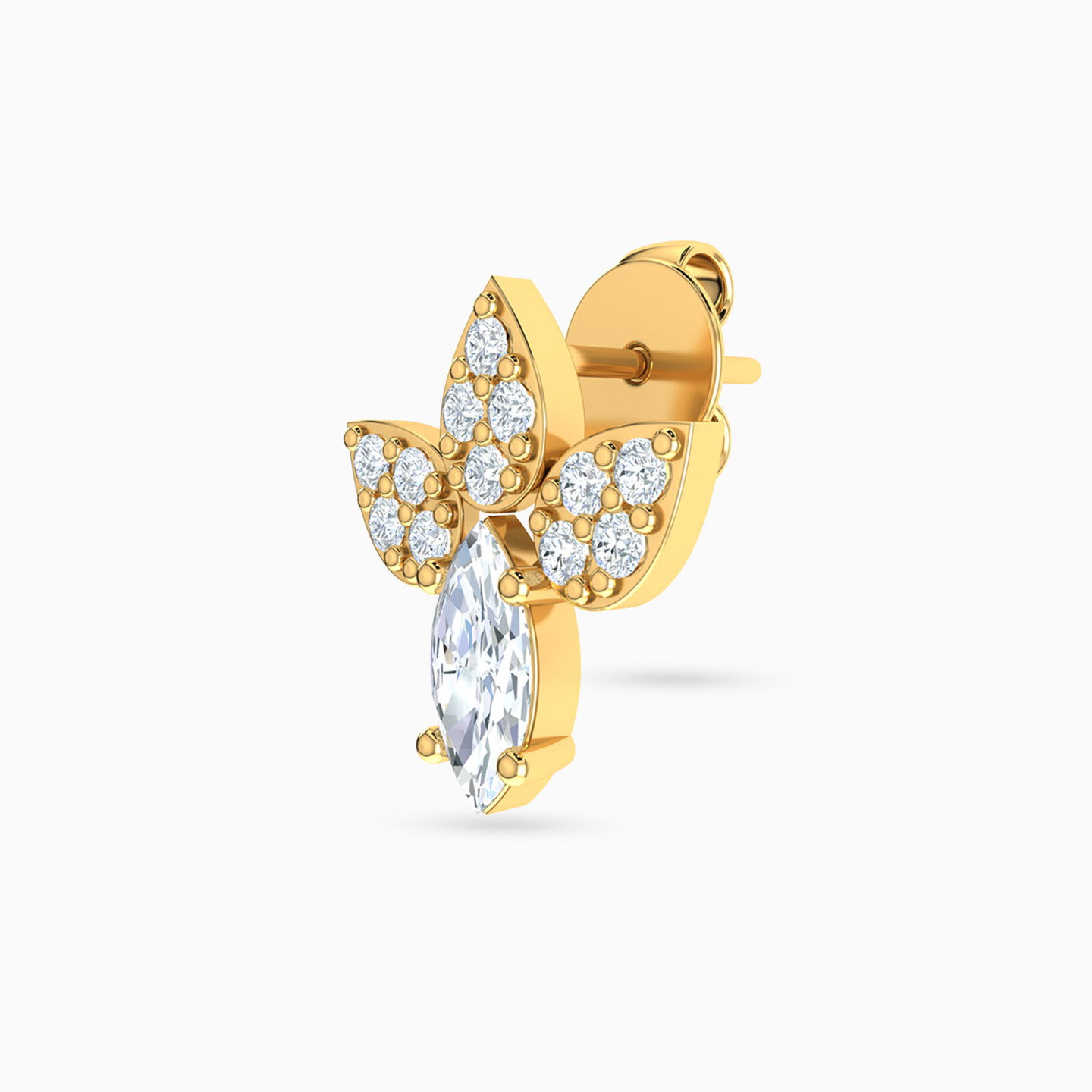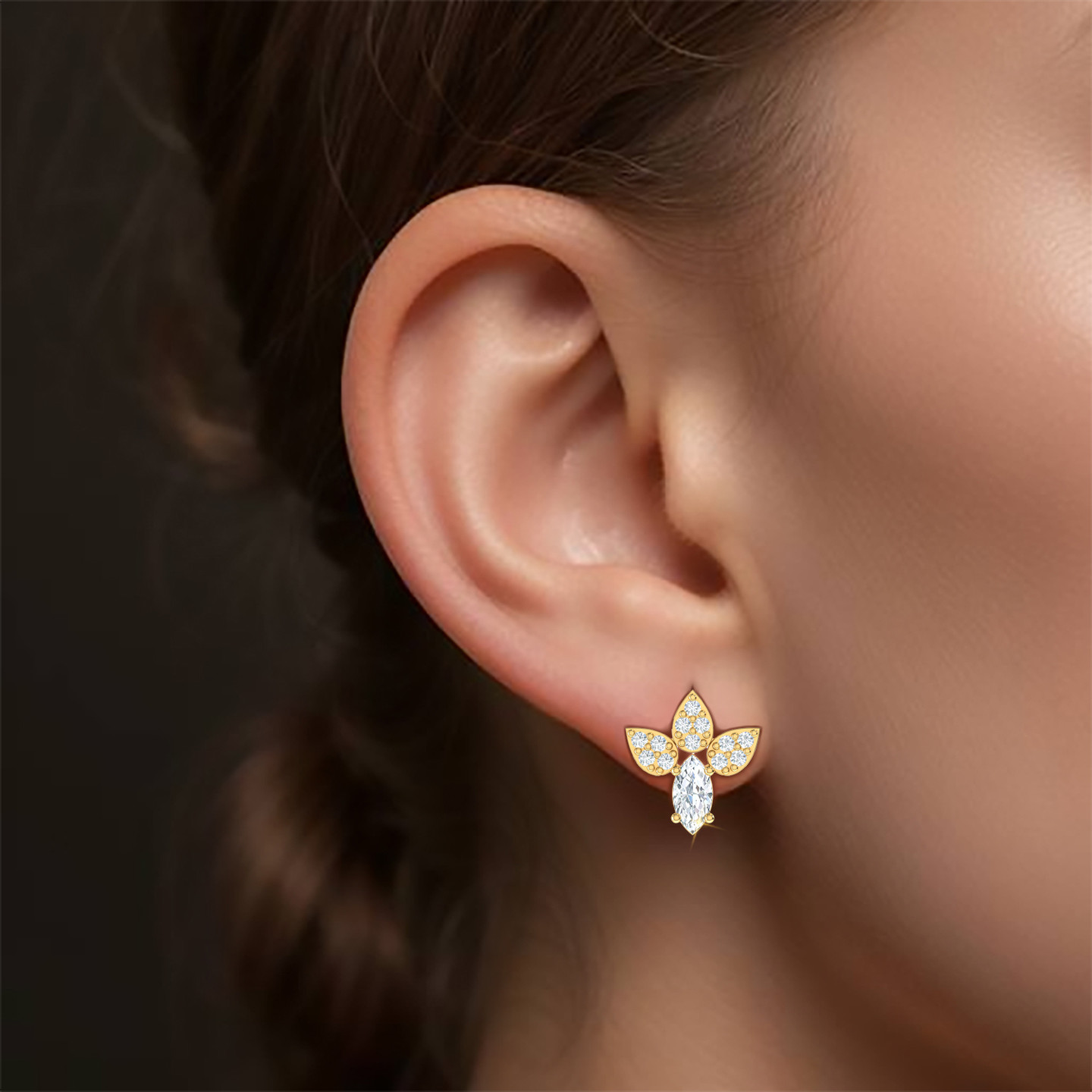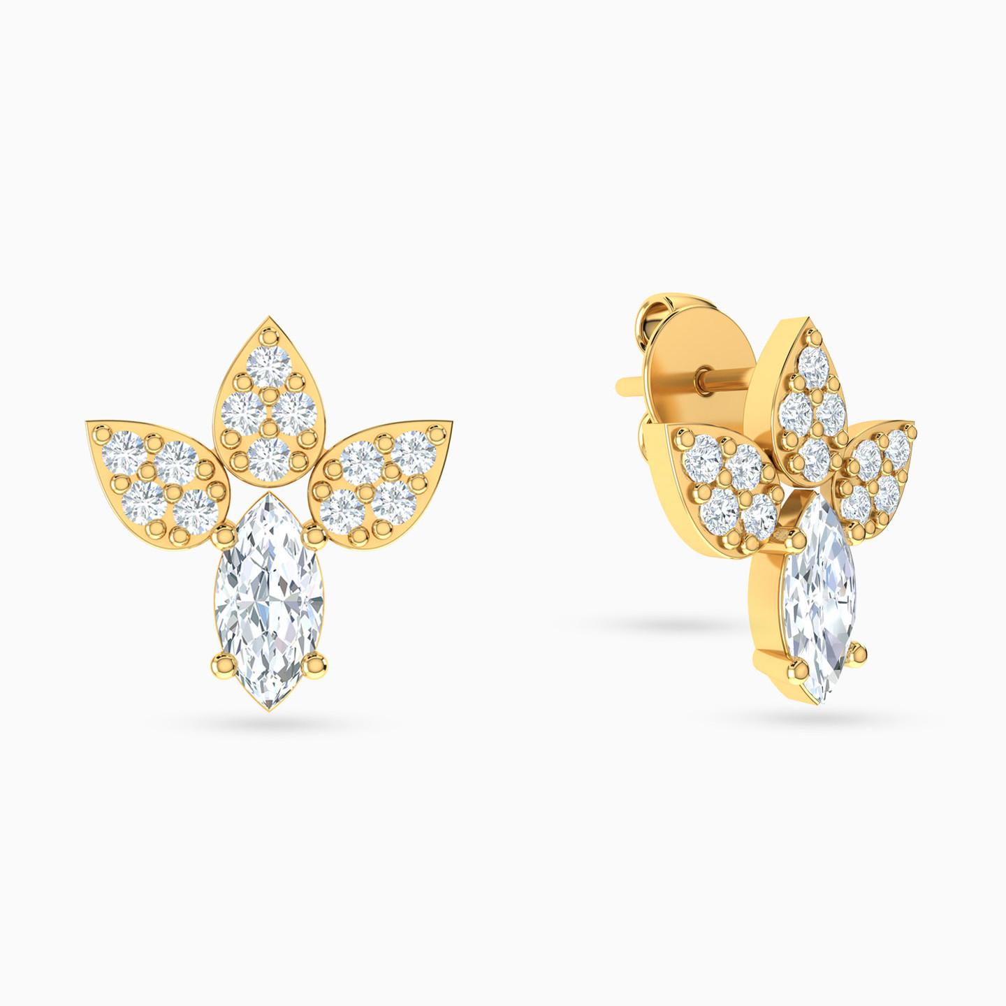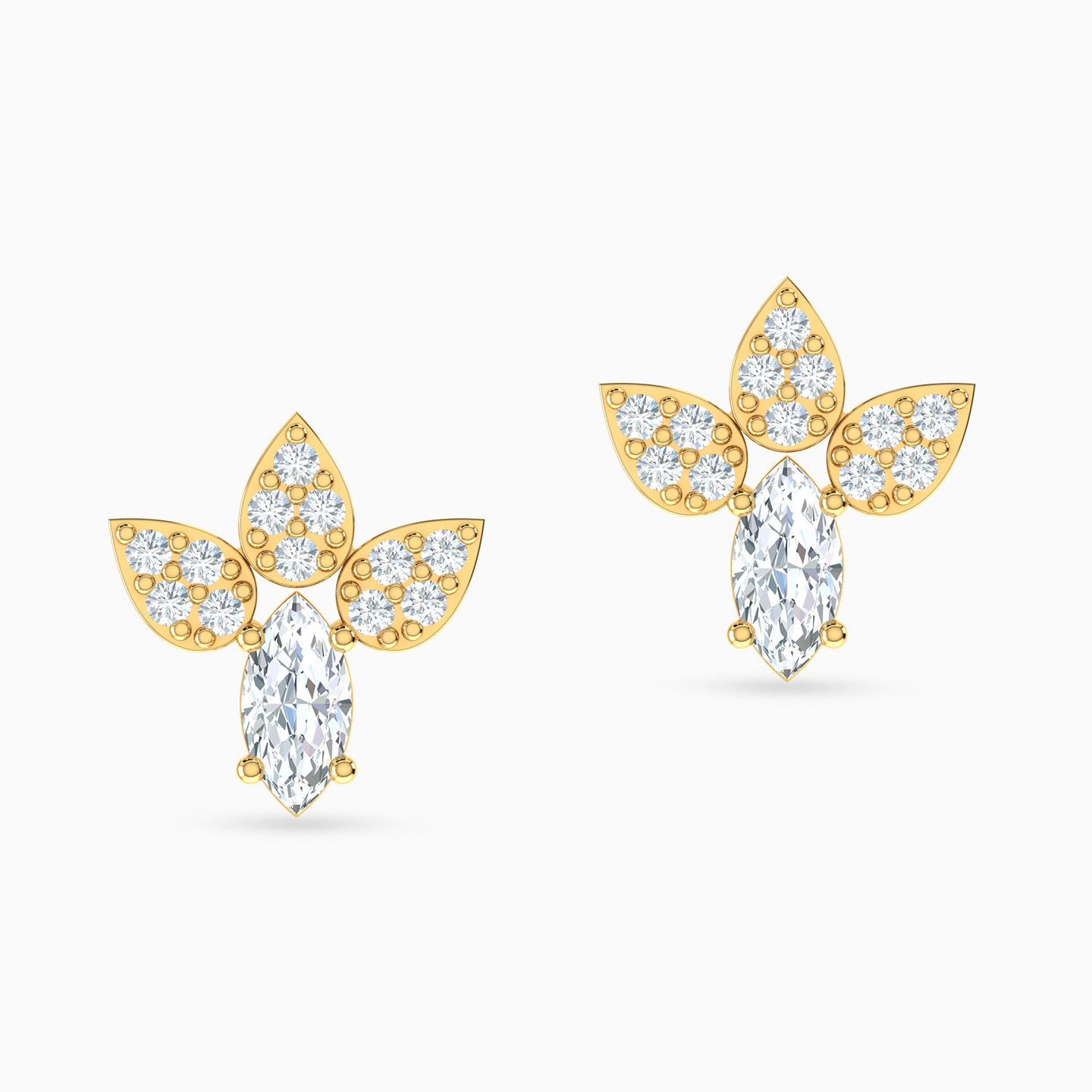 Want a pair of studs that will instantly captivate any onlooker? Then we have just the pair for you! These studs by L’azurde Gold feature a sparkling marquise-shaped cubic zirconia prong set in the center and adorned with three pear-shaped cubic zirconia studded motifs on top. Crafted from 18-karat yellow gold, these studs are perfect for any occasion - workday or day out.