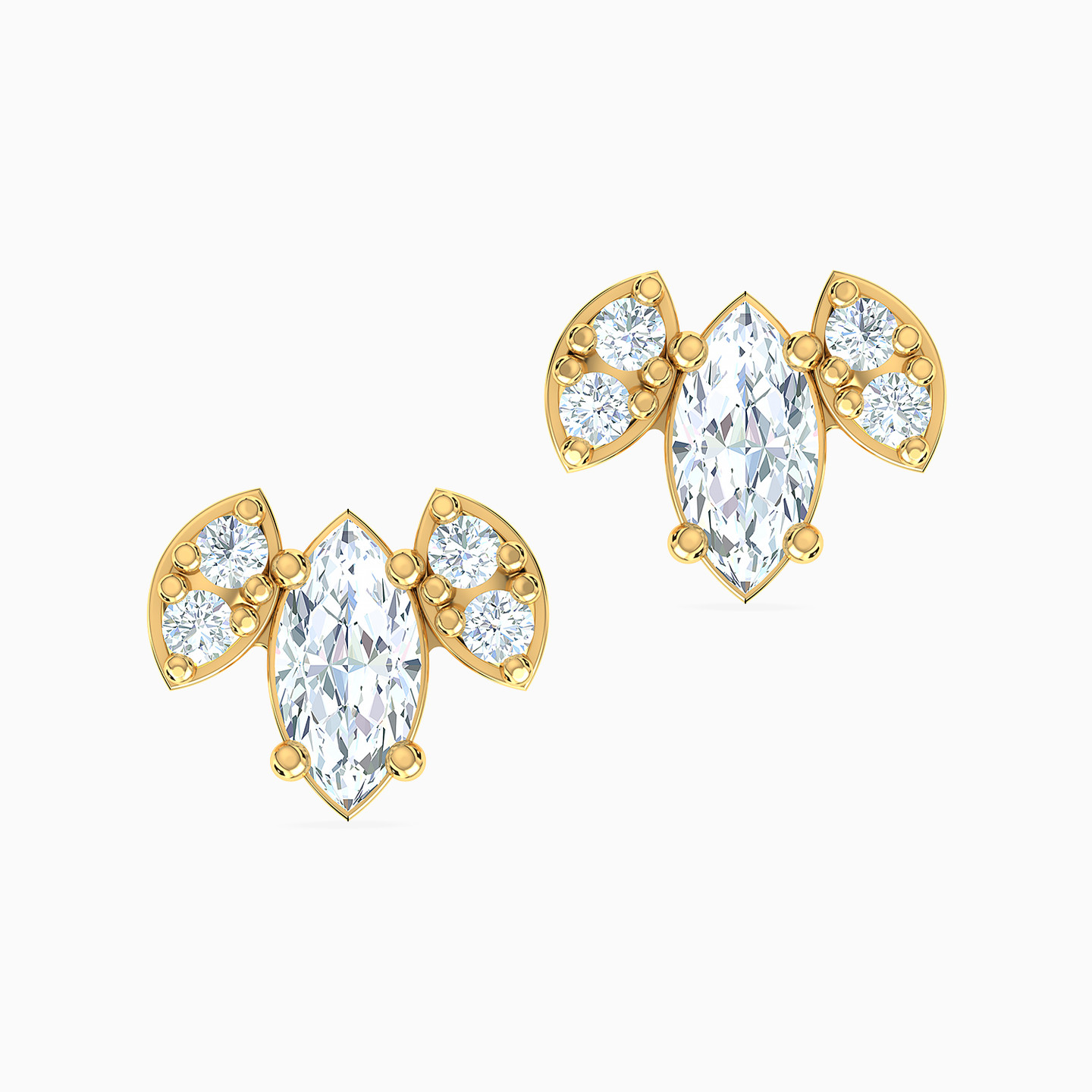 A uniquely designed pair of studs by L’azurde Gold that are perfect for making a statement. These studs feature a dazzling marquise-cut cubic zirconia in the center that is flanked by a marquise-shaped studded motif on either side and set in 18-karat yellow gold. Perfect for styling with a gorgeous cocktail dress.