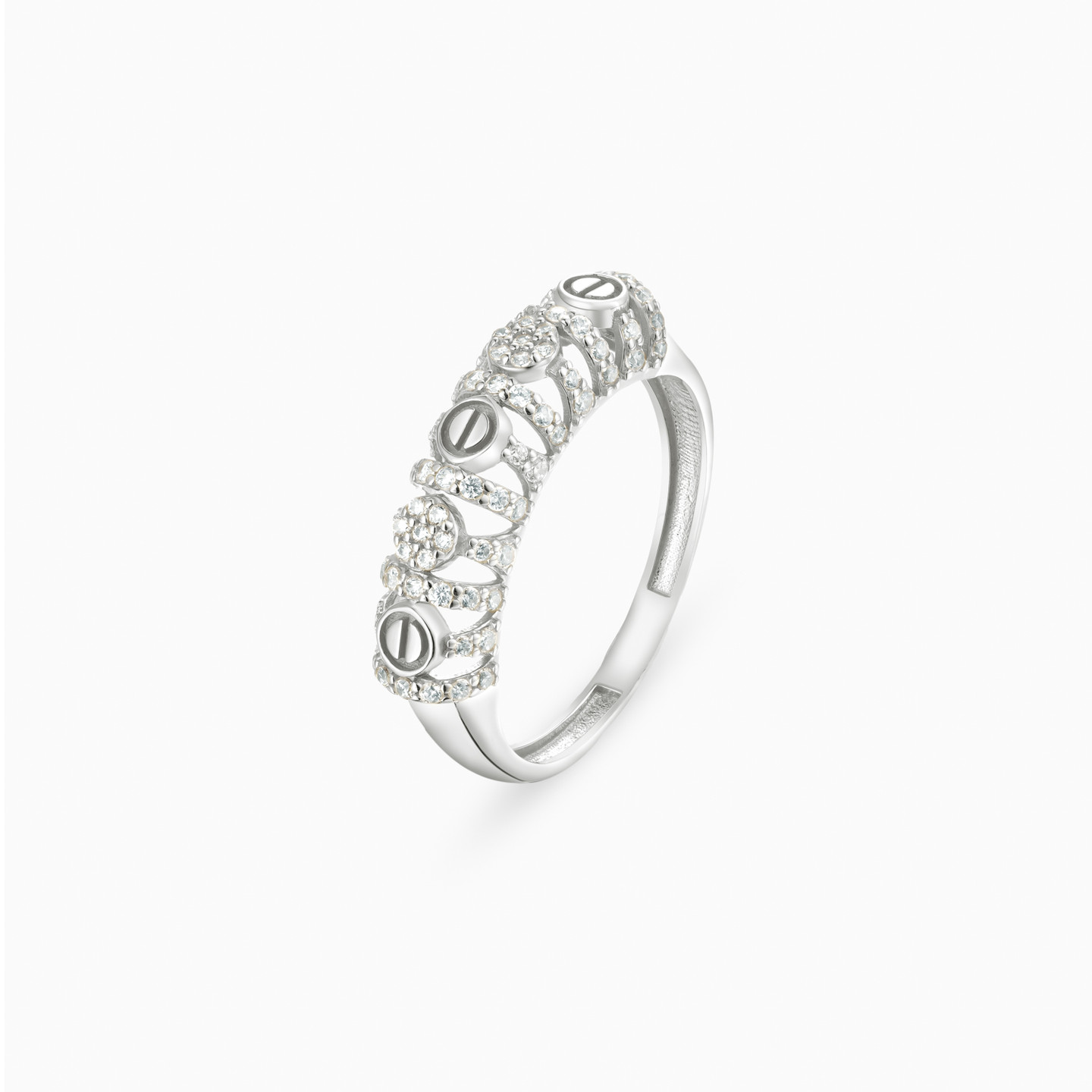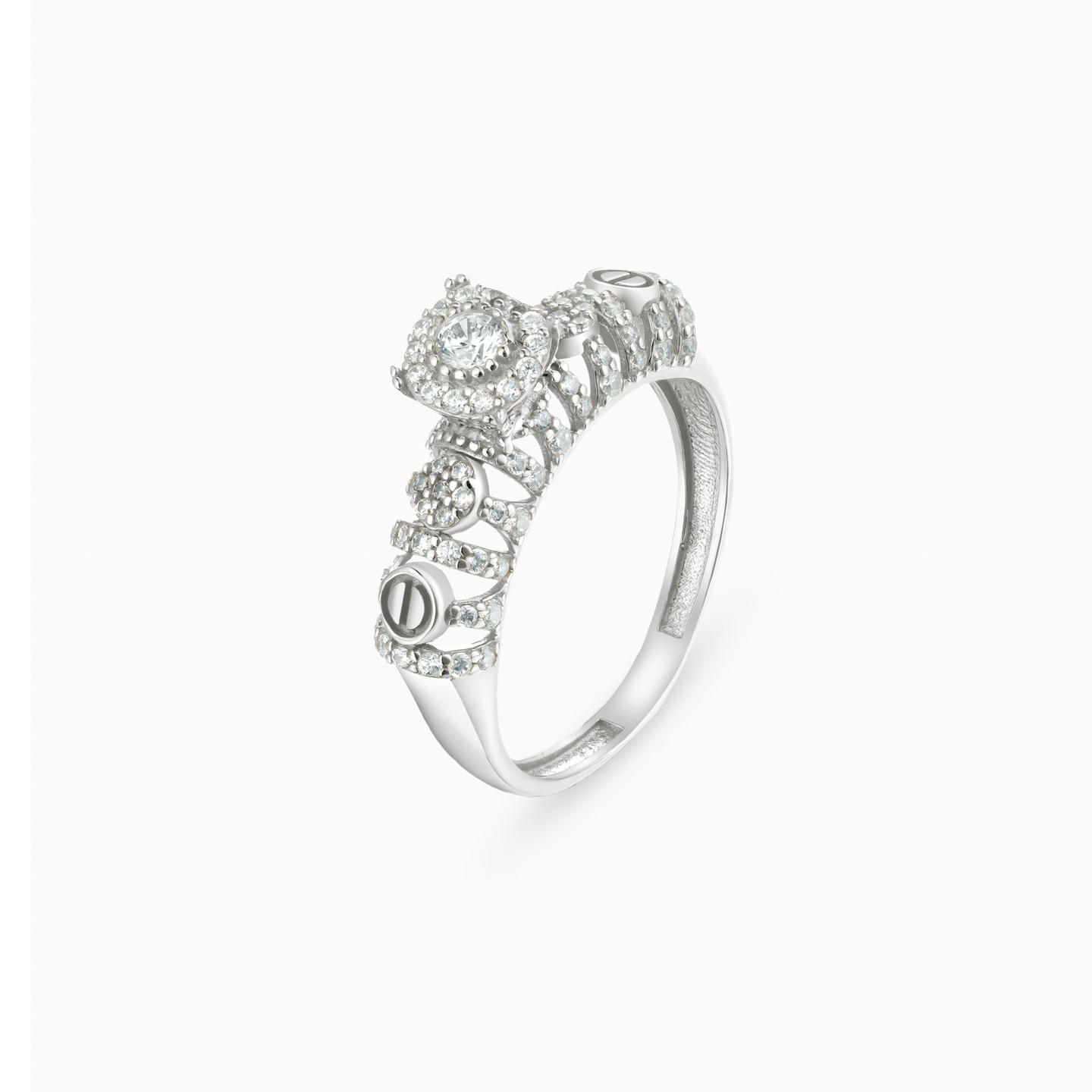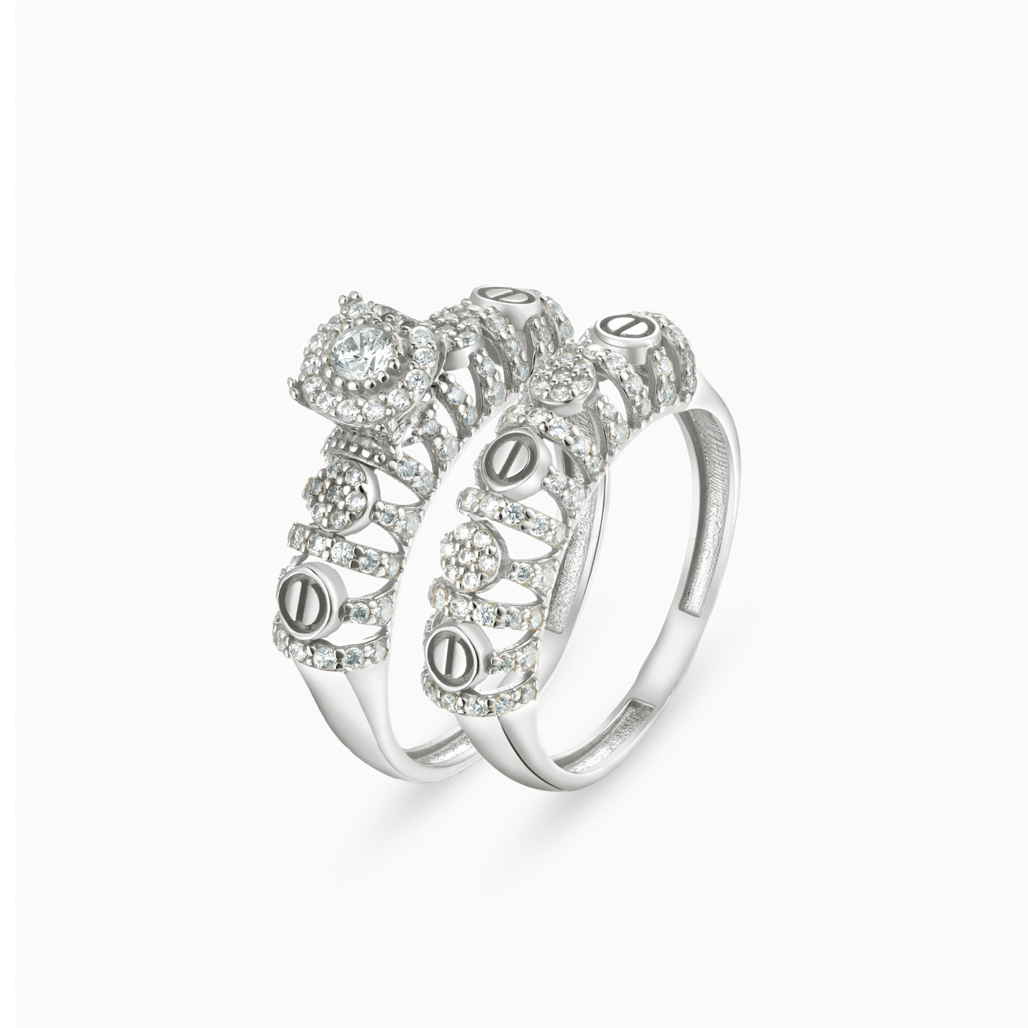 A twin ring set that blends sculpted detail with radiant sparkle. Crafted in Lazurde Gold’s white gold finish, the two bands feature intricate openwork patterns adorned with pavé-set cubic zirconia, while one band is crowned with a luminous cushion-shaped cluster. Artistic and expressive, this pair makes a meaningful gift—celebrating elegance, individuality, and a bond that lasts.