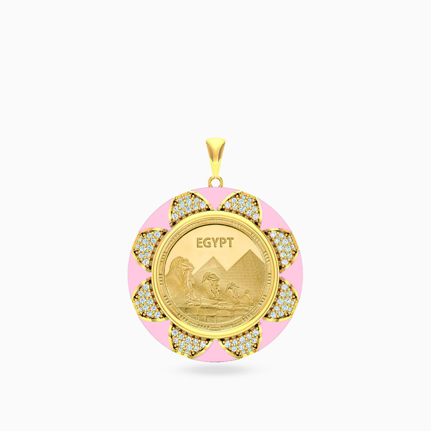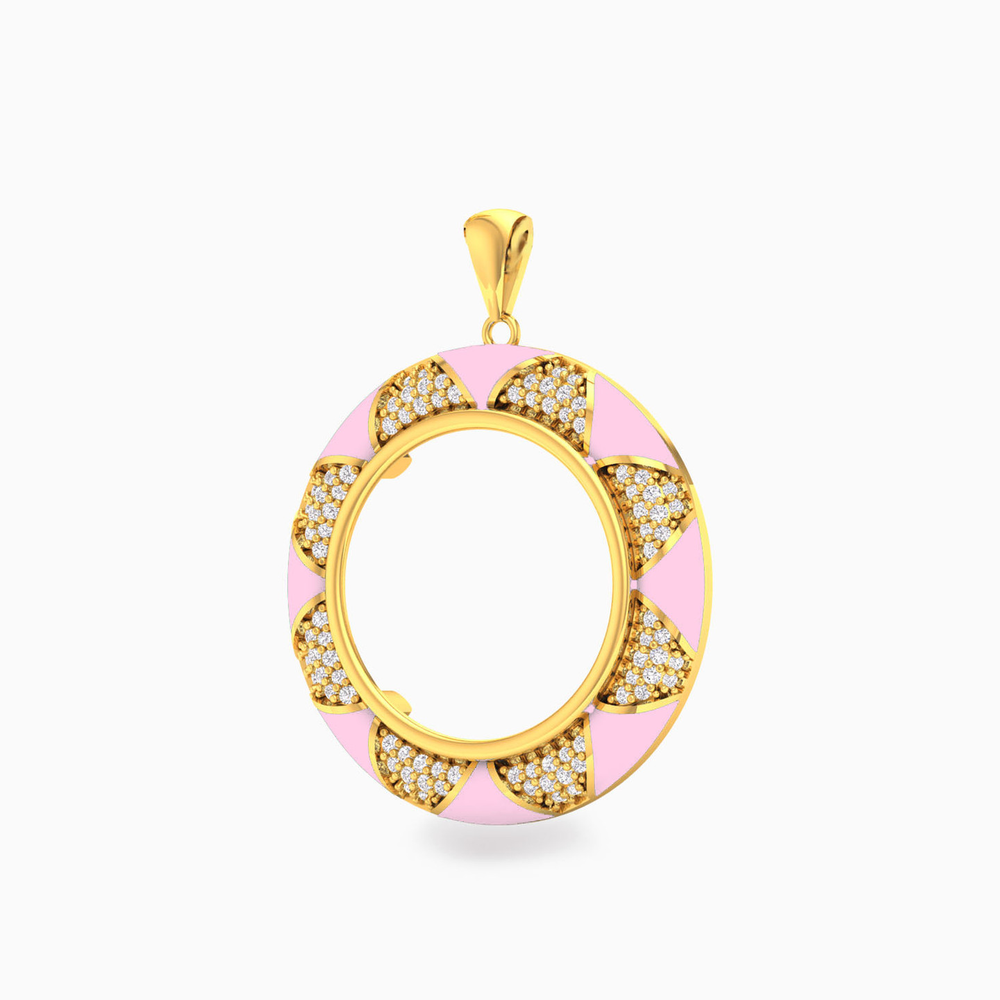 This 18-karat yellow gold pendant from L'azurde Gold is a wearable masterpiece that unveils the delicate beauty of a blooming flower. The wide circular frame to fit a gold coin gracefully, adorned with a soft blush pink enamel coating, gracefully entwines with captivating semicircle motifs, each adorned with meticulously set round-shaped colored stones. This enchanting piece effortlessly marries the warmth of gold with the gentle hues of blush pink, creating a breathtaking floral design that captures the essence of timeless elegance. A perfect pick for adding the right amount of sparkle and elegance to an outfit.