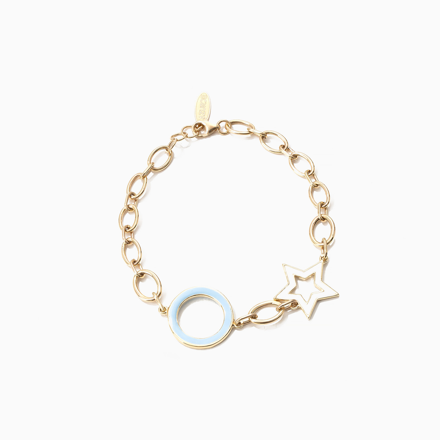 Shine like the star that you are by wearing this charming enamel coated chain bracelet from L'azurde Gold. This feminine bracelet features a baby blue enamel circle charm and white enamel star charm on a lovely 18-karat yellow gold oval link chain. We predict you'll reach for this stylish bracelet to add a pop of color and fun to casual and workday outfits.