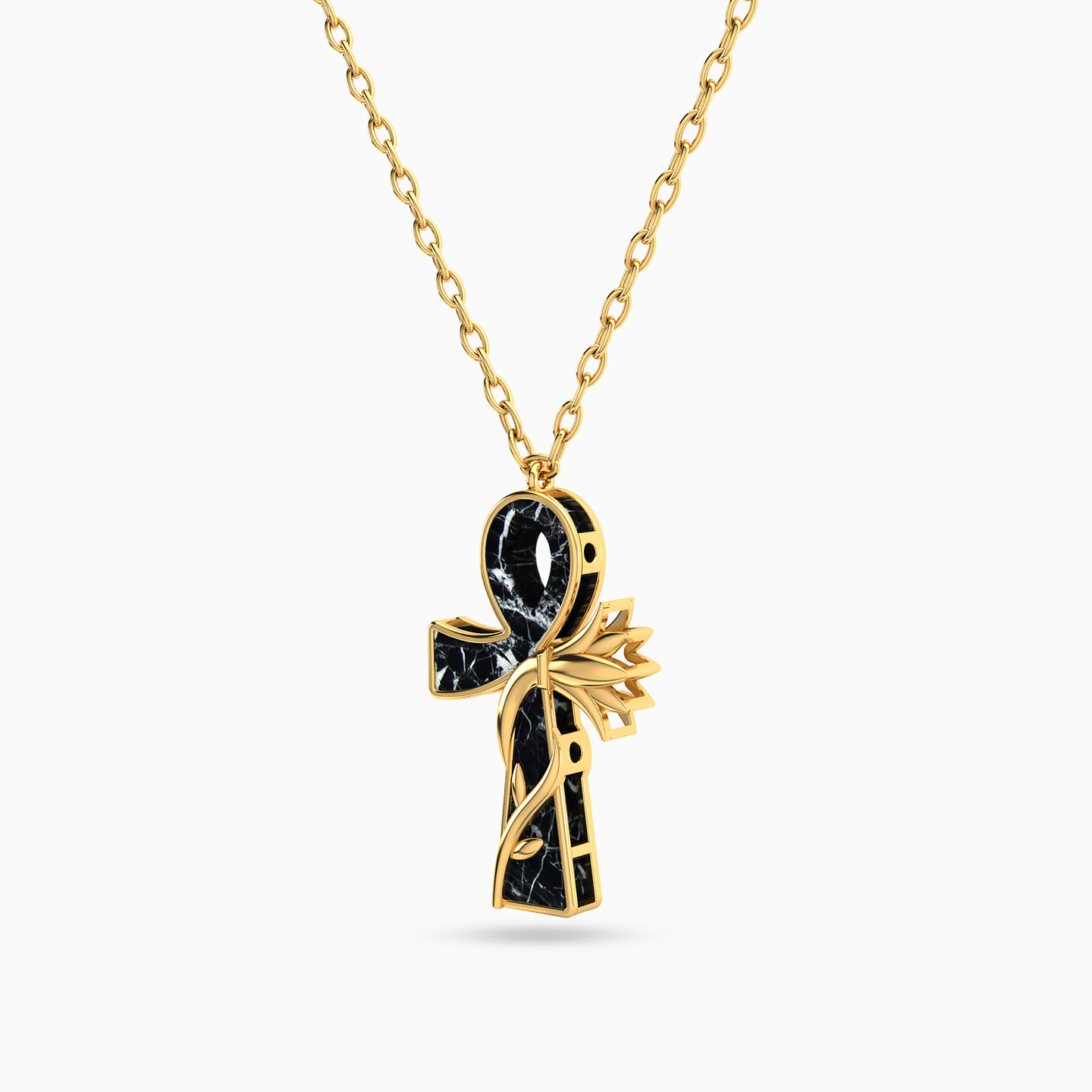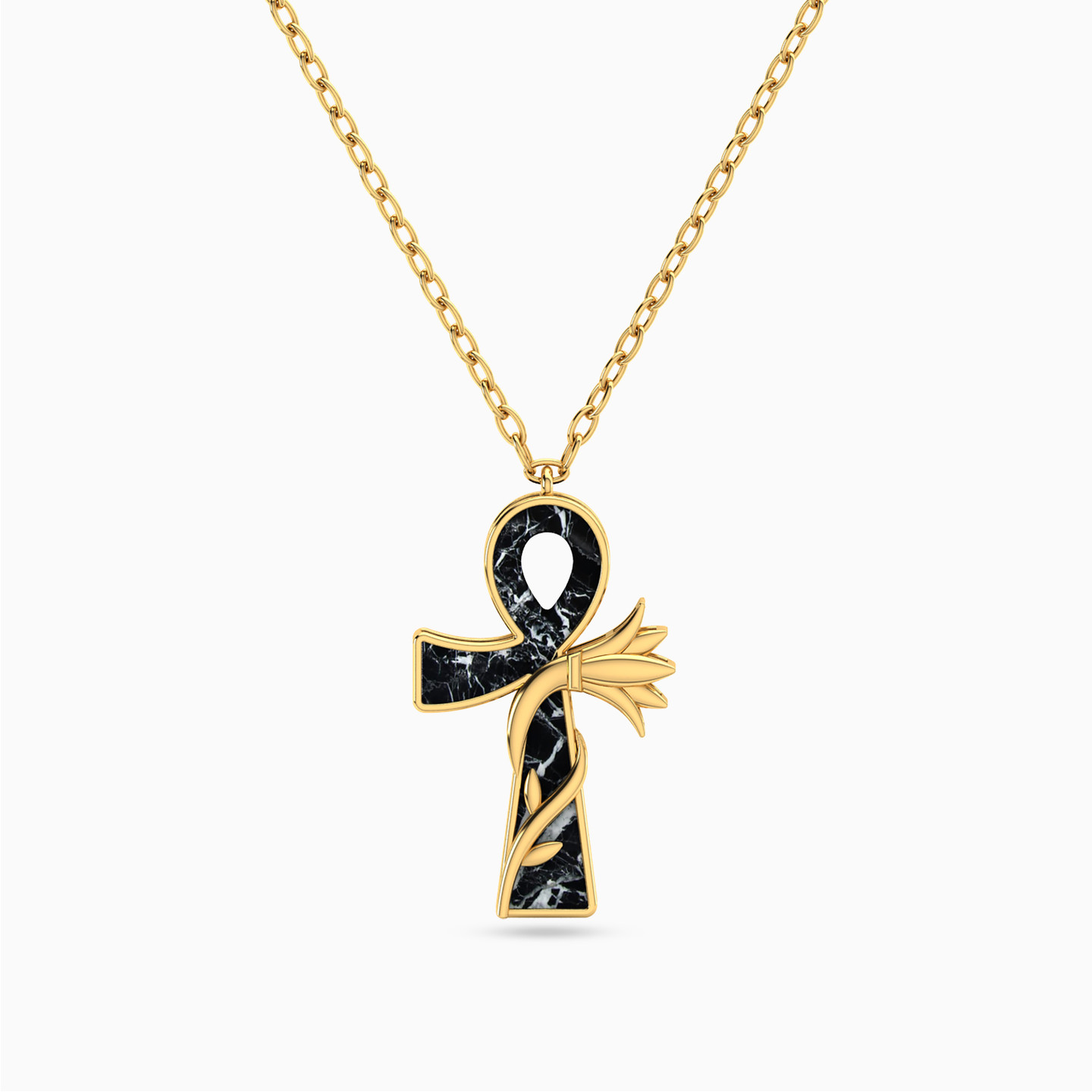 Add a classy touch to your wardrobe with a modern Ankh vine pendant necklace from L'azurde Instyle. Shimmering in 18-karat yellow gold with a marble like black and white stone, this sophisticated Ankh pendant is a beautiful symbol of everlasting life. We recommend wearing this piece solo as it shines beautifully all on its own.