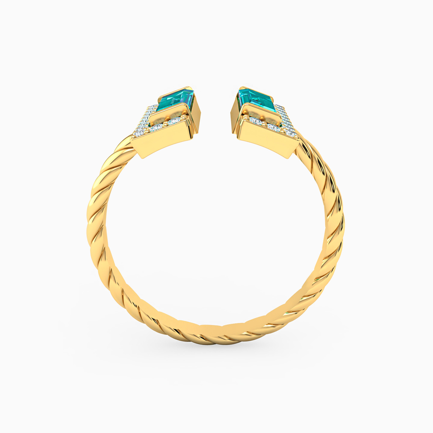 Show your individuality with this lovely statement ring from L'azurde Gold. Beautifully crafted in warm 18-karat yellow gold with a twisted rope band, this stunning ring captivates with two gorgeous turquoise baguette-shaped stones framed with dazzling round accents for additional glamour. We suggest adding this ring to your wardrobe when you want to capture attention with a pop of color and style.