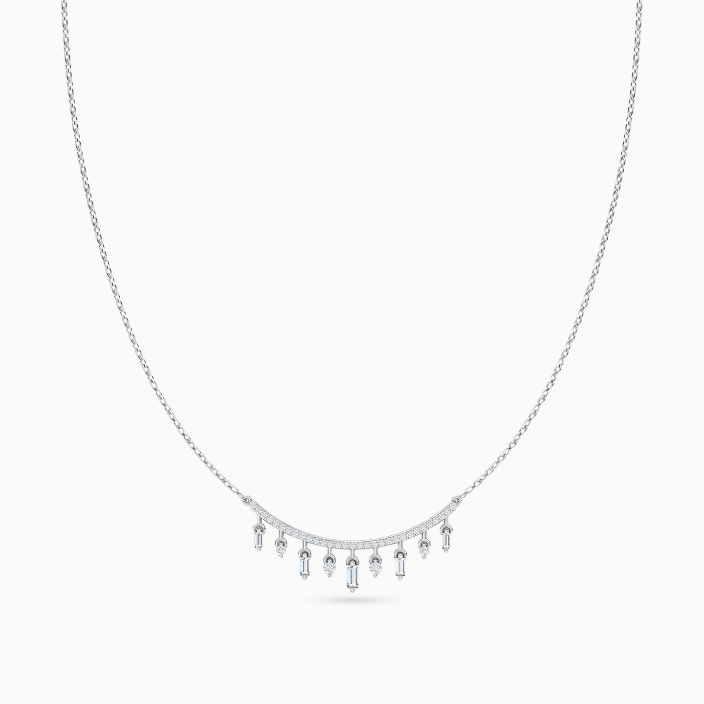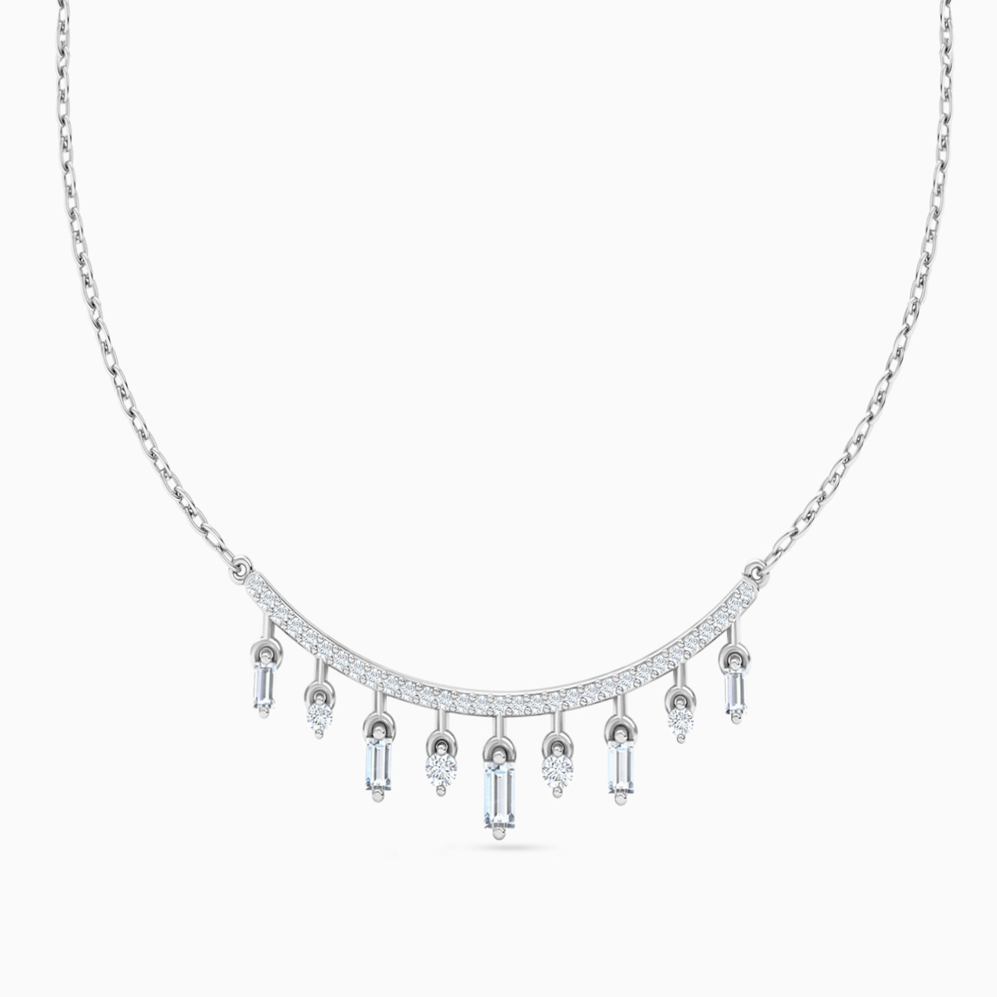 Set new trends with a simply stunning charm necklace from L'azurde Diamonds that showcases a one-of-a-kind design. This eye-catching 18-karat white gold piece is simply sophisticated with a rounded diamond bar featuring brilliant and baguette cut diamonds held in unique vertical settings. Sparkling with diamond dazzle, this chic necklace adds a modern touch to any ensemble.