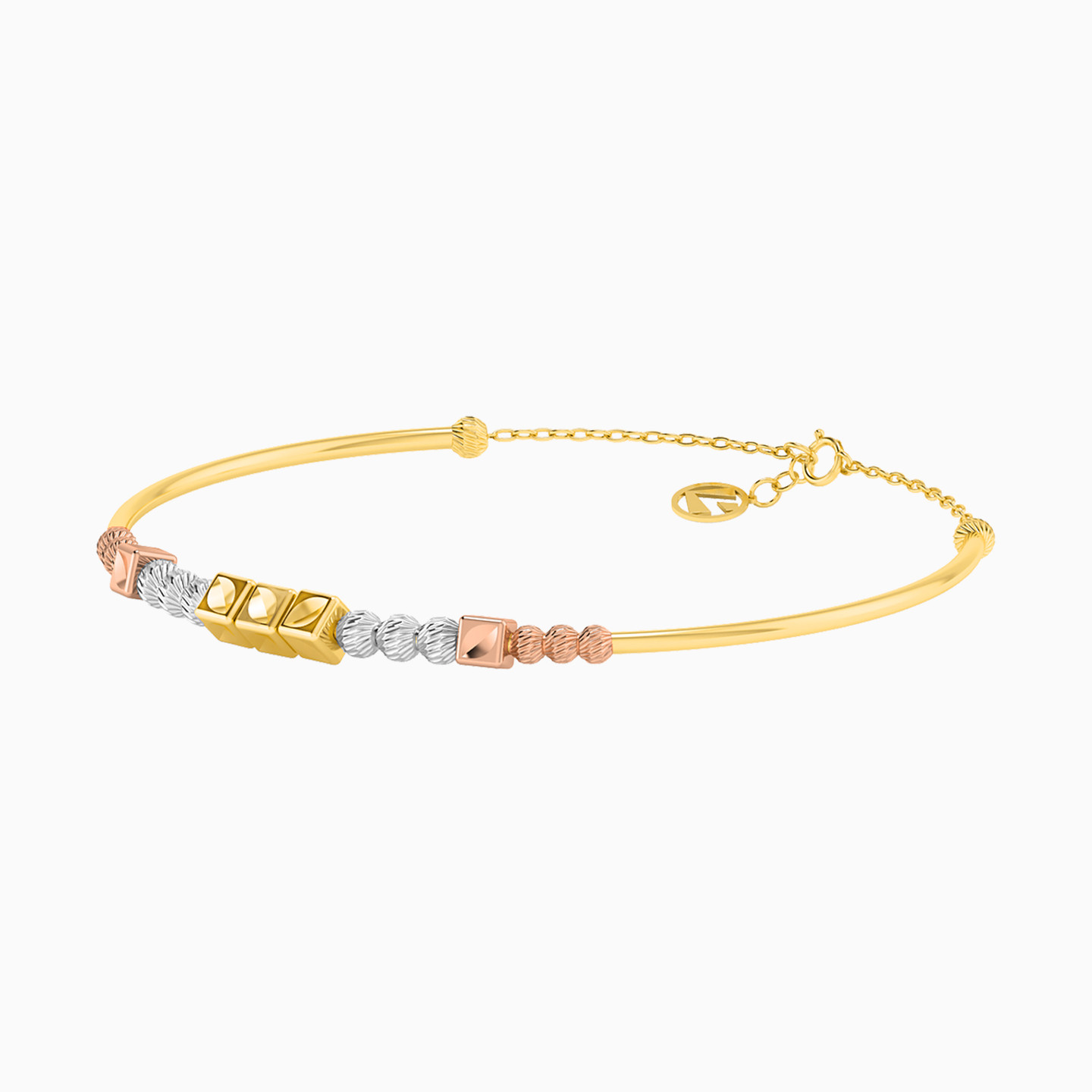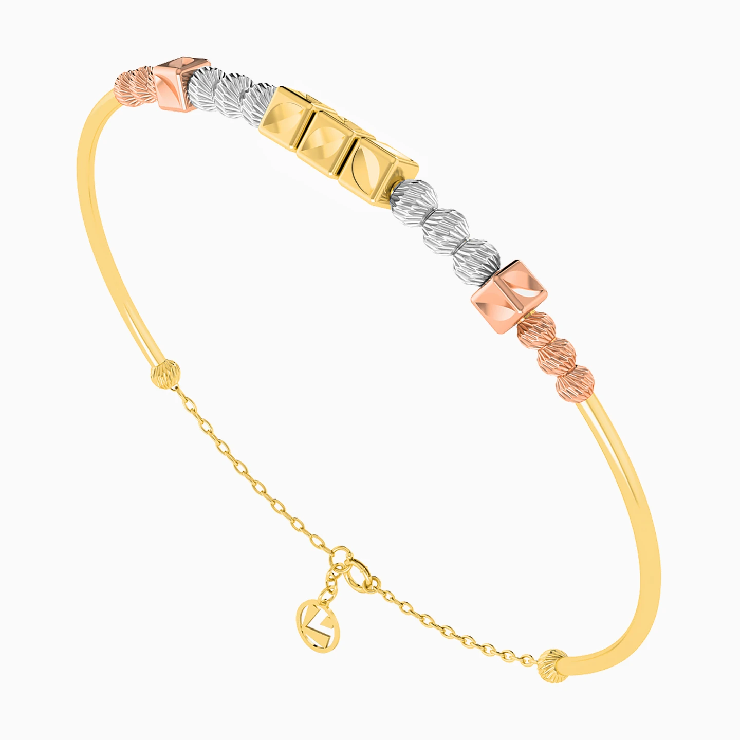 Add a layer of style to your accessories with this sophisticated bangle bracelet from L'azurde Gold. Beautifully crafted in a mix of 18-karat white, yellow, and rose gold round and square beads, this eye-catching bracelet is a mesmerizing contrast of shapes and colors. We suggest incorporating this piece into your everyday jewelry collection to add a charming feminine touch to your casual or dressy looks.